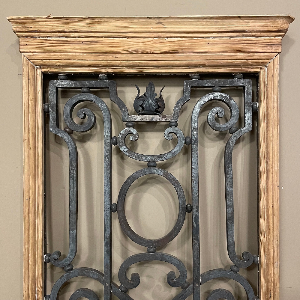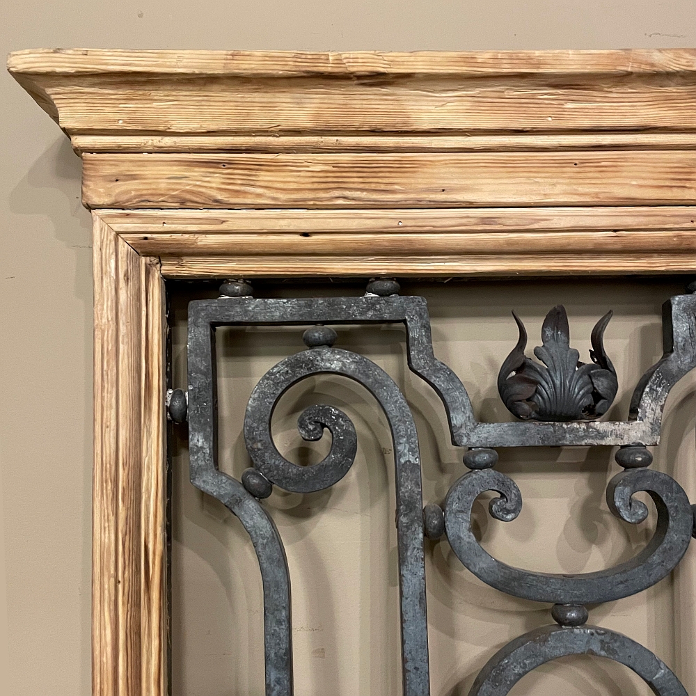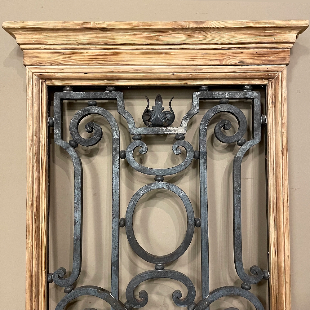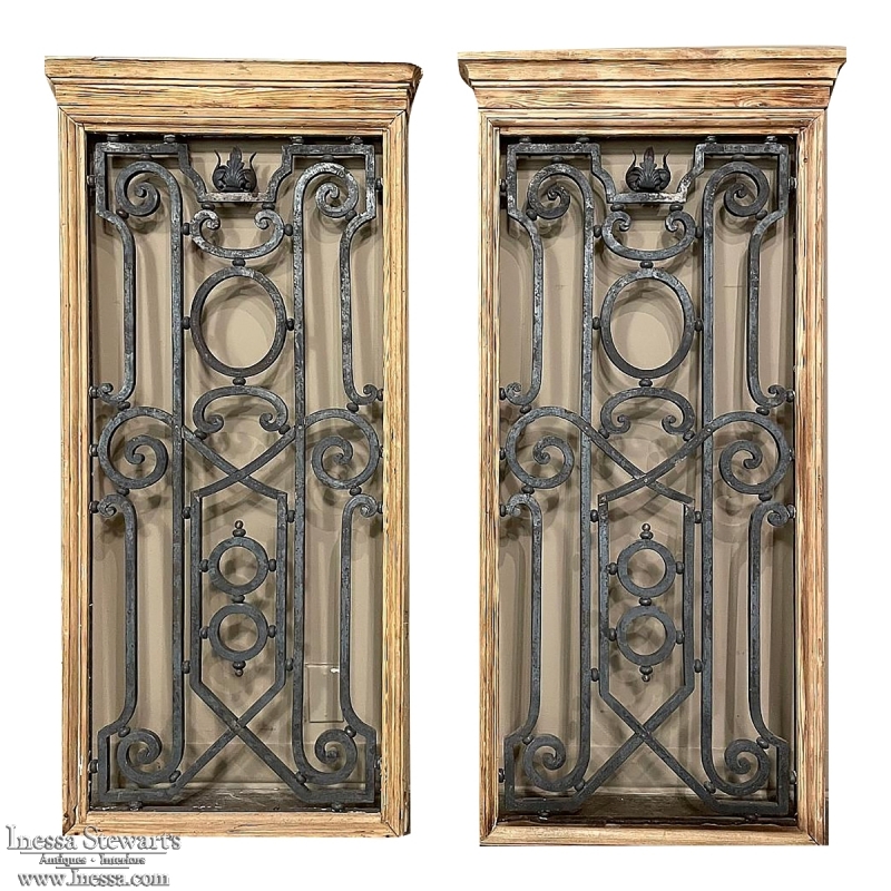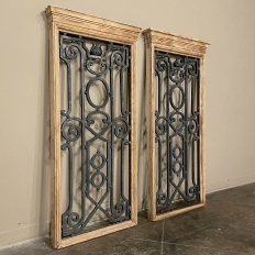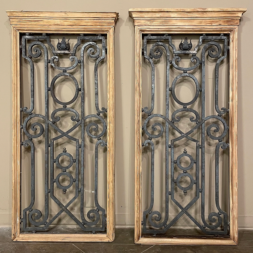 Pair Mid-19th Century French Hand-Forged Wrought Iron Framed Panels were painstakingly crafted by an obviously talented metal smith out of red-hot iron to create an artistic window accent that also happens to be exceedingly secure! Hand-forged during the Napoleon III Period which was the beginning of the heydays of the Belle Epoque, each panel is constructed using rivets which is difficult, tedious, and requires considerable skill, but results in a finished work that literally transcends time itself! The classically-inspired architecture of the works are undeniable, as is the subtle French touch in the elegant scrollwork and curvatures. Each is mounted in its original solid pine framework, and because they are hand-forged, are very slightly different in size which is only immediately apparent when they're placed right next to each other. Perfect for adding a timeless Old World touch to your interior or exterior decor!