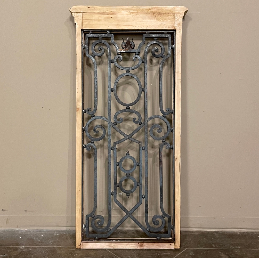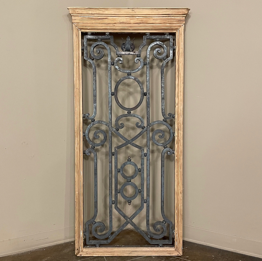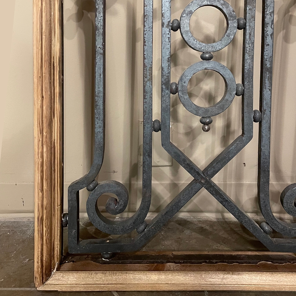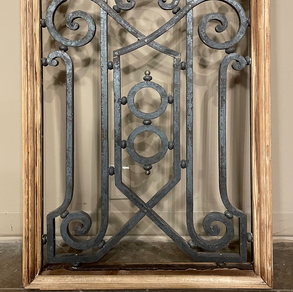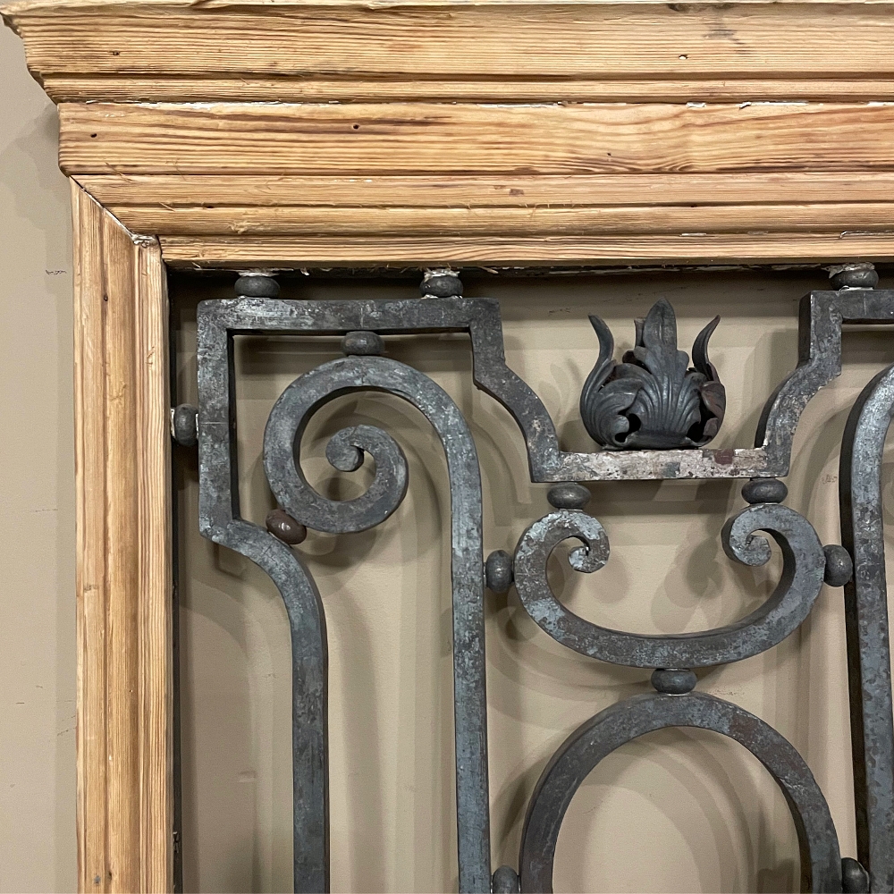 Pair Mid-19th Century French Hand-Forged Wrought Iron Framed Panels were painstakingly crafted by an obviously talented metal smith out of red-hot iron to create an artistic window accent that also happens to be exceedingly secure! Hand-forged during the Napoleon III Period which was the beginning of the heydays of the Belle Epoque, each panel is constructed using rivets which is difficult, tedious, and requires considerable skill, but results in a finished work that literally transcends time itself! The classically-inspired architecture of the works are undeniable, as is the subtle French touch in the elegant scrollwork and curvatures. Each is mounted in its original solid pine framework, and because they are hand-forged, are very slightly different in size which is only immediately apparent when they're placed right next to each other. Perfect for adding a timeless Old World touch to your interior or exterior decor!
