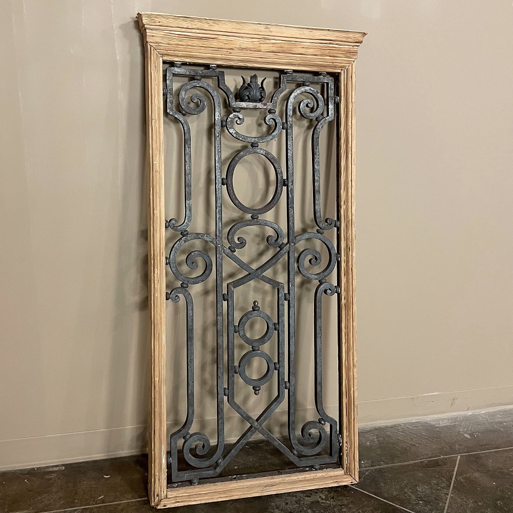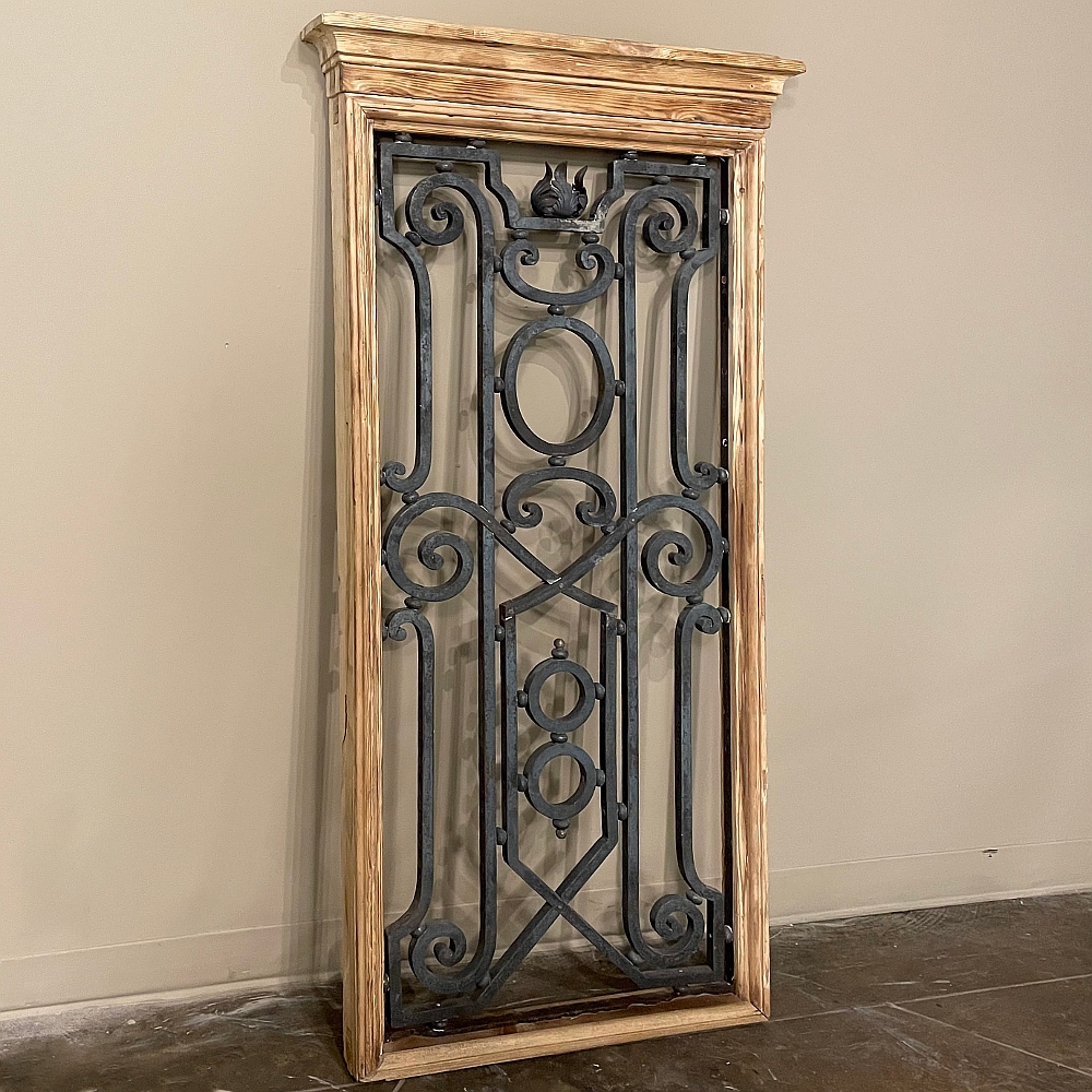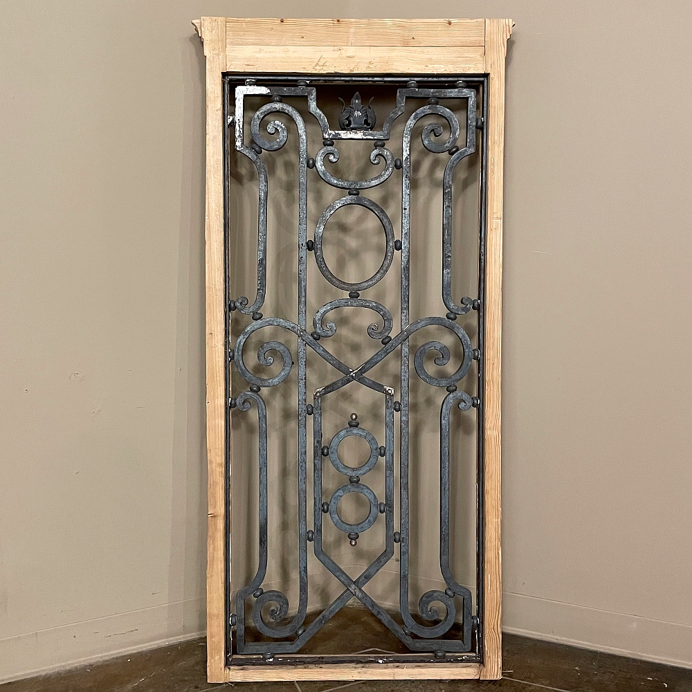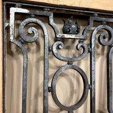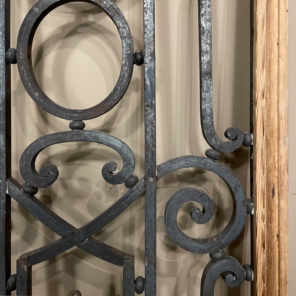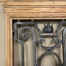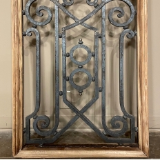 Pair Mid-19th Century French Hand-Forged Wrought Iron Framed Panels were painstakingly crafted by an obviously talented metal smith out of red-hot iron to create an artistic window accent that also happens to be exceedingly secure! Hand-forged during the Napoleon III Period which was the beginning of the heydays of the Belle Epoque, each panel is constructed using rivets which is difficult, tedious, and requires considerable skill, but results in a finished work that literally transcends time itself! The classically-inspired architecture of the works are undeniable, as is the subtle French touch in the elegant scrollwork and curvatures. Each is mounted in its original solid pine framework, and because they are hand-forged, are very slightly different in size which is only immediately apparent when they're placed right next to each other. Perfect for adding a timeless Old World touch to your interior or exterior decor!