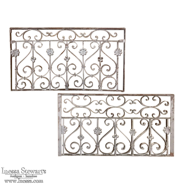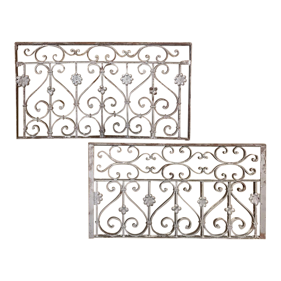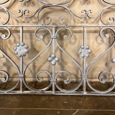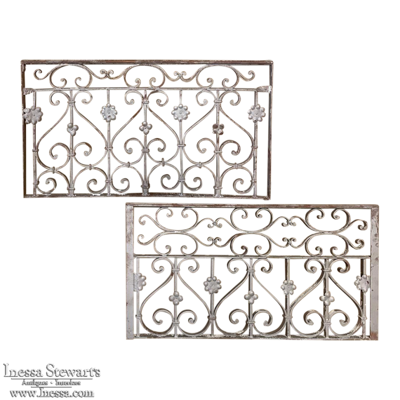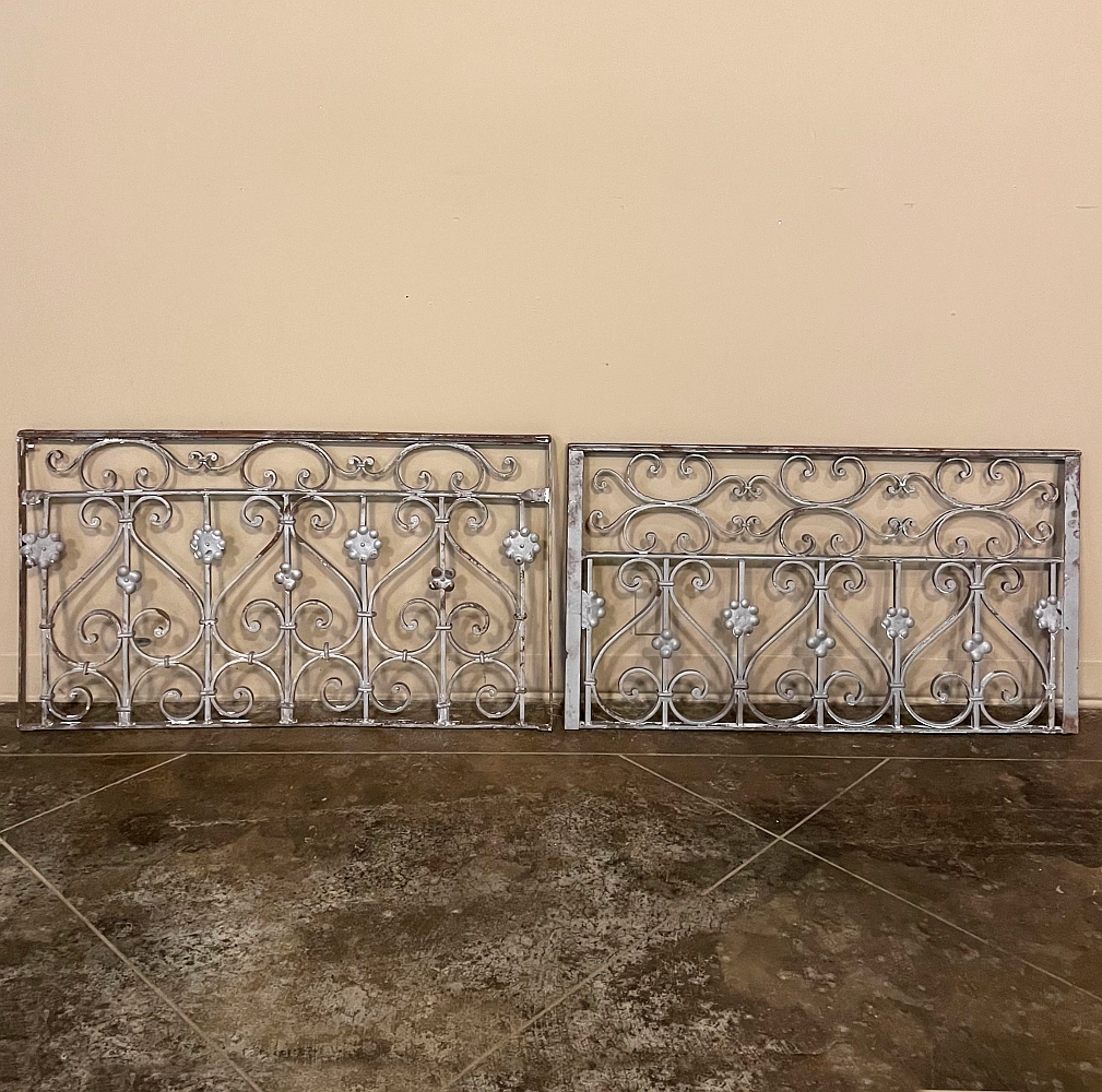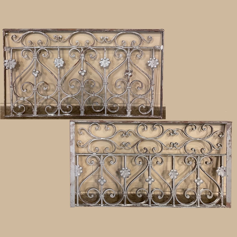 Set of 19th Century French Wrought Iron Balustrades ~ Window Guards were designed to beautify the exterior as well as provide a safeguard railing to the low-hung windows in vogue at the time. This pair were designed to be very complementary but not identical, probably appearing on different walls of the same home. The classic French scrolls with stamped flower motifs create a pleasing visual appeal that was designed to enhance the exterior architecture. Over the past three decades such items we've sold have been utilized in some pretty imaginative ways, but they're still excellent for their original intended purpose!