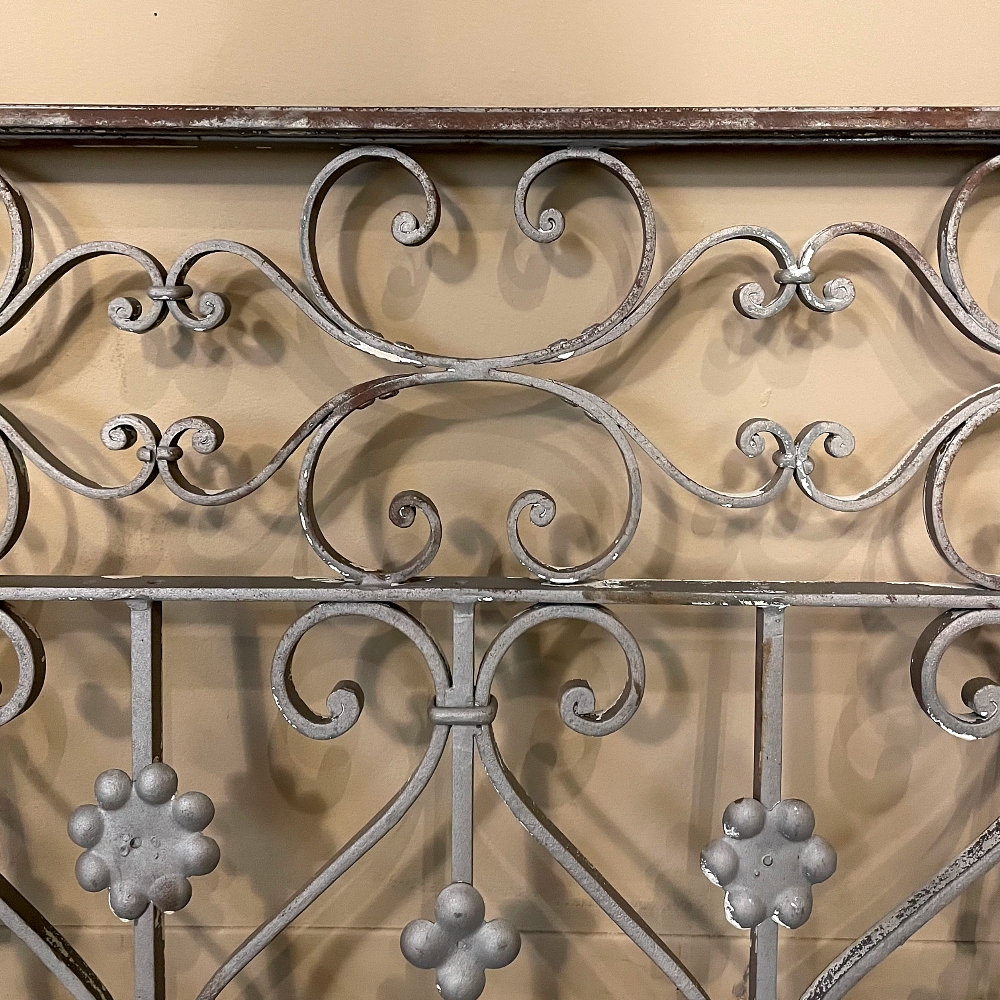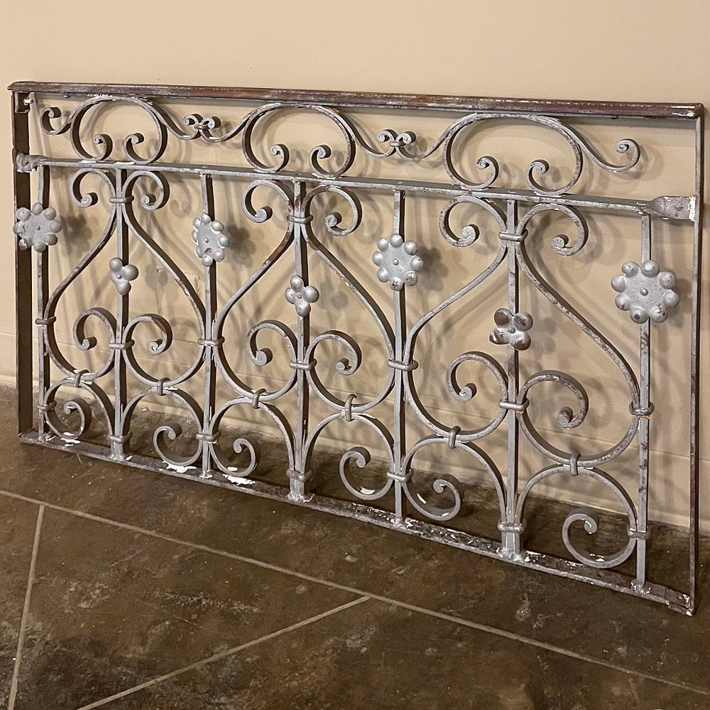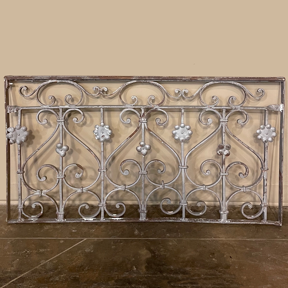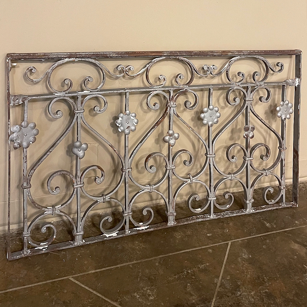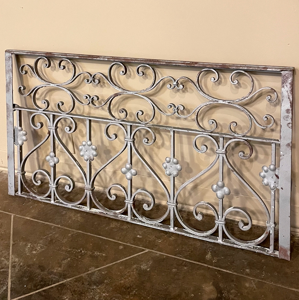 Set of 19th Century French Wrought Iron Balustrades ~ Window Guards were designed to beautify the exterior as well as provide a safeguard railing to the low-hung windows in vogue at the time. This pair were designed to be very complementary but not identical, probably appearing on different walls of the same home. The classic French scrolls with stamped flower motifs create a pleasing visual appeal that was designed to enhance the exterior architecture. Over the past three decades such items we've sold have been utilized in some pretty imaginative ways, but they're still excellent for their original intended purpose!