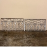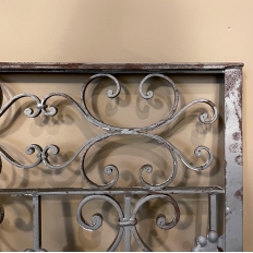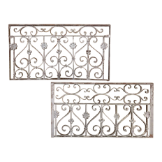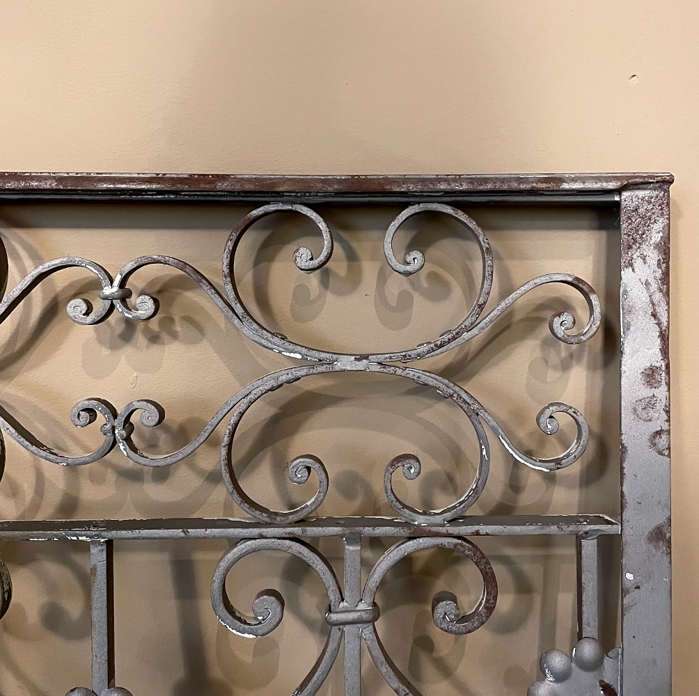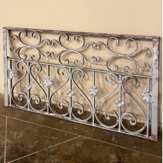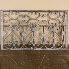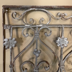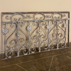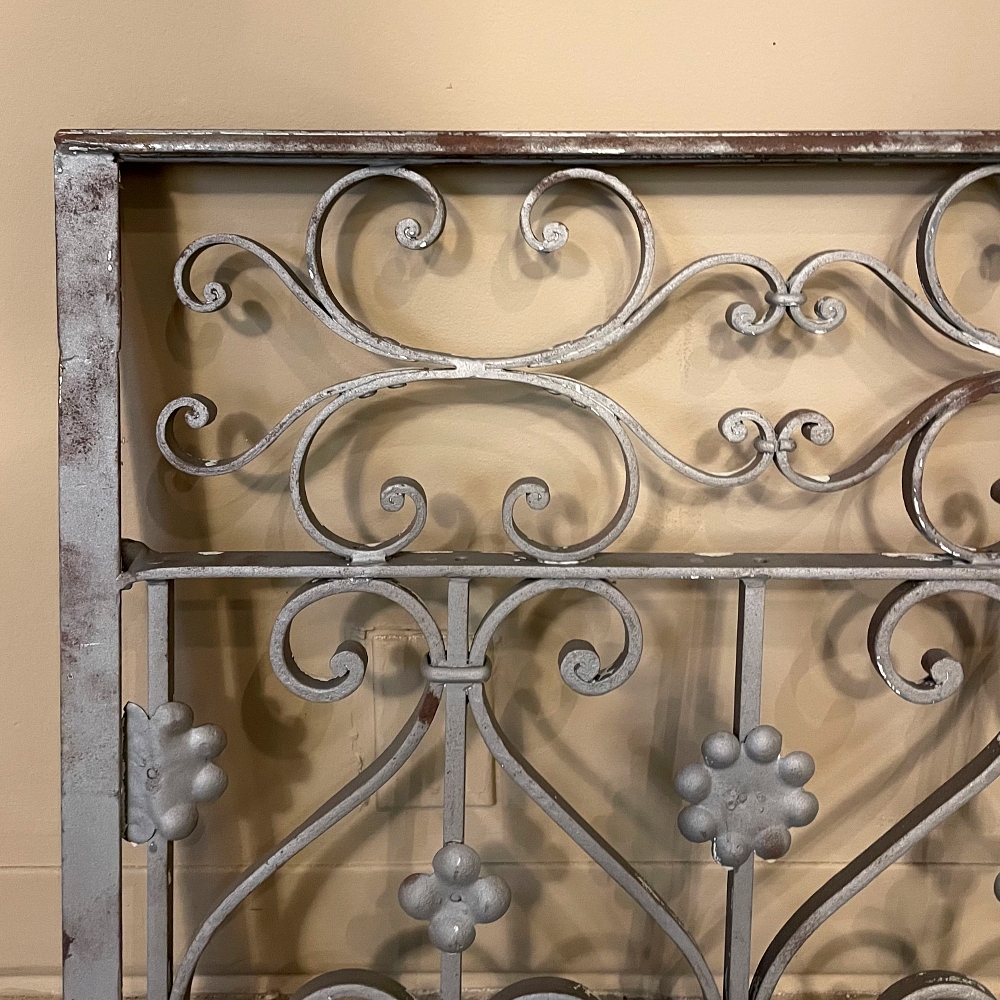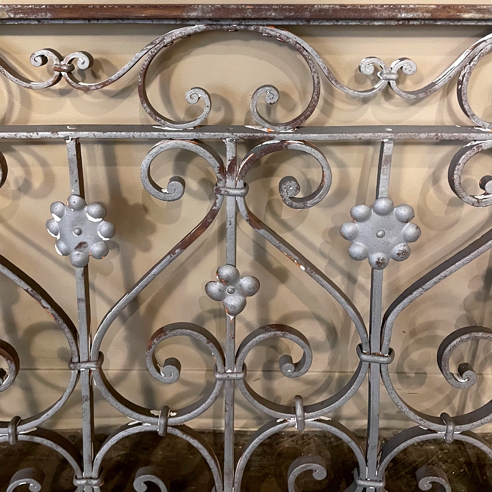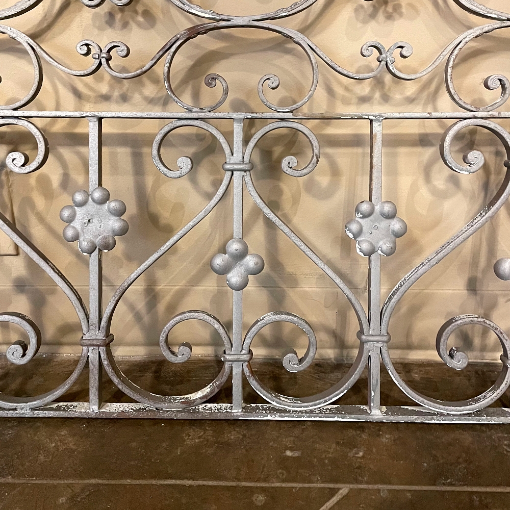 Set of 19th Century French Wrought Iron Balustrades ~ Window Guards were designed to beautify the exterior as well as provide a safeguard railing to the low-hung windows in vogue at the time. This pair were designed to be very complementary but not identical, probably appearing on different walls of the same home. The classic French scrolls with stamped flower motifs create a pleasing visual appeal that was designed to enhance the exterior architecture. Over the past three decades such items we've sold have been utilized in some pretty imaginative ways, but they're still excellent for their original intended purpose!