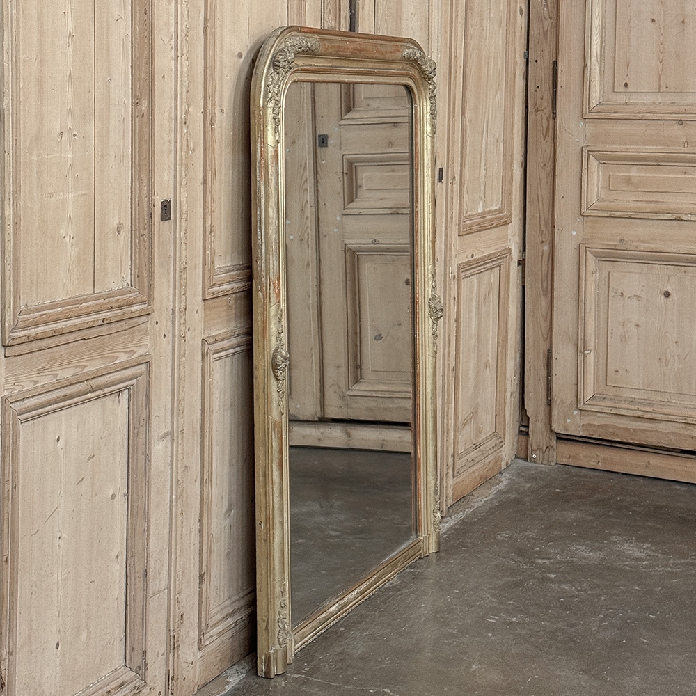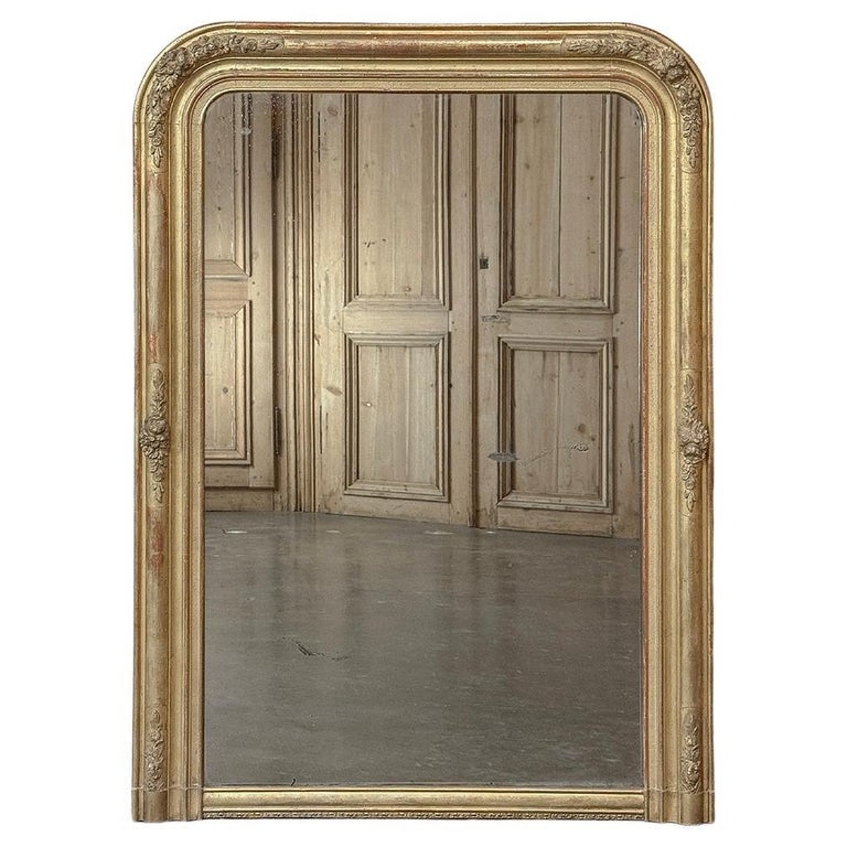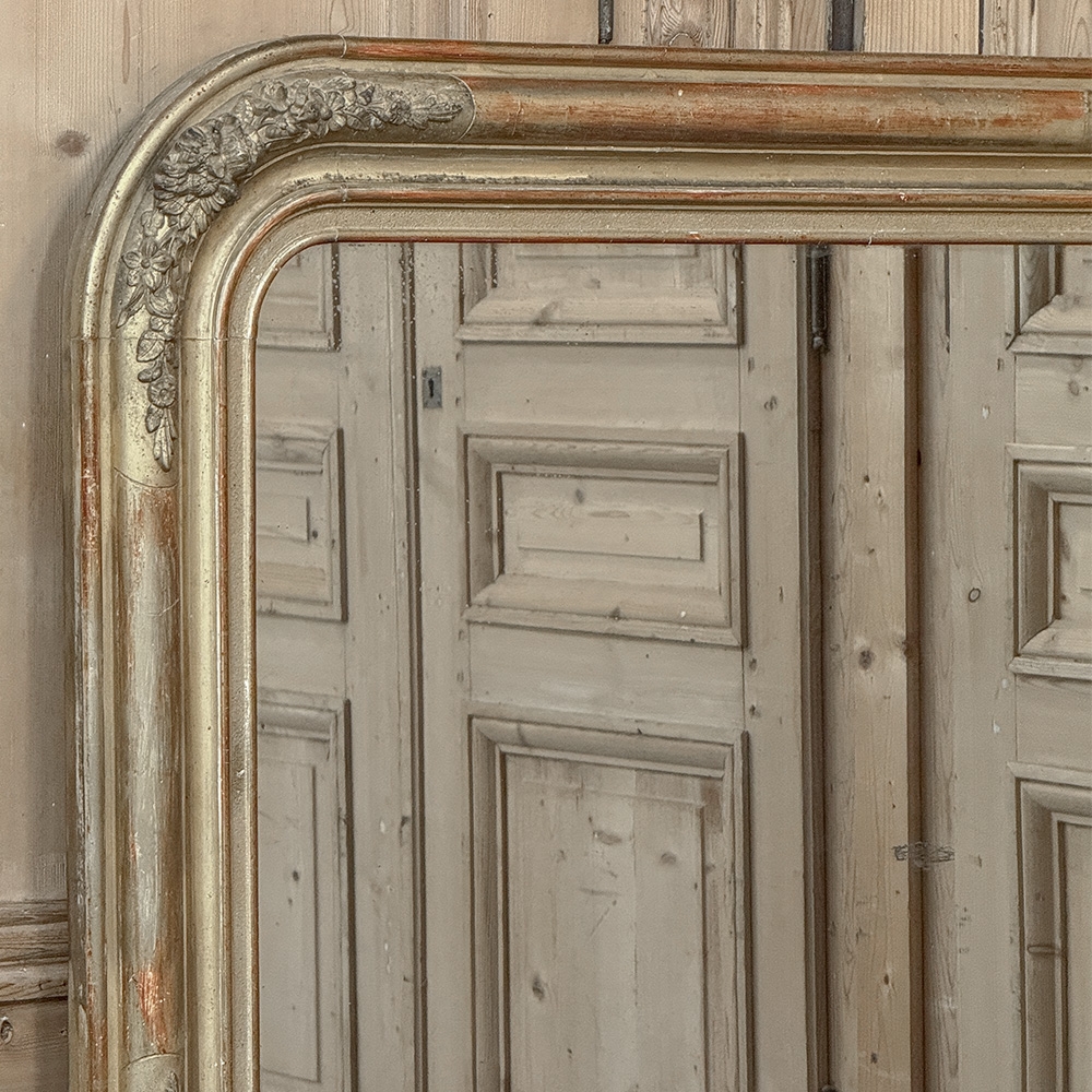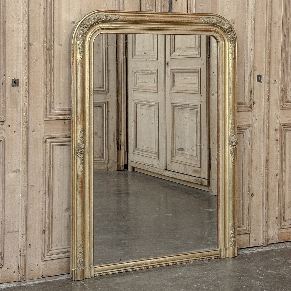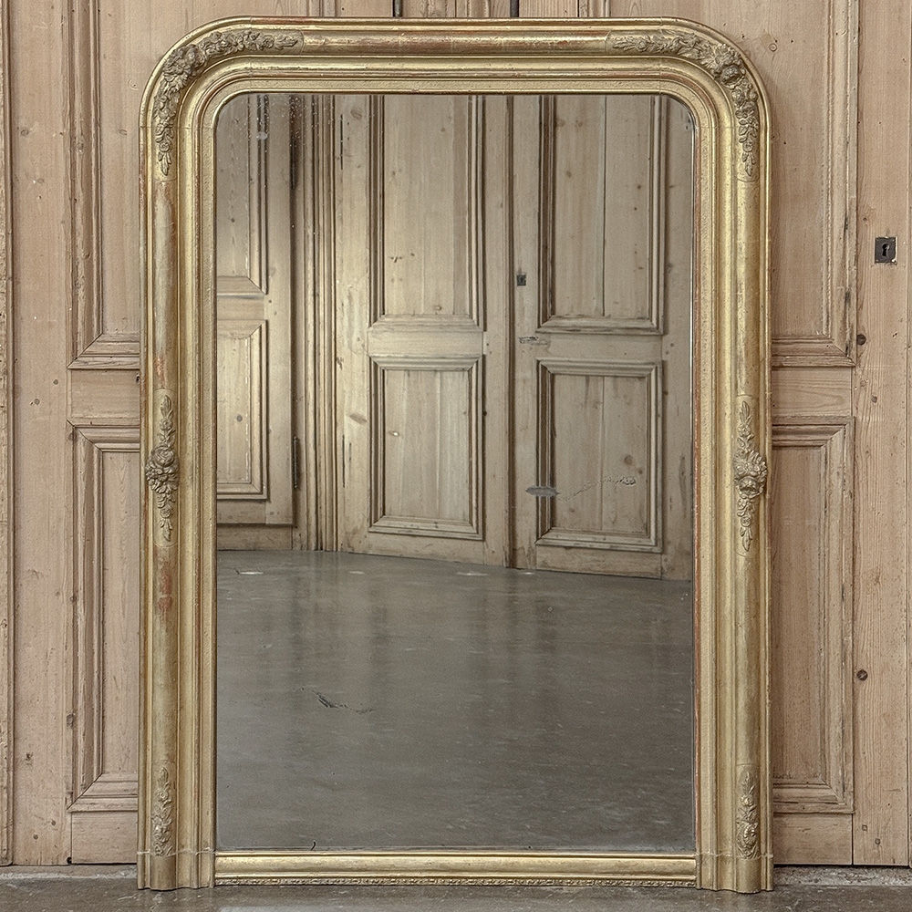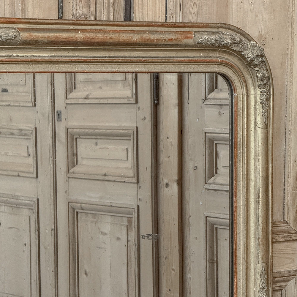 19th Century French Louis Philippe Gilded Mantel Mirror features a flair in detail that began to appear at the end of the period towards the beginnings of what today is called the Napoleon III period. Although the architecture is the same as we see during Louis Philippe's reign, additional detail has been added to embellish the top shoulders and the halfway point up from the bottom. The embellishment depicts floral sprays with foliates in fine relief. The multi-tiered bordering shows vestiges of the original gold leaf finish, and the subtly complex tiers beautifully frame the original mirror which shows wonderful signs of aging that add so much history and character. The original backing that protects the silvering on the mirror is also mostly intact. What an incredible find!