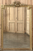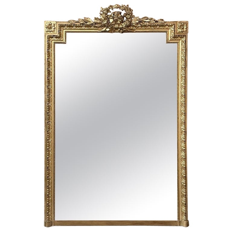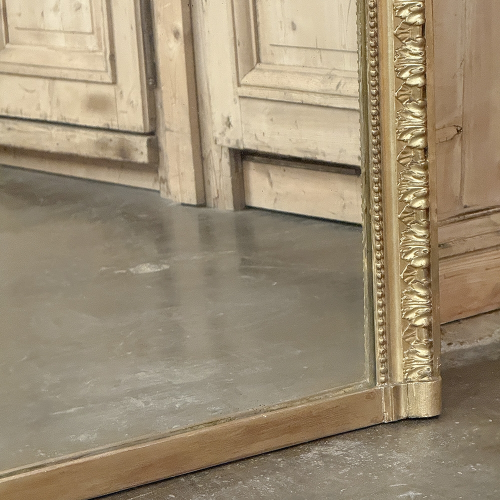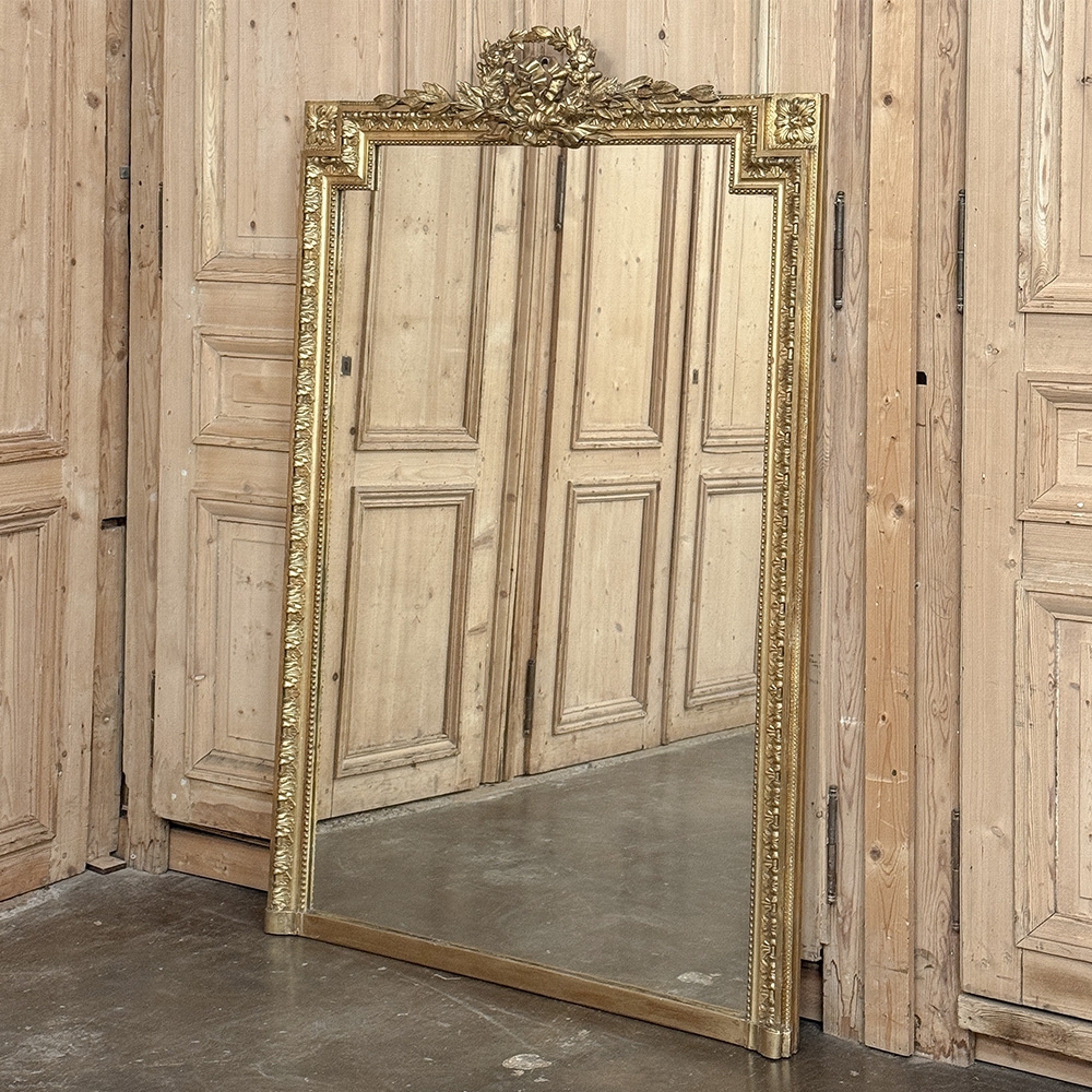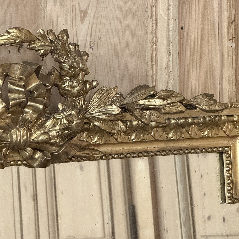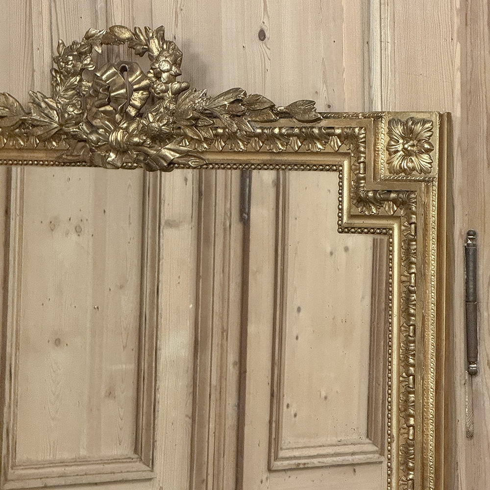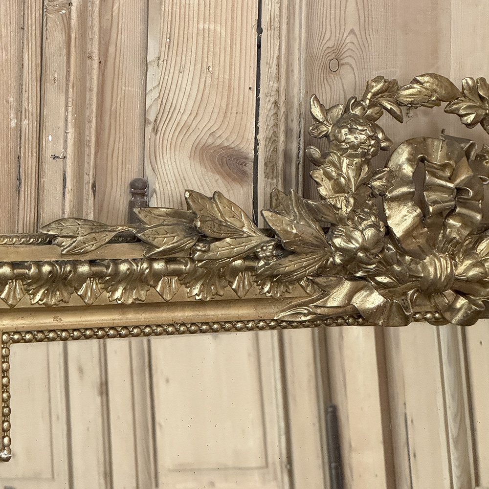19th Century French Louis XVI Gilded Mantel Mirror is a definitive example of the neoclassical style revived in the 18th century by King Louis XVI and his name has since been synonymous with the genre. Hand-crafted with great detail on all three sides, with a relatively plain base framing designed to go atop a buffet, mantel or fireplace, for examples, the decorative frame consists of three separate molding tiers each enhanced with its own design, from Greek coin to foliate pattern to beading, the latter of which is immediately adjacent to the generously sized mirror itself. Such a design was designed to amplify ambient light and provide a lovely reflection of the rest of the room. On top, we see the timeless floral wreath "tied" with ribbons and fitted with laurel sprays leading the eye to the notched out upper shoulder corners adorned with rosettes.
