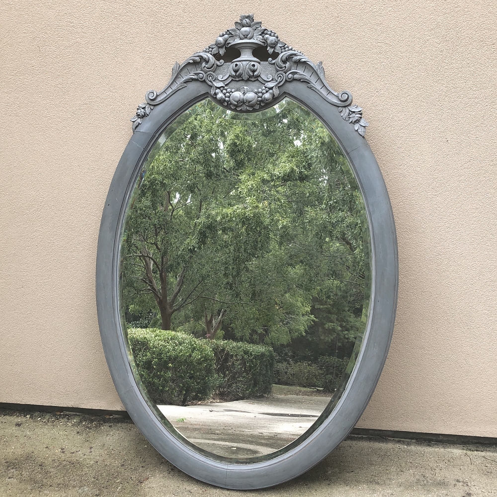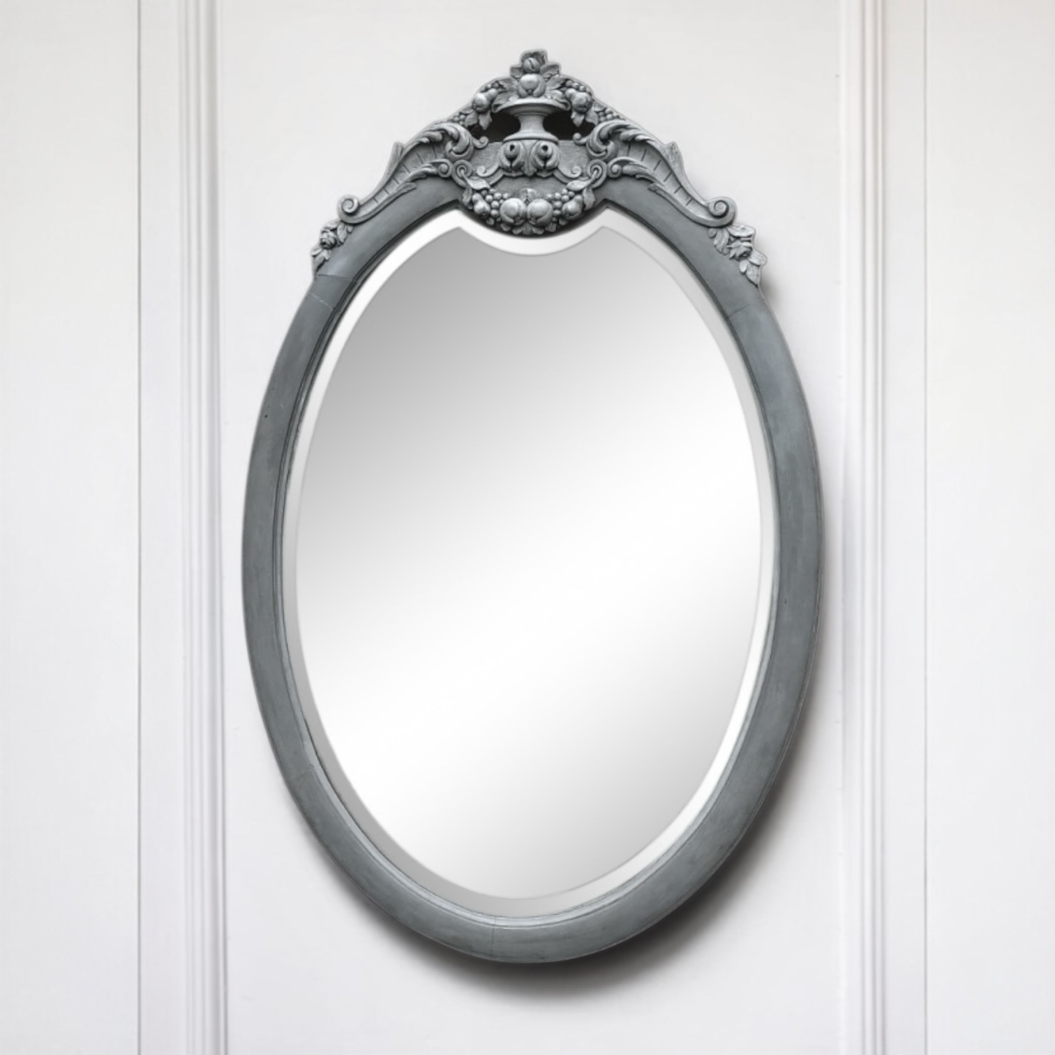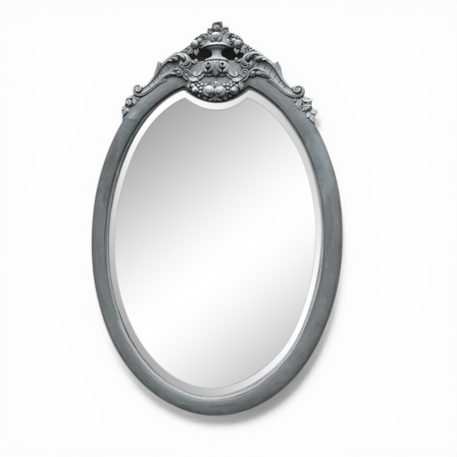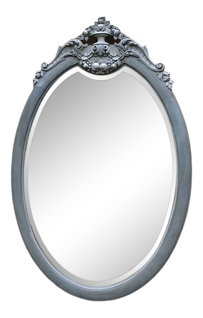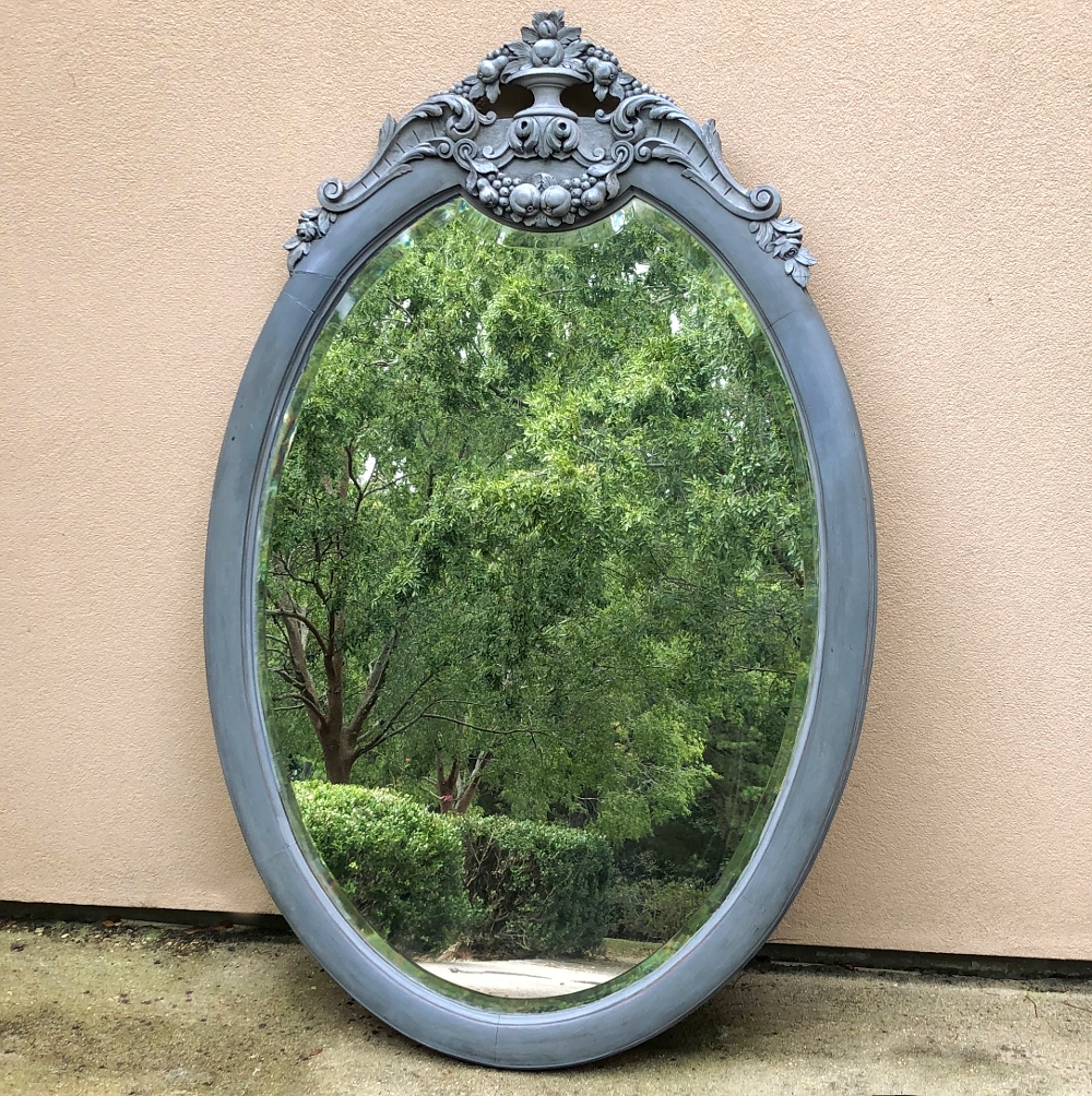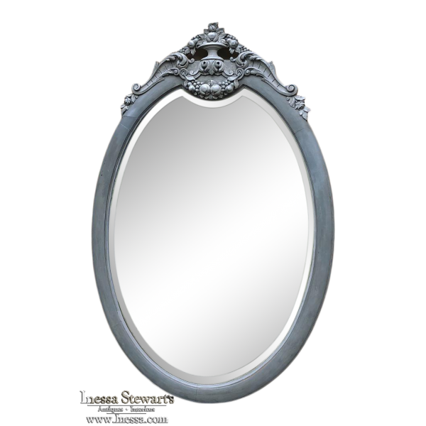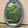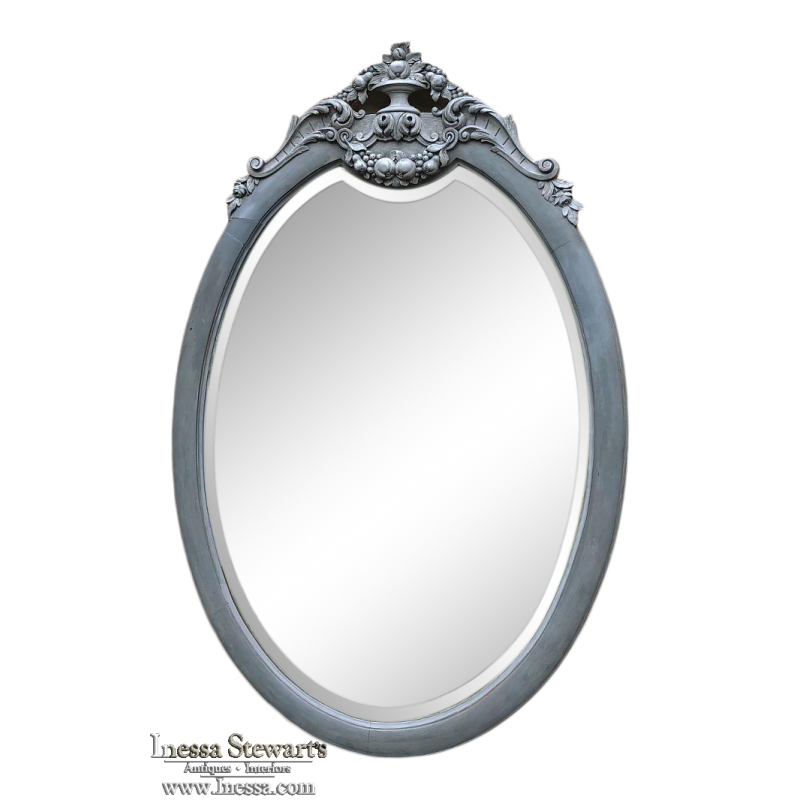 SaleFINAL SALE ~ 19th Century French Louis XVI Oval Painted Mirror represent the essence of the classical style, with a graceful oval form unencumbered with adornment on the sides and base, but lavished with a magnificent urn bursting with fruit and foliates centered on the crown. The urn is upheld by an acanthus plume base and flanked by scrollwork and acanthus fronds. Below that in a reverse radius appears a garland of fresh fruit, representing the bounty of the earth. The original beveled mirror survives, and its bevel follows the contours of the oval frame and the reverse radius at the top. Lovely painted finish in a neutral medium gray has achieved a lovely patina.