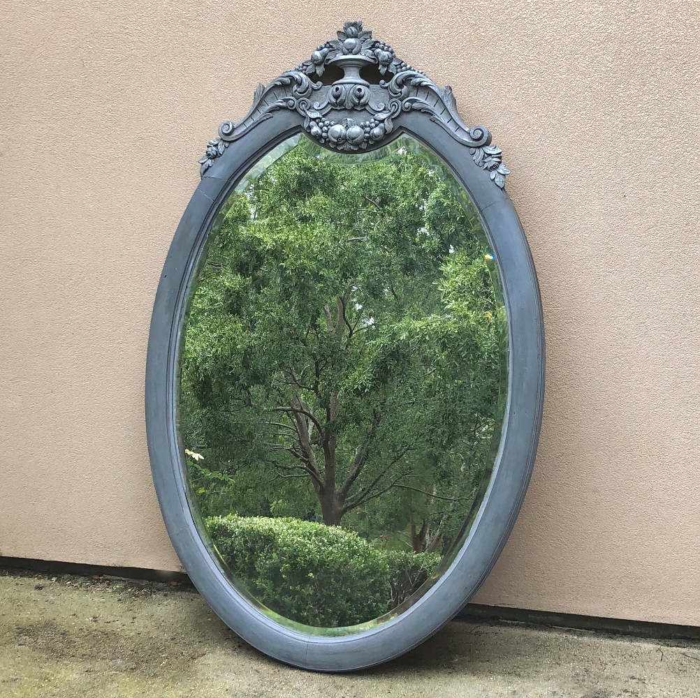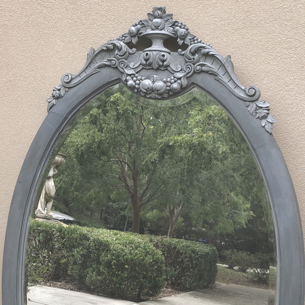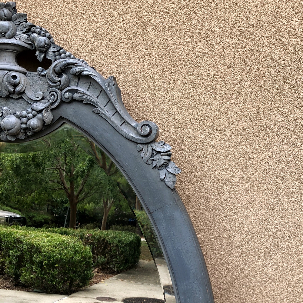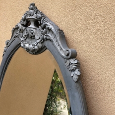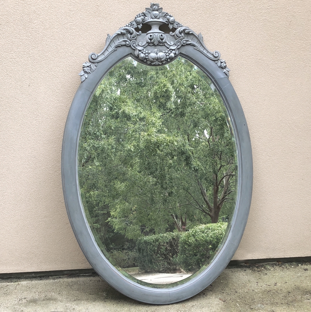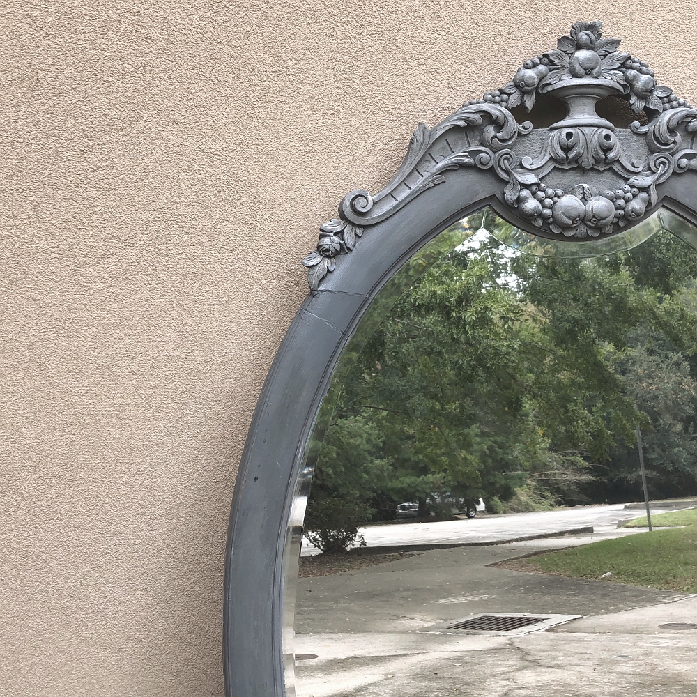 SaleFINAL SALE ~ 19th Century French Louis XVI Oval Painted Mirror represent the essence of the classical style, with a graceful oval form unencumbered with adornment on the sides and base, but lavished with a magnificent urn bursting with fruit and foliates centered on the crown. The urn is upheld by an acanthus plume base and flanked by scrollwork and acanthus fronds. Below that in a reverse radius appears a garland of fresh fruit, representing the bounty of the earth. The original beveled mirror survives, and its bevel follows the contours of the oval frame and the reverse radius at the top. Lovely painted finish in a neutral medium gray has achieved a lovely patina.