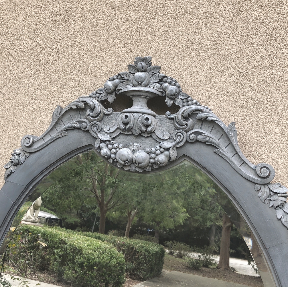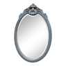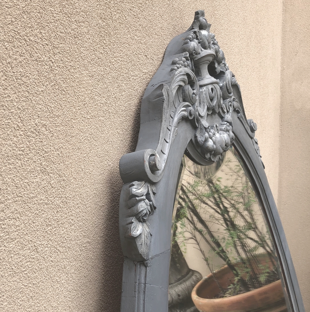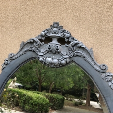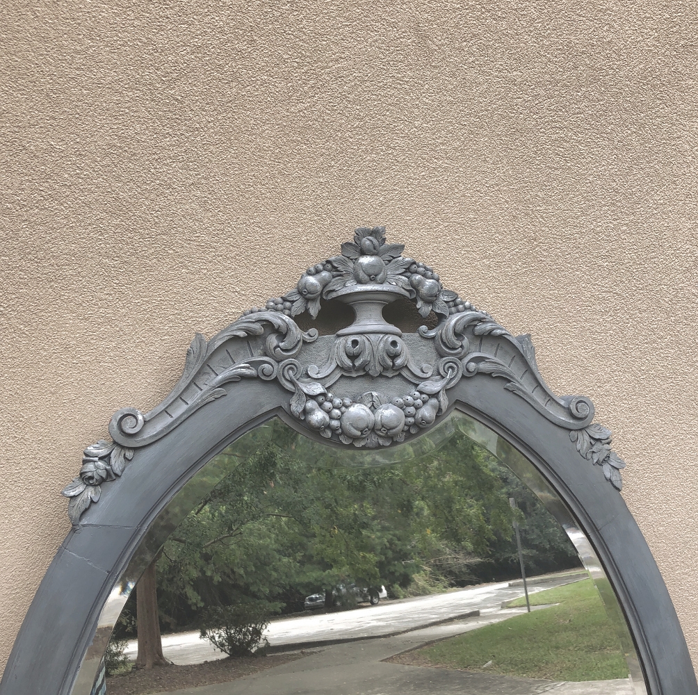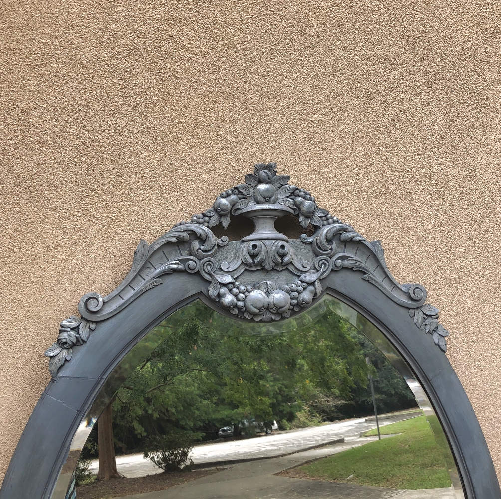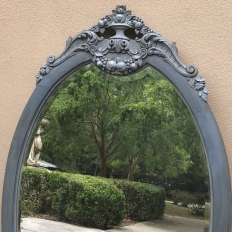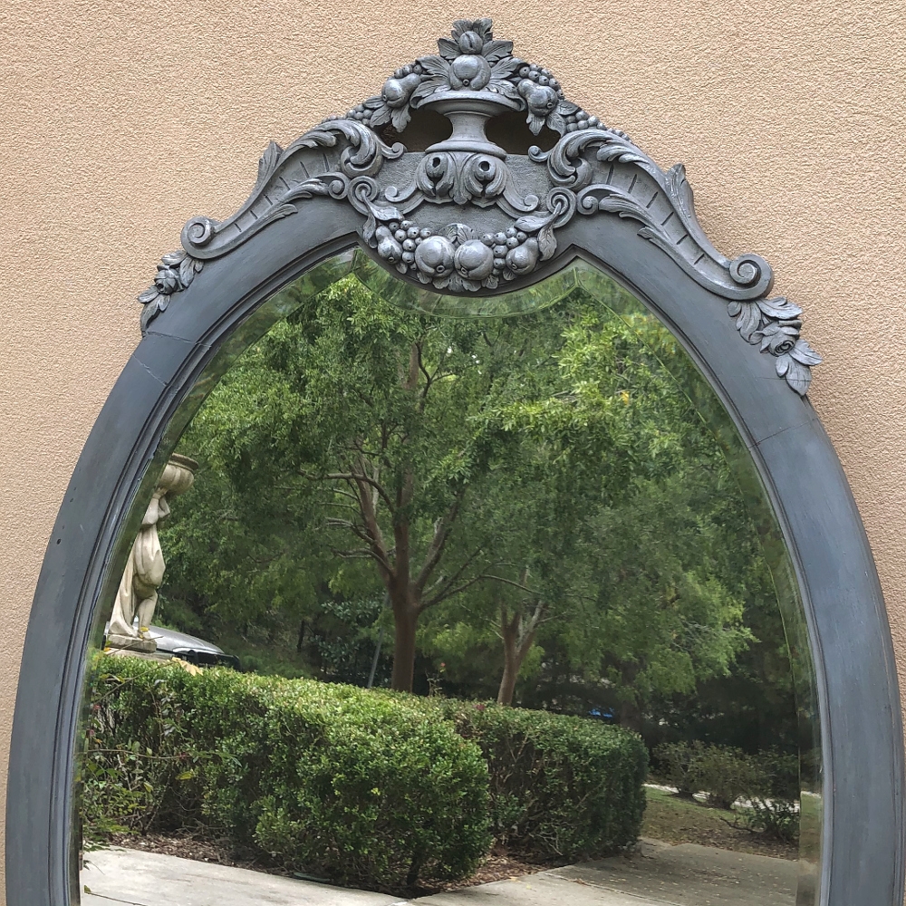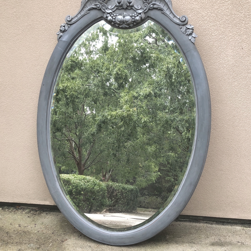 SaleFINAL SALE ~ 19th Century French Louis XVI Oval Painted Mirror represent the essence of the classical style, with a graceful oval form unencumbered with adornment on the sides and base, but lavished with a magnificent urn bursting with fruit and foliates centered on the crown. The urn is upheld by an acanthus plume base and flanked by scrollwork and acanthus fronds. Below that in a reverse radius appears a garland of fresh fruit, representing the bounty of the earth. The original beveled mirror survives, and its bevel follows the contours of the oval frame and the reverse radius at the top. Lovely painted finish in a neutral medium gray has achieved a lovely patina.