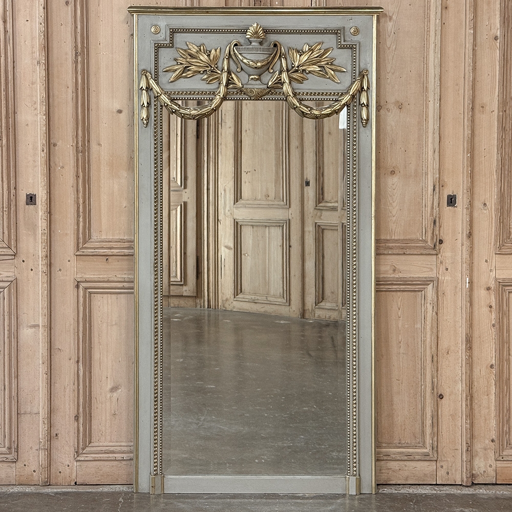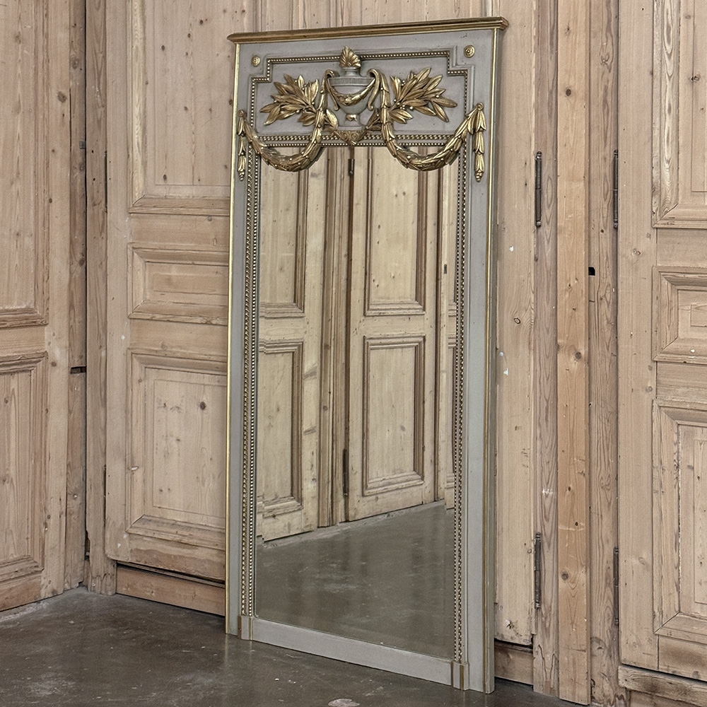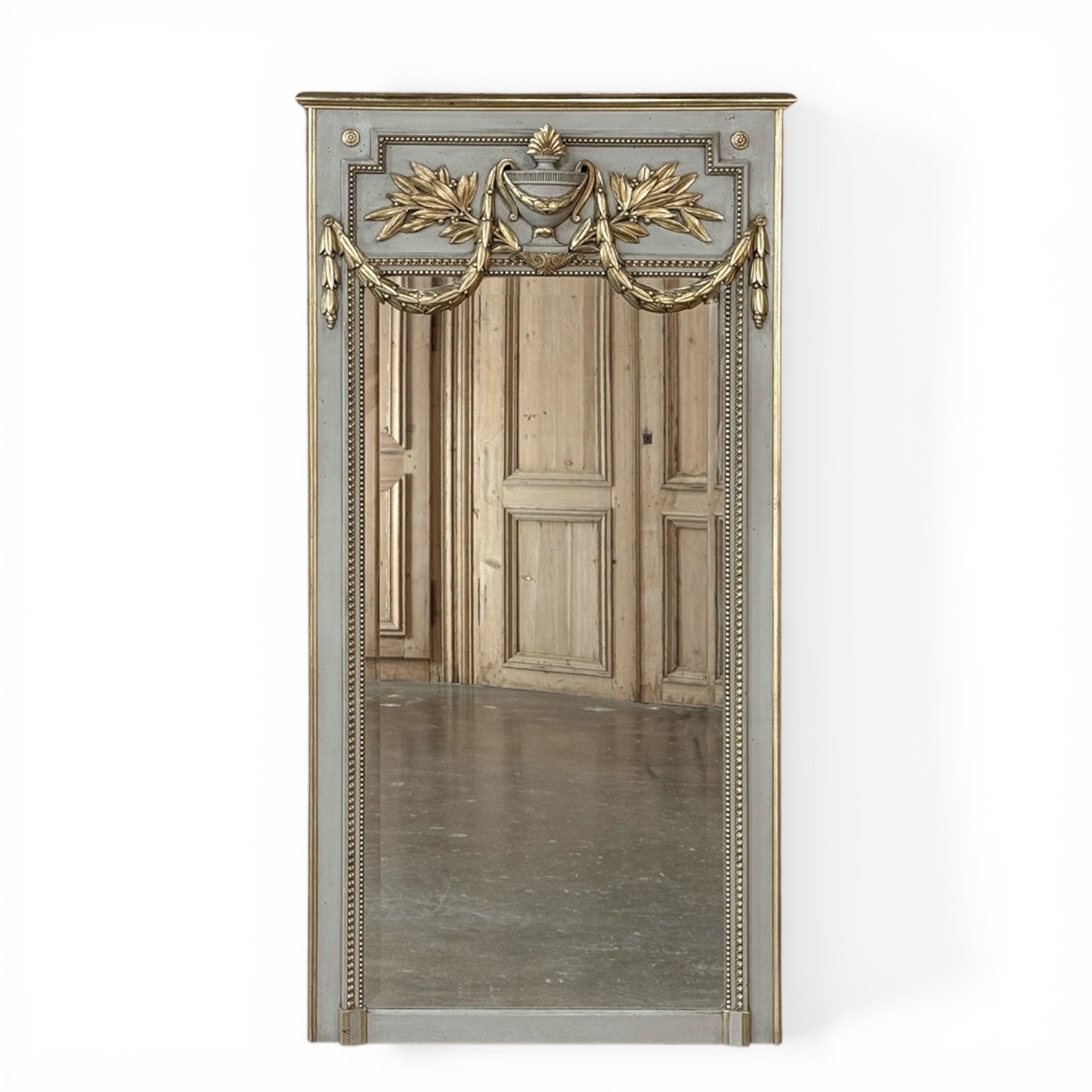 19th Century French Louis XVI Painted and Gilded Trumeau Mirror is an elegant in its restraint yet rich in classical detail and captures the refined spirit of the neoclassical style that defined late-18th century Parisian interiors and continued to inspire cabinetmakers well into the following century.