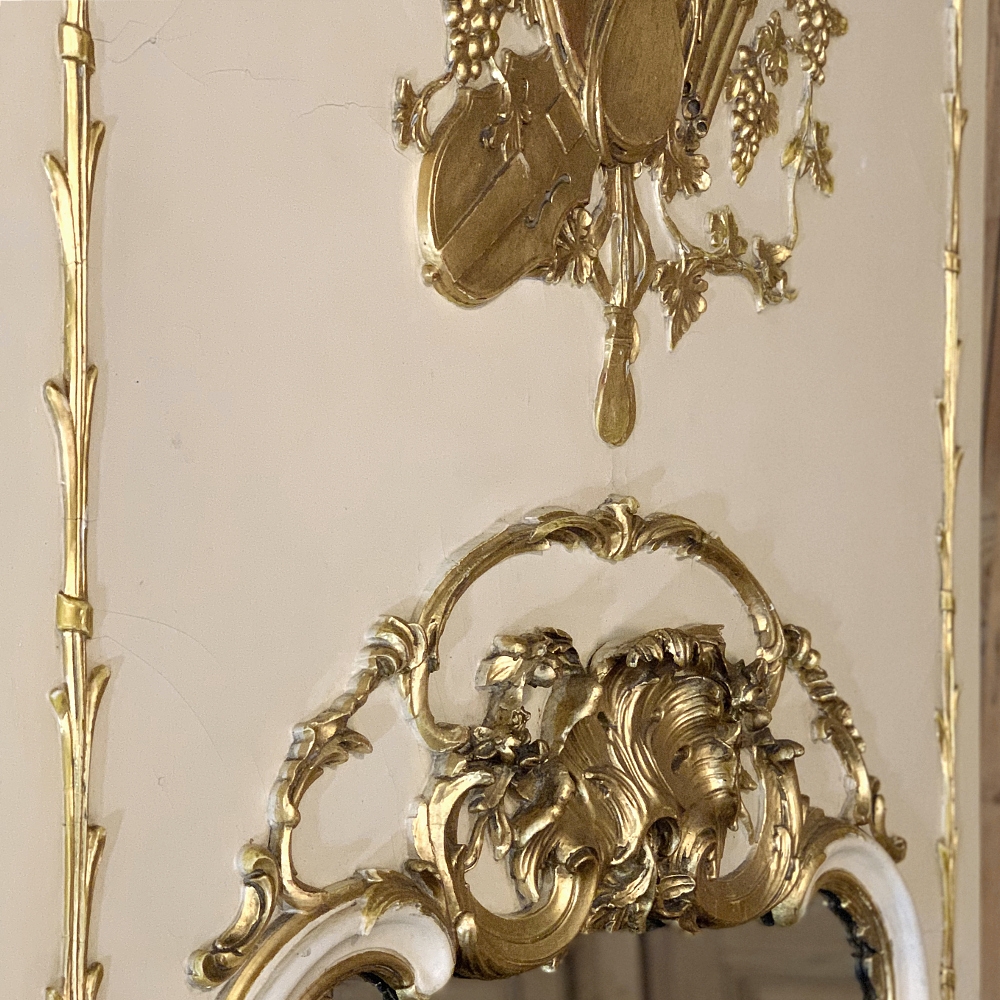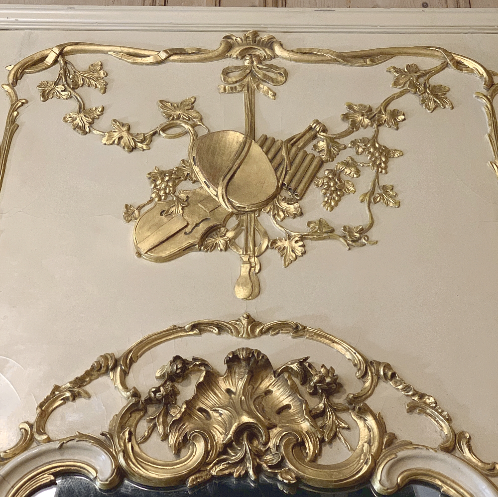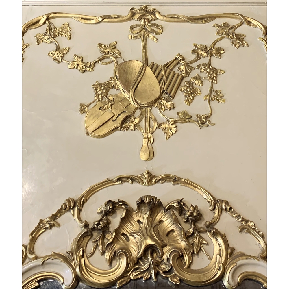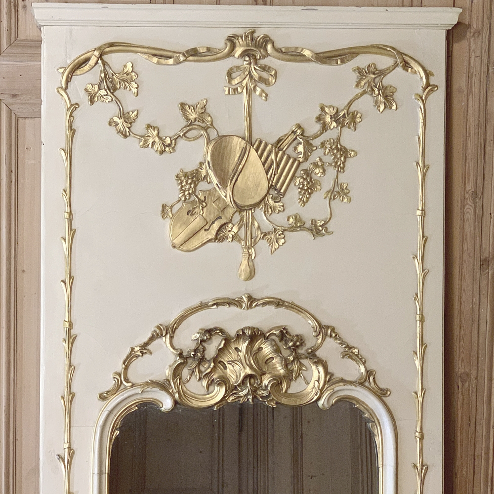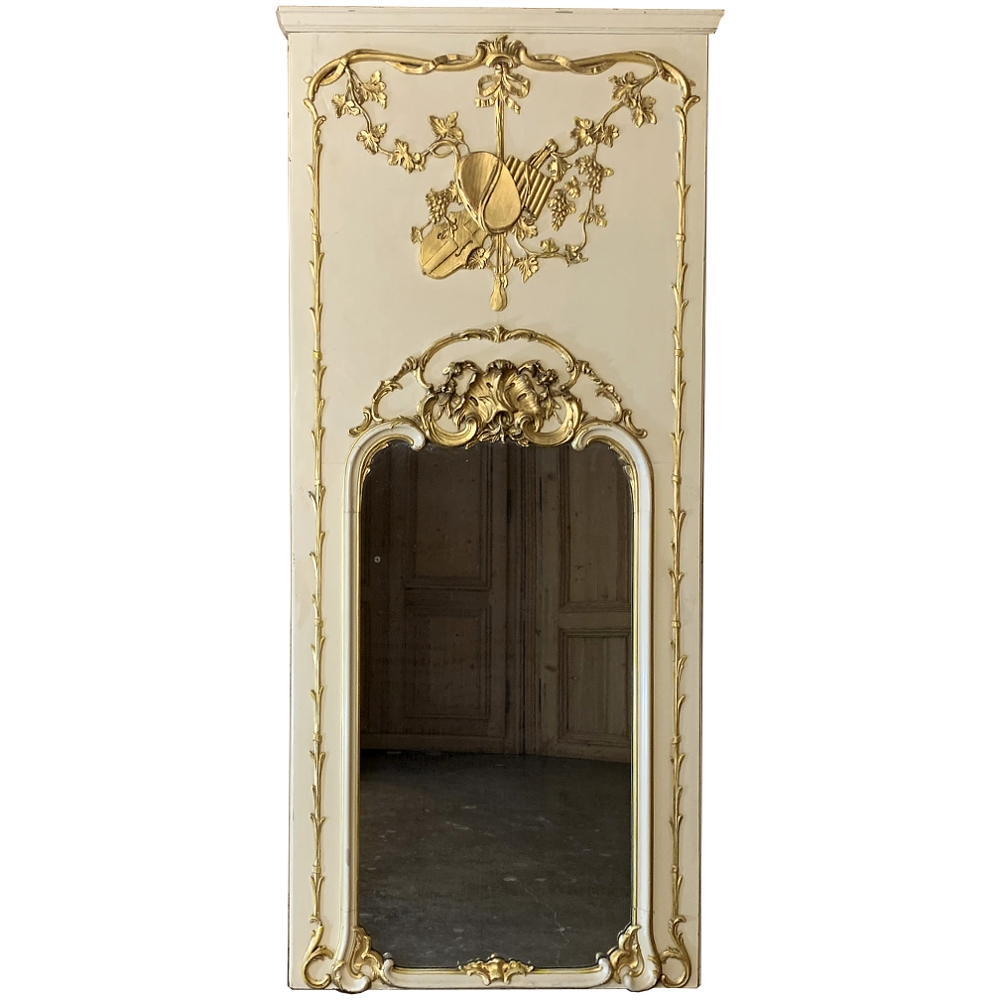 Sale19th Century French Louis XIV Painted Trumeau features classically inspired architecture and elaborate bas relief and molded detail highlighted in gold to complement the warm beige patinaed painted finish of the woodwork. Unlike typical trumeaux with a painting or tapestry above the mirror, this work relies on the incredible artistry of the wood sculptor who artfully depicted musical instruments including a violin, pan flute and tambourine, all tied together with flowing ribbon and fully laden grapevines. The oval topped mirror is surrounded with shell and foliate flourishes, with a dramatic stylized shell crown on top, all of which complements the musical theme above. A border of foliates highlighted in gold creates a secondary framework for the main framework around the mirror which includes scrollwork and acanthus leaf adornment with gold highlights. The mirror is perfectly proportioned to provide a lovely reflection of your room and amplify ambient lighting.