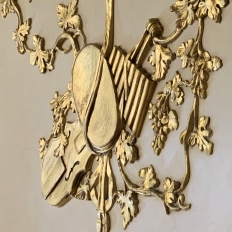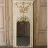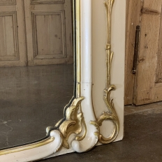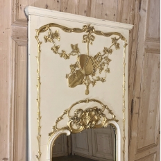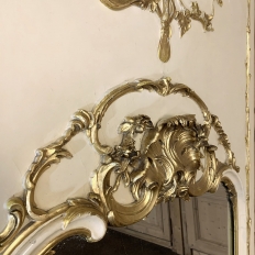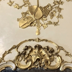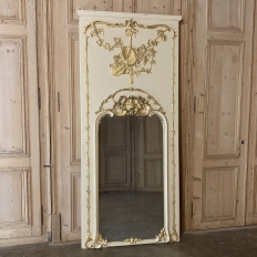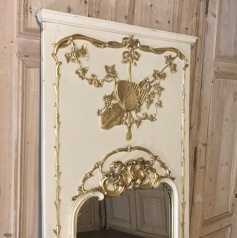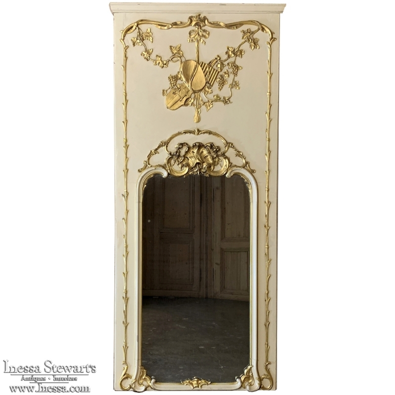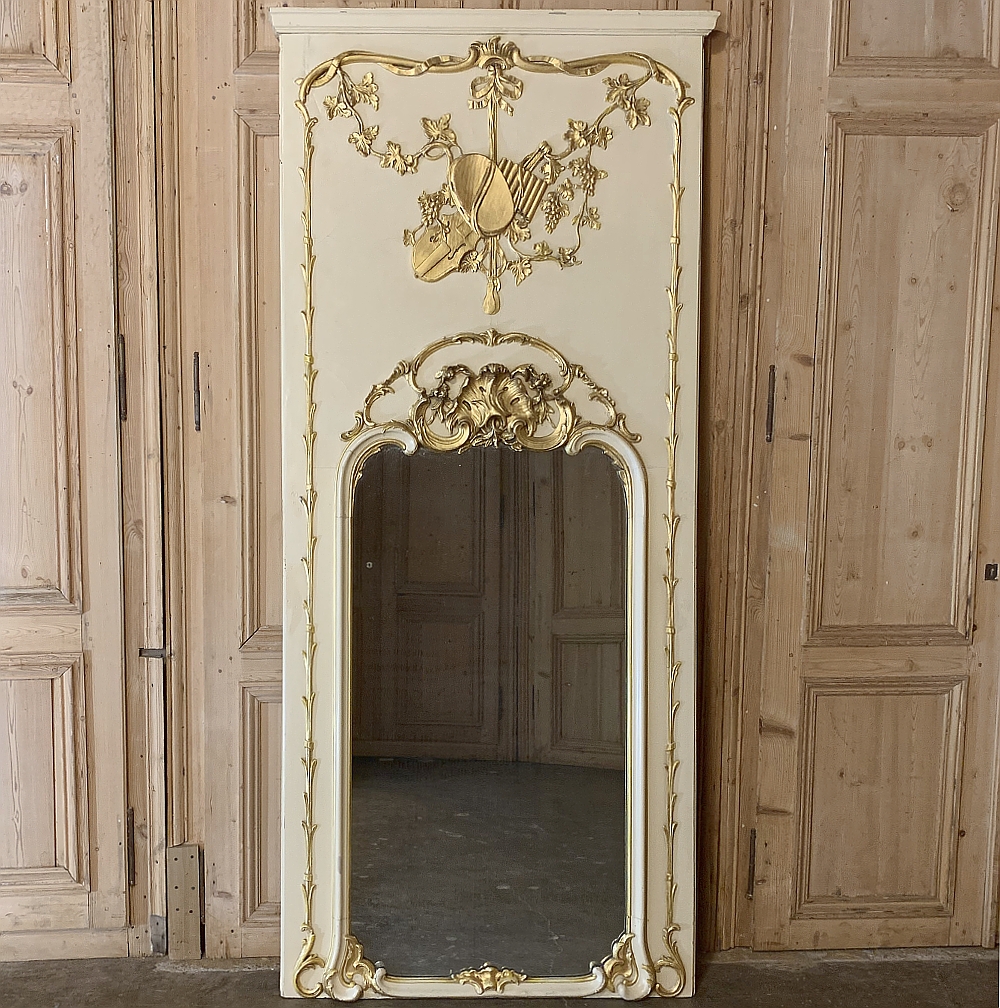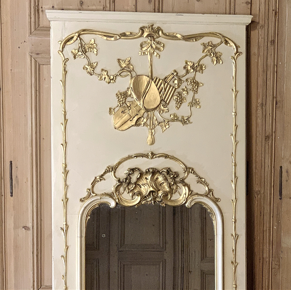 Sale19th Century French Louis XIV Painted Trumeau features classically inspired architecture and elaborate bas relief and molded detail highlighted in gold to complement the warm beige patinaed painted finish of the woodwork. Unlike typical trumeaux with a painting or tapestry above the mirror, this work relies on the incredible artistry of the wood sculptor who artfully depicted musical instruments including a violin, pan flute and tambourine, all tied together with flowing ribbon and fully laden grapevines. The oval topped mirror is surrounded with shell and foliate flourishes, with a dramatic stylized shell crown on top, all of which complements the musical theme above. A border of foliates highlighted in gold creates a secondary framework for the main framework around the mirror which includes scrollwork and acanthus leaf adornment with gold highlights. The mirror is perfectly proportioned to provide a lovely reflection of your room and amplify ambient lighting.