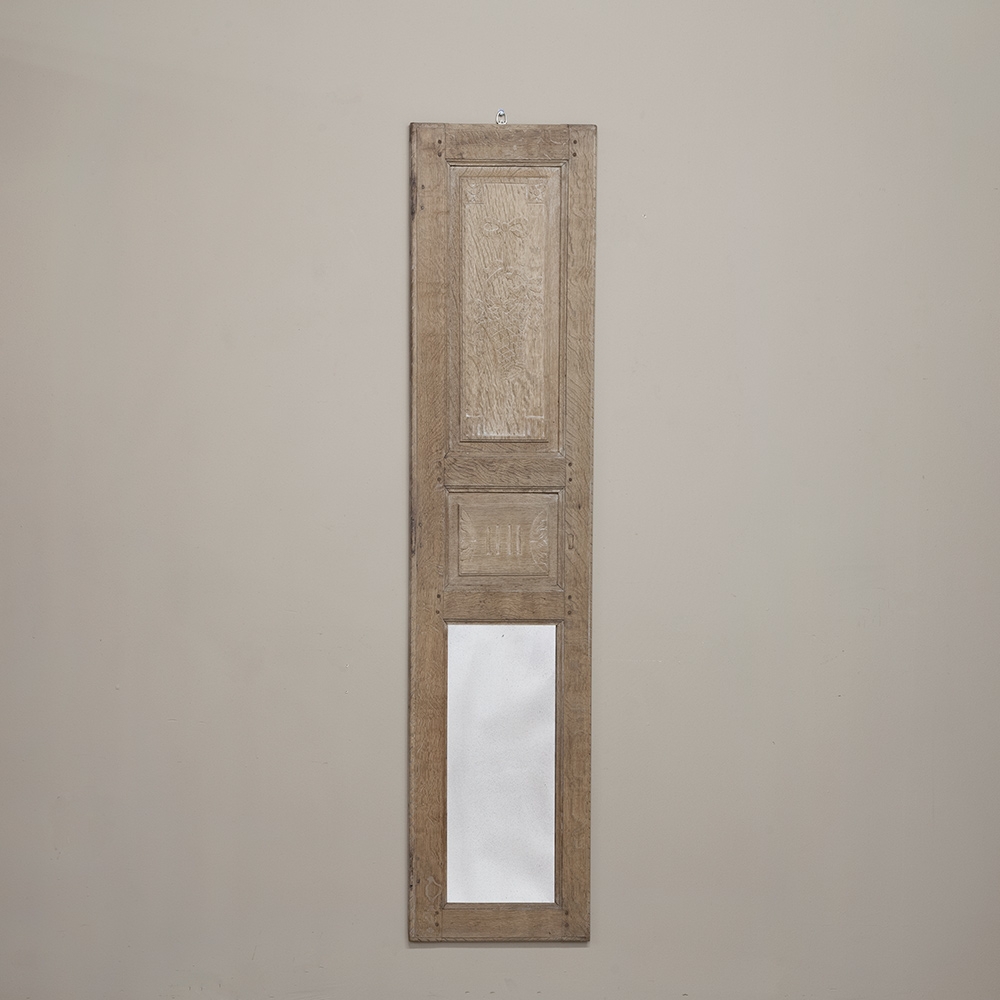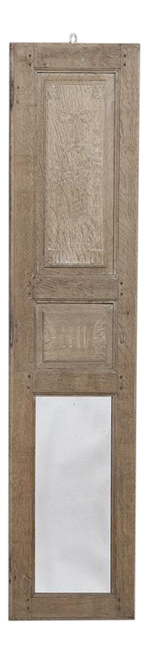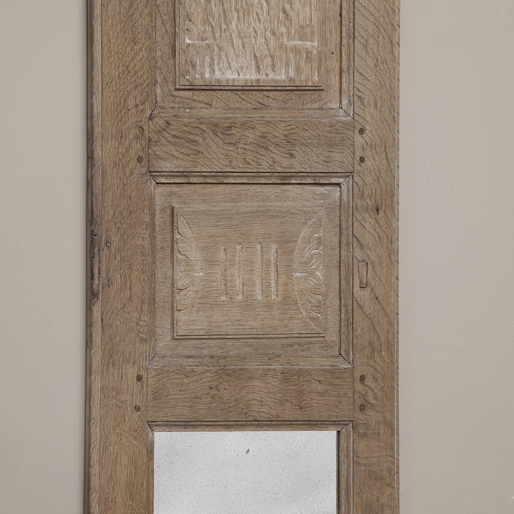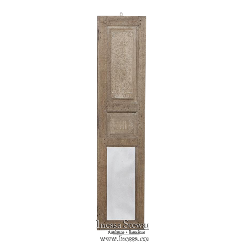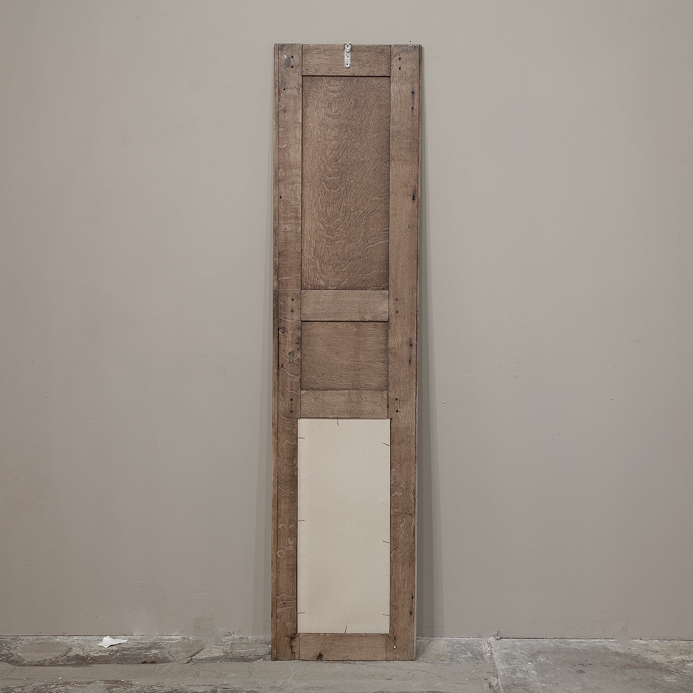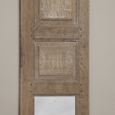 19th Century French Louis XVI Panel Trumeau was originally a panel decoration for a fine manoir, and has been salvaged to adorn your home for decades more to come! This Antique Louis XVI Panel Trumeau makes the perfect choice for a slender niche, space between windows or a powder or guest bath. Note the chamfered raised panels and the pegged mortise and tenon joints, as well as the subtle hand-carved embellishments. The stripped oak finish makes it work very well with today's casual decors!