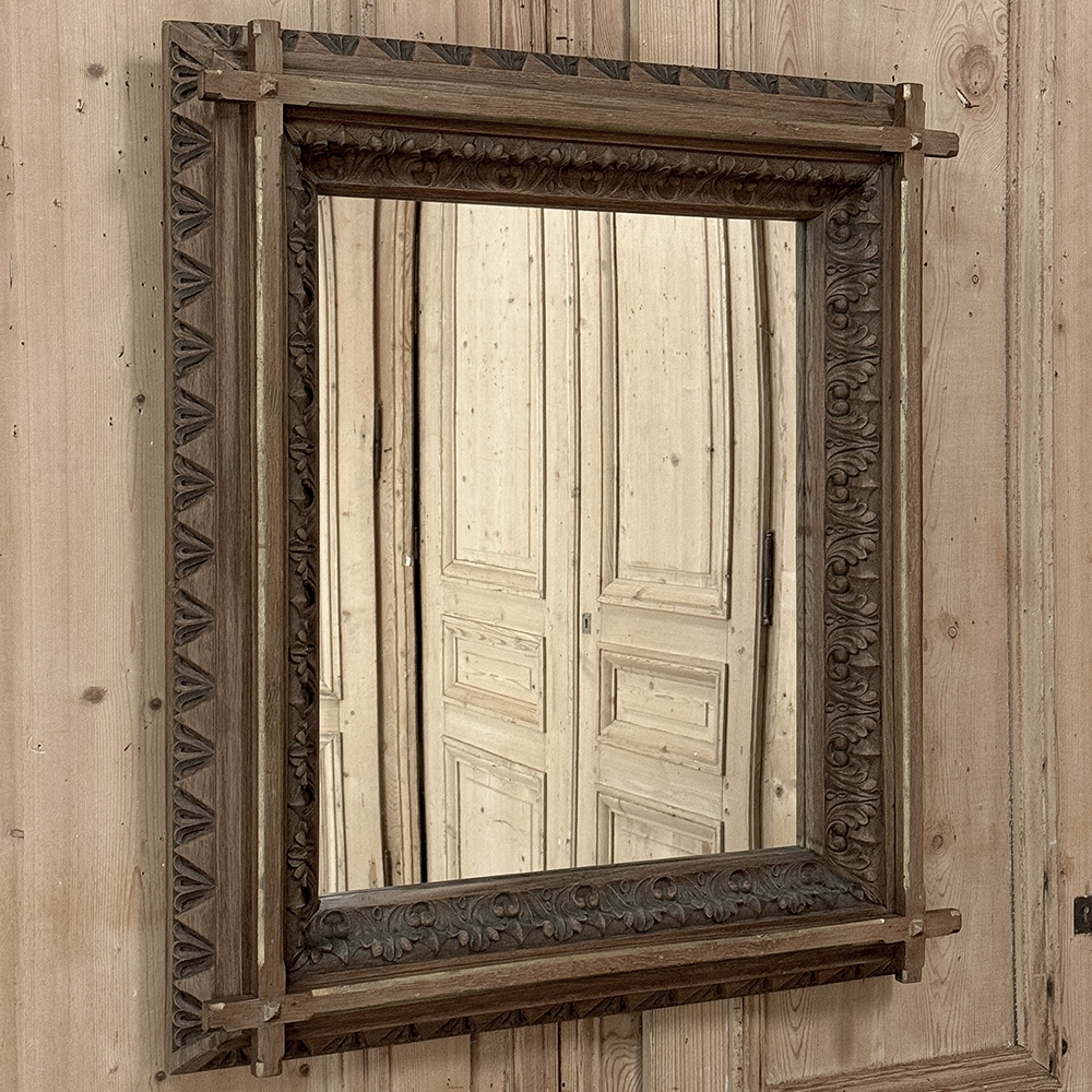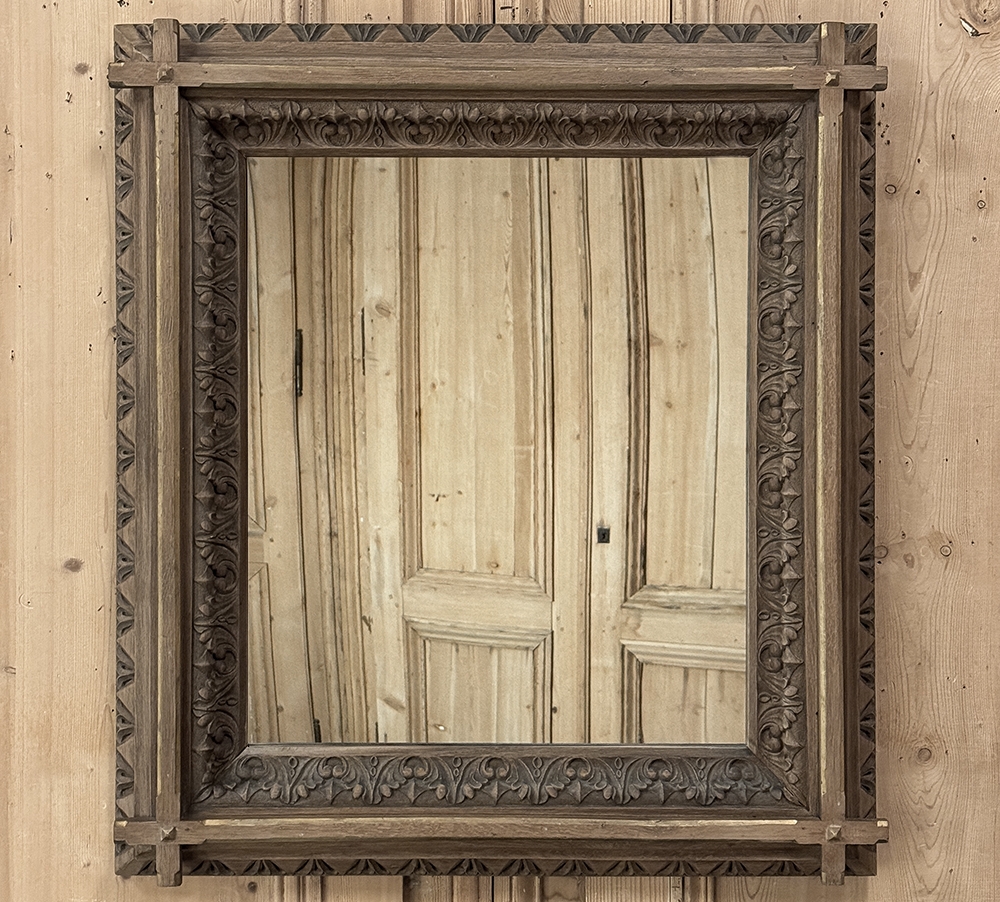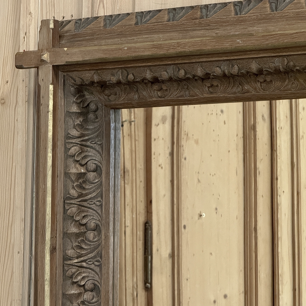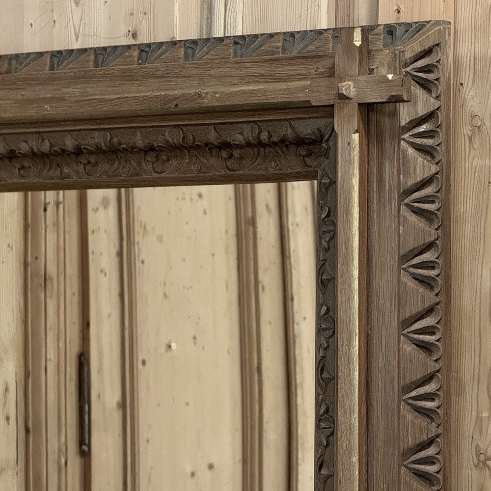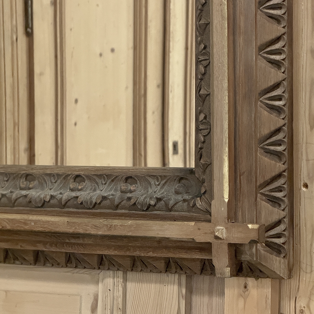 19th Century French Neogothic Oak Mirror was hand-crafted during the Arts & Crafts period, and features a sturdy, stoutly made framework with a stylized egg & dart trim carved all around the entire perimeter, with a raised mullion still showing just a hint of the original gold highlighting at the apex, transitioning to an amazingly; intricate foliate pattern that completely surrounds the mirror glass itself. Such foliate patterns predate the Gothic period itself, but were immediately adopted as a standard trim motif that has been used for over 800 years! The mirror is newly replaced, allowing this amazing mirror to provide generations of enjoyment for you and your family. Note that this piece is a bit heavier than it looks, so please make sure to use appropriate hanging methods for your wall type.
