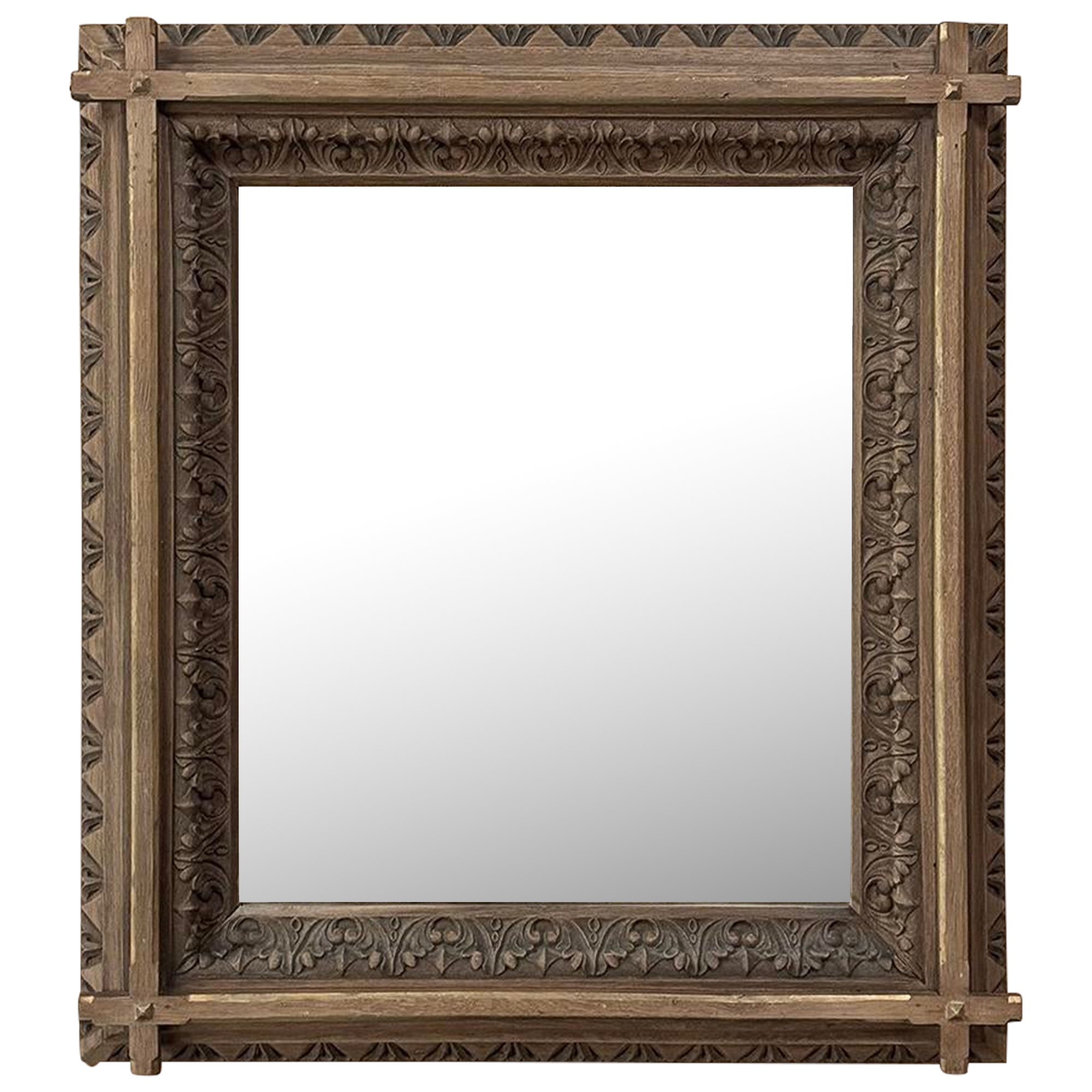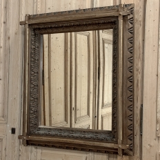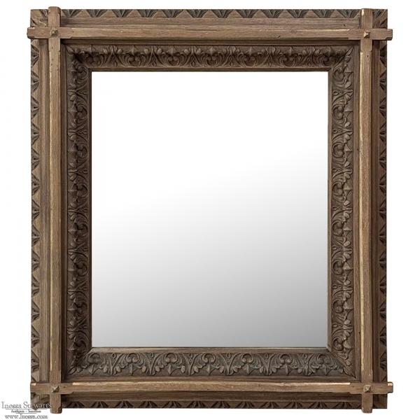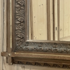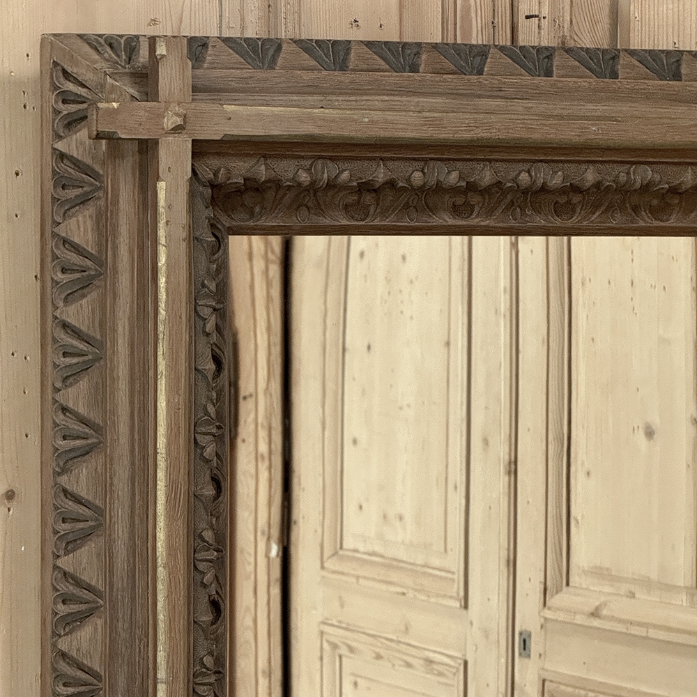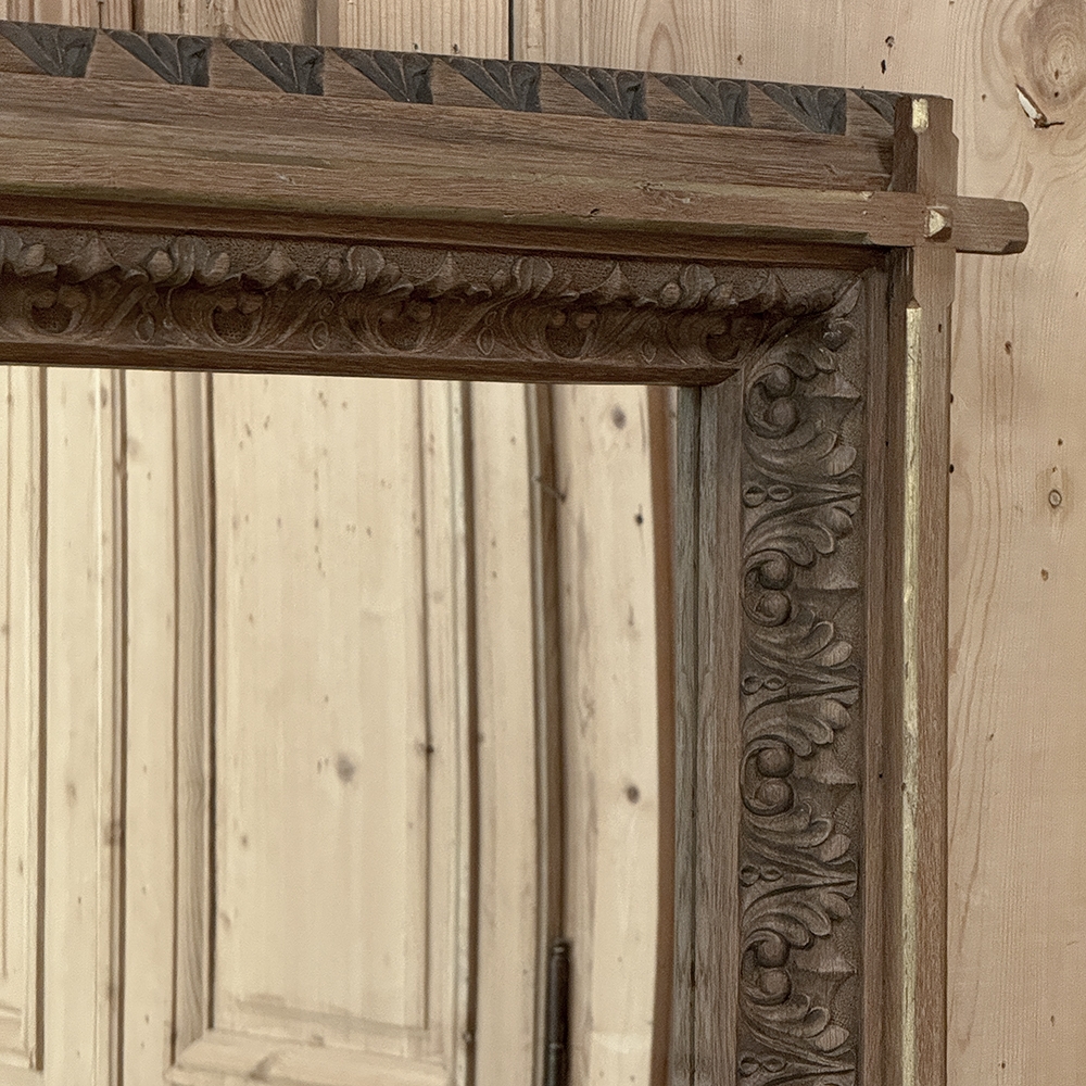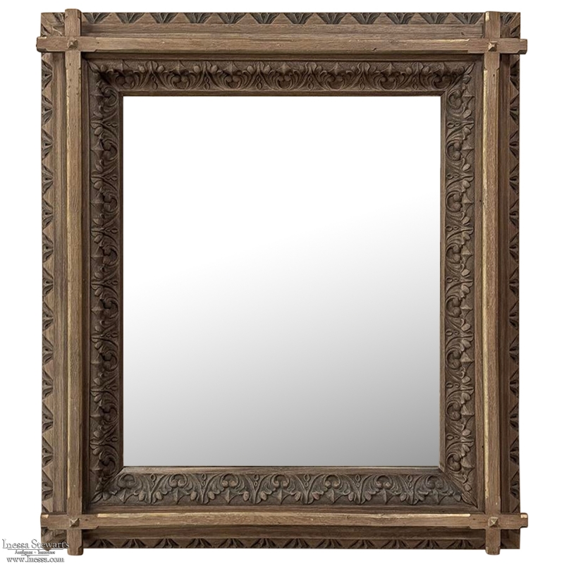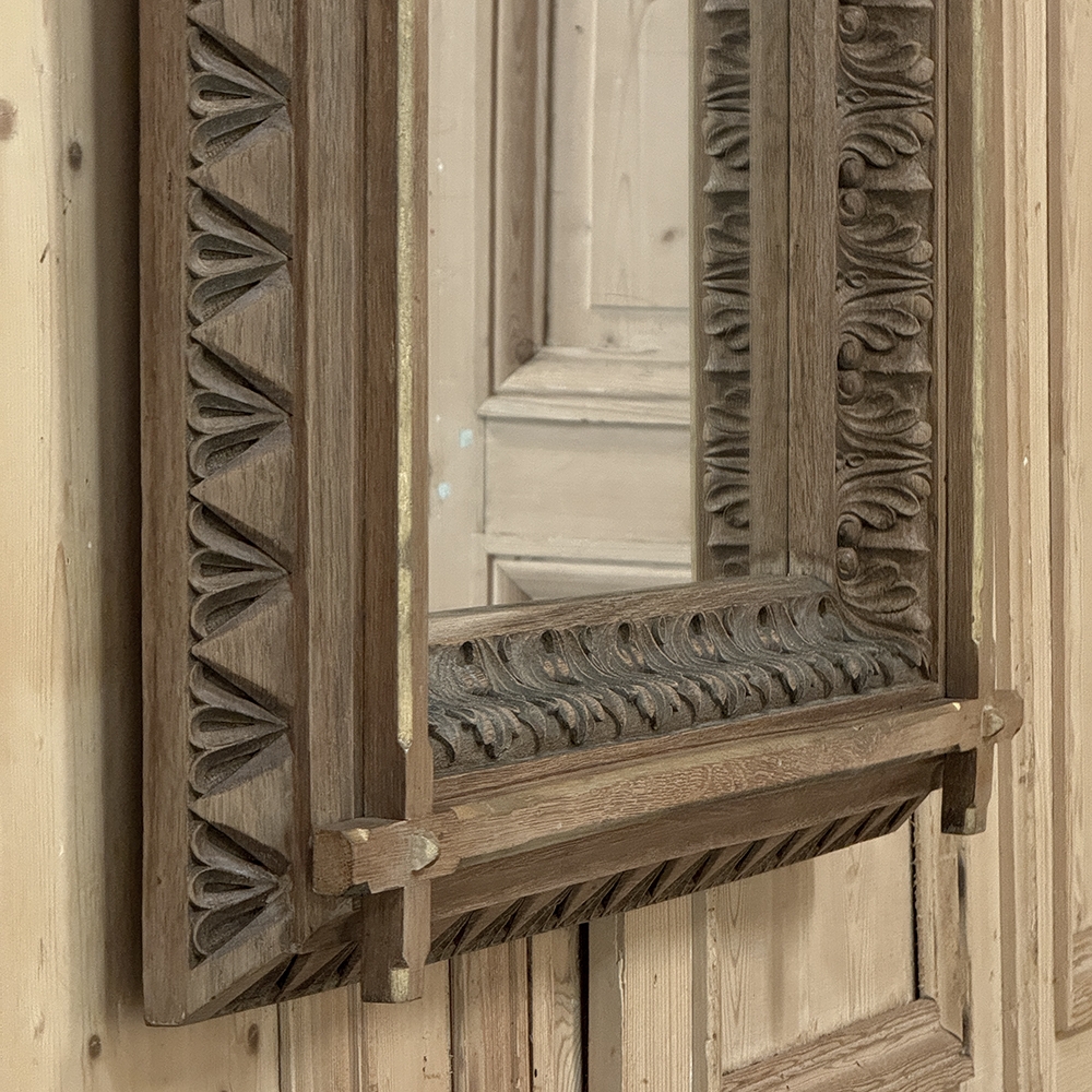 19th Century French Neogothic Oak Mirror was hand-crafted during the Arts & Crafts period, and features a sturdy, stoutly made framework with a stylized egg & dart trim carved all around the entire perimeter, with a raised mullion still showing just a hint of the original gold highlighting at the apex, transitioning to an amazingly; intricate foliate pattern that completely surrounds the mirror glass itself. Such foliate patterns predate the Gothic period itself, but were immediately adopted as a standard trim motif that has been used for over 800 years! The mirror is newly replaced, allowing this amazing mirror to provide generations of enjoyment for you and your family. Note that this piece is a bit heavier than it looks, so please make sure to use appropriate hanging methods for your wall type.