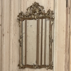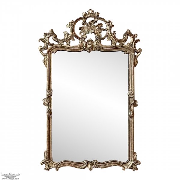 19th Century Italian Carved Giltwood Rococo Style Mirror is a beautiful representation of the style, with a restrained interpretation that results in a dignified, timeless Italian look without being too ostentatious. Hand-carved giltwood surrounds the mirror accented with stylized foliate and shell accents on all sides, but the crown is particularly impressive, featuring a pierce-carved artwork centered with a fanciful acanthus plume modeled after a scallop shell surrounded by scrollwork and foliates, and crowned at the top with an acanthus flourish. The aged patina of the gold finish adds a Old World effect that cannot be denied!