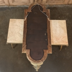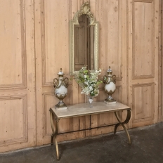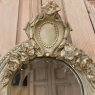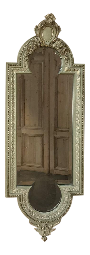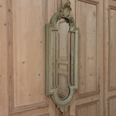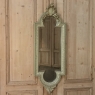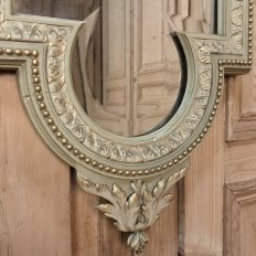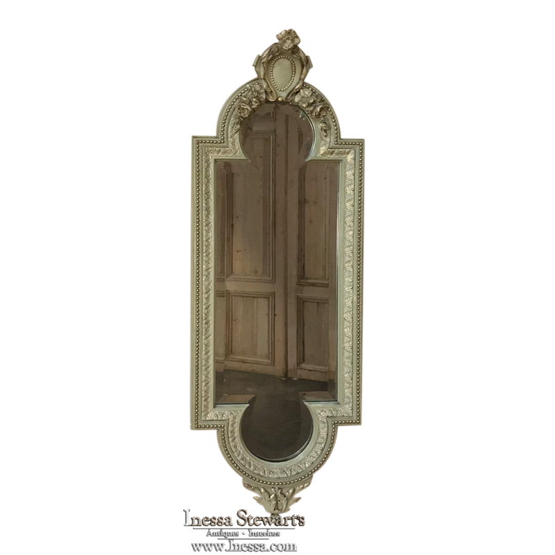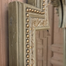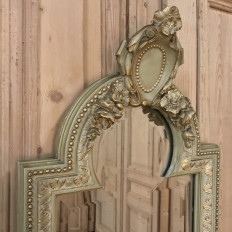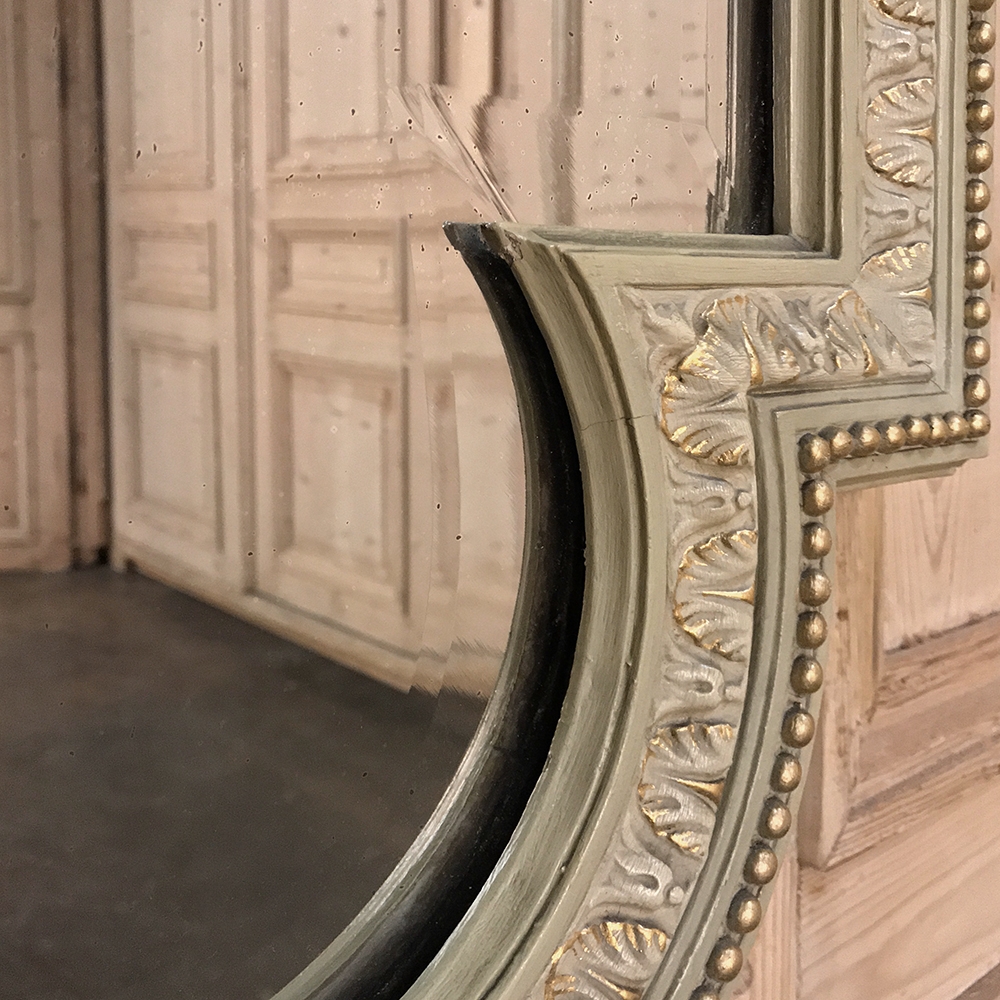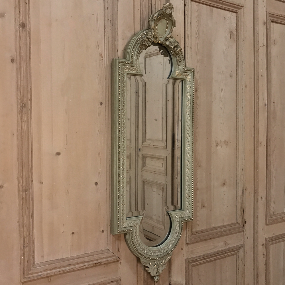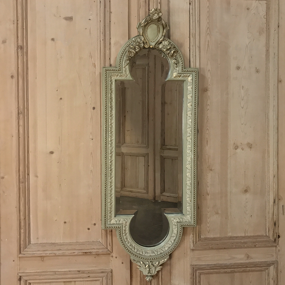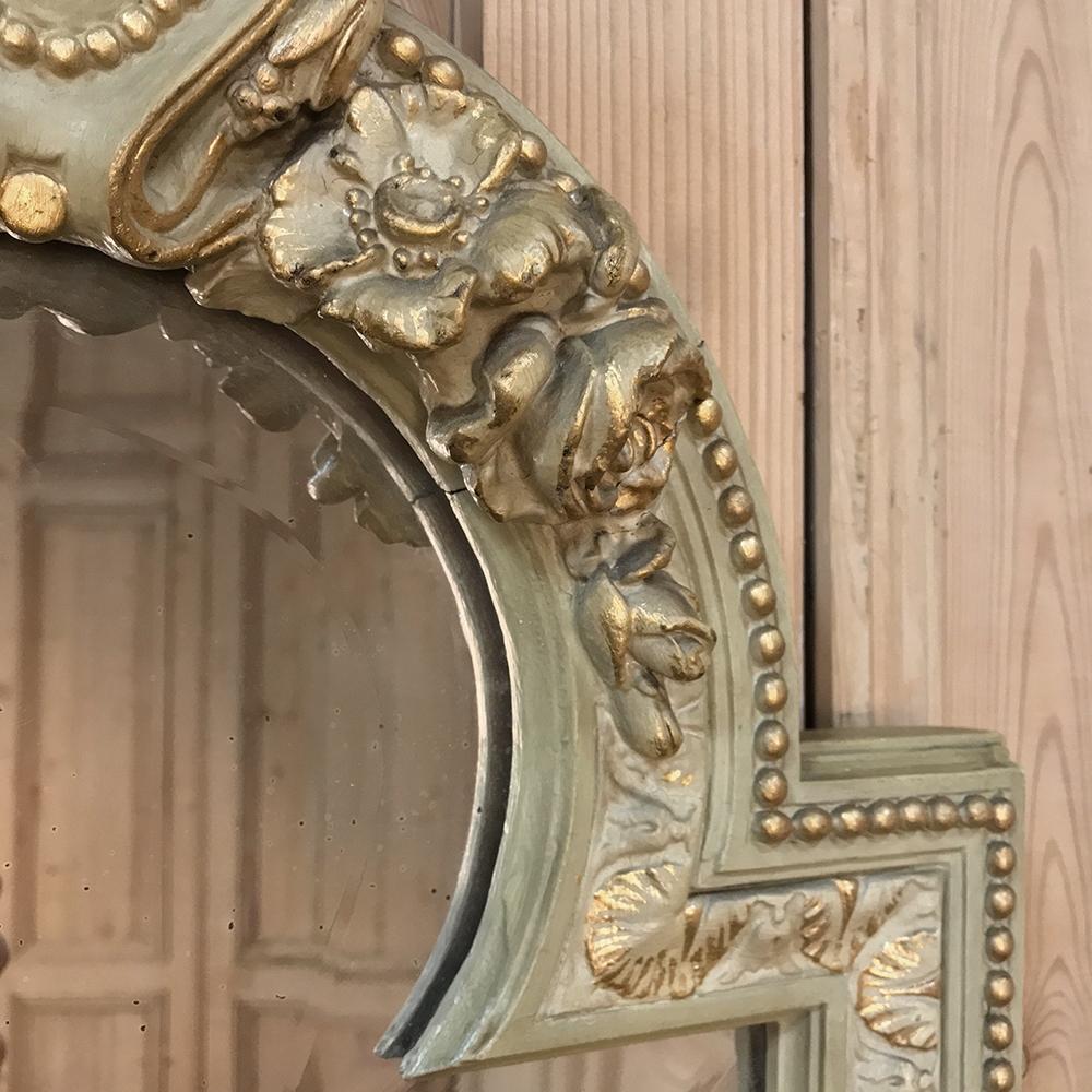 19th Century Italian Louis XVI Painted & Gilded Mirror was designed in an unusual vertical orientation with a narrow width that makes it ideal for special applications in a room. Featuring its original painted finish that has achieved a lovely patina over the past century, its pastel tones include a very subtle olive green highlighted with patinaed gold. The boldly arched crown and symmetrically designed base are lavished with hand-carved crest, floral and acanthus foliate motifs, with floral sprays cascading down the shoulders above. Beading and a repeating fletching border continue around the entire frame which surrounds the original beveled mirror. Imagine the dozens of places a design with such dimensions can be placed throughout the home!