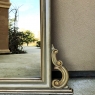 19th Century Venetian Painted Mirror features a bold heraldic crest atop the gracefully arched crown, flanked by cascading floral and foliate sprays accented with blushes of color. The overall taupe and light gray color of the framework is highlighted in gold as well. Below is a full width molding with upturned scrollwork acting as buttresses, making this an excellent choice for above the fireplace, over a sink, atop any surface, or as a free-hanging piece. Note the original planks on the back side designed to protect the original silvering.