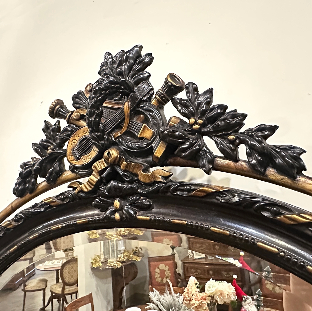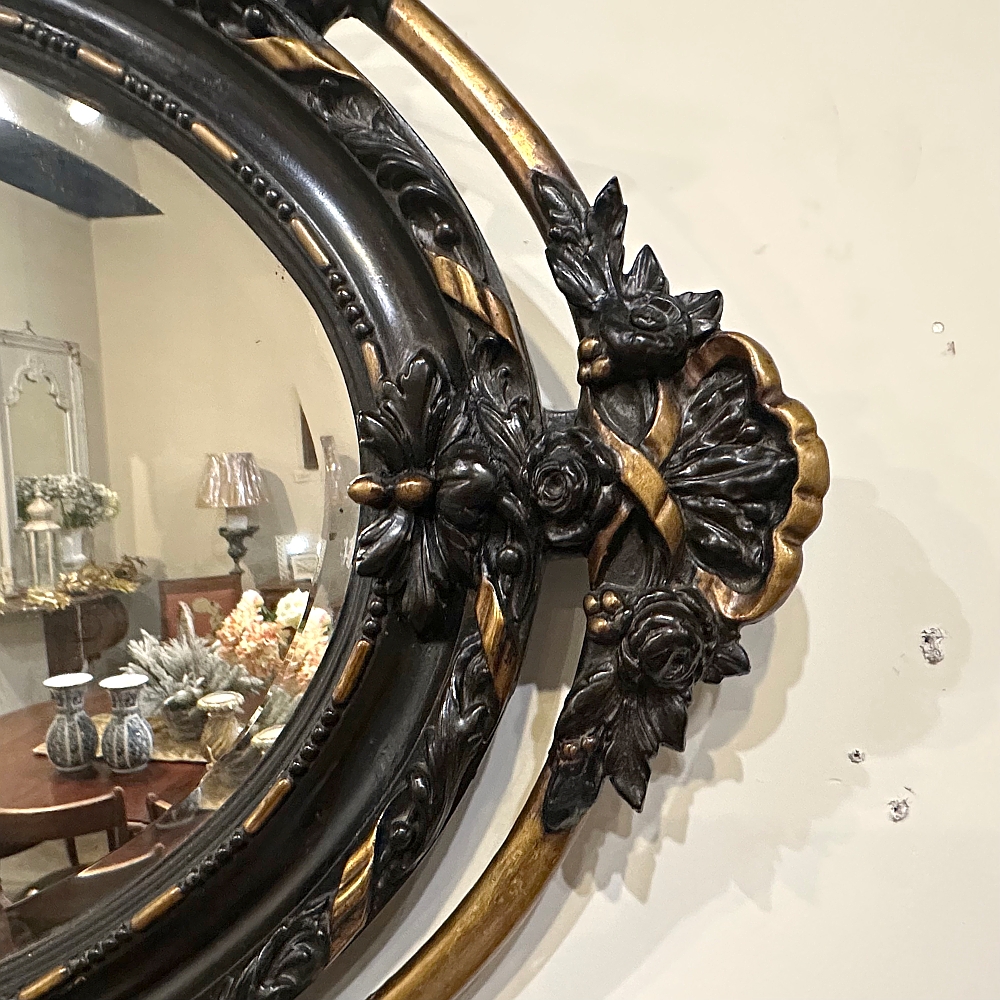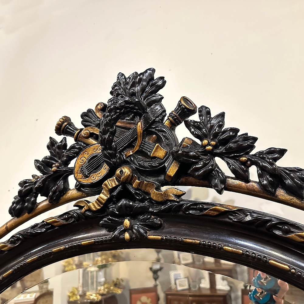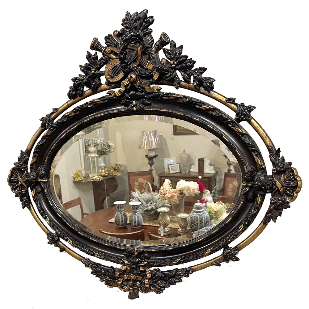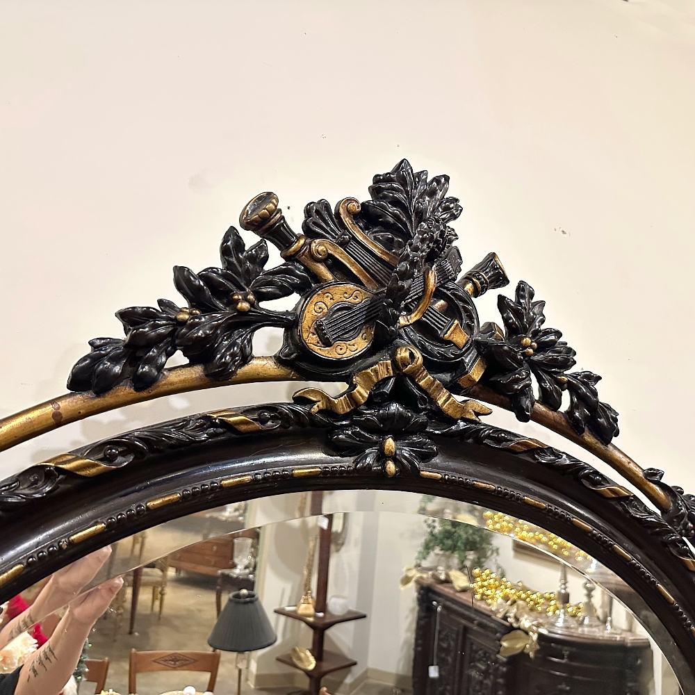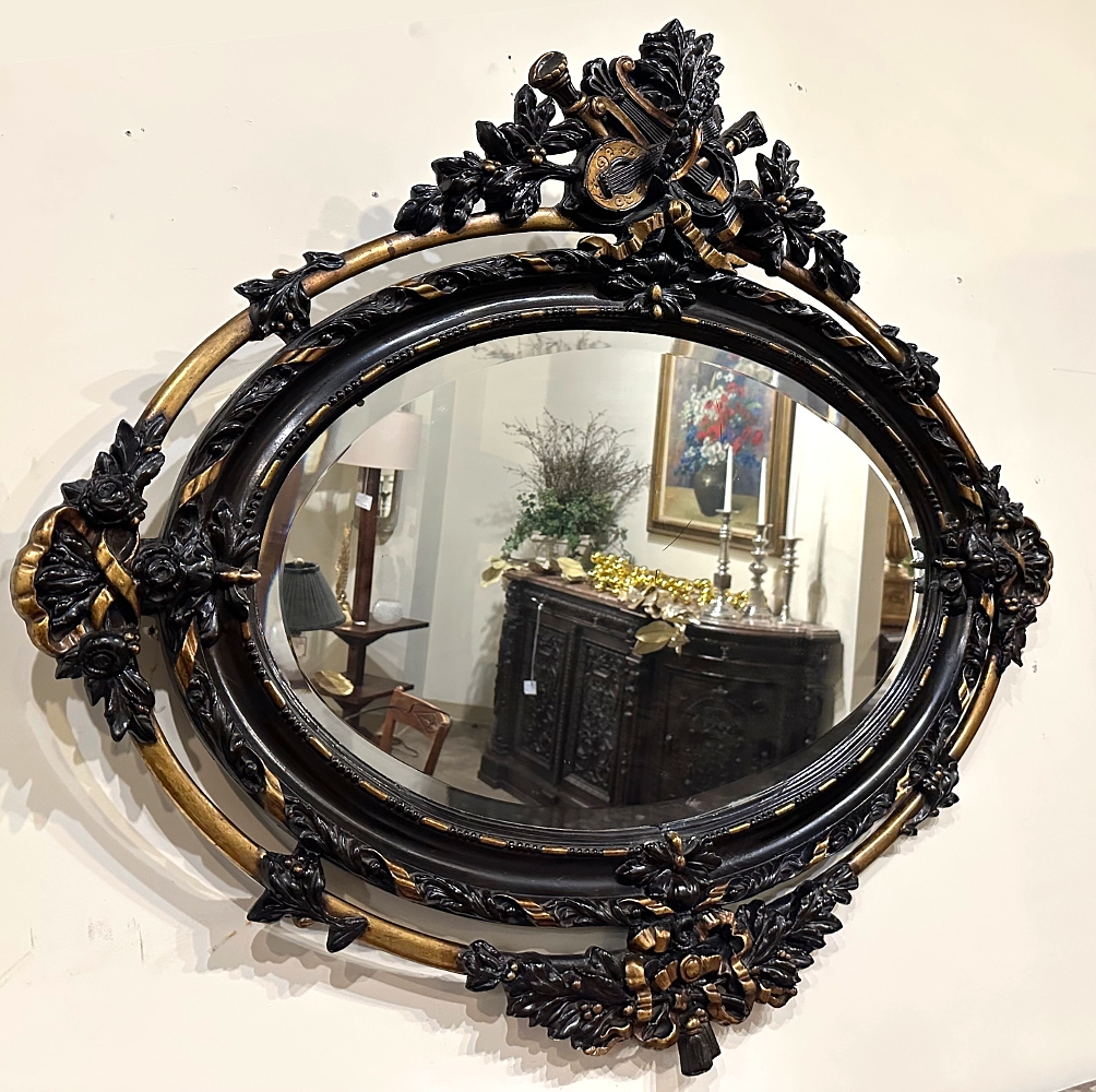 Created in an uncommon horizontally-oriented oval shape, this wonderful Antique French 19th Century Louis XVI Oval Mirror features spectacular detail from top to bottom! The crown at center top features musical instruments including a lyre and lute, intermingled with a miter and torchere amongst fully laden olive branches, all held together with ribbon. The ribbon motif combines with dashes and beads to completely surround the oval beveled mirror, with an unusual ring separated from and encircling the outermost embellishments. Stylized shells, florals and foliates appear in abundance all around the framework which is highlighted in an ebony and gold finish.