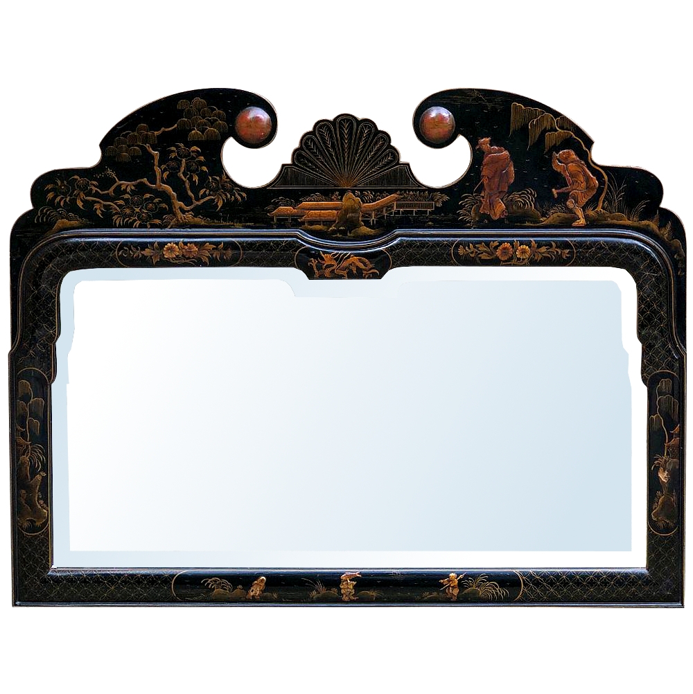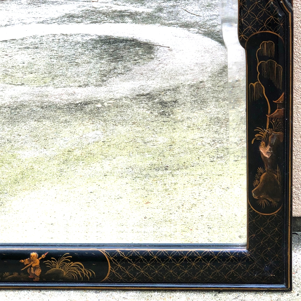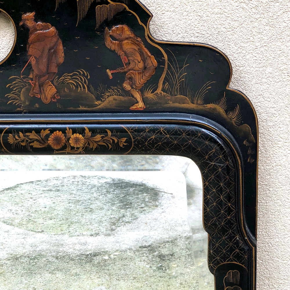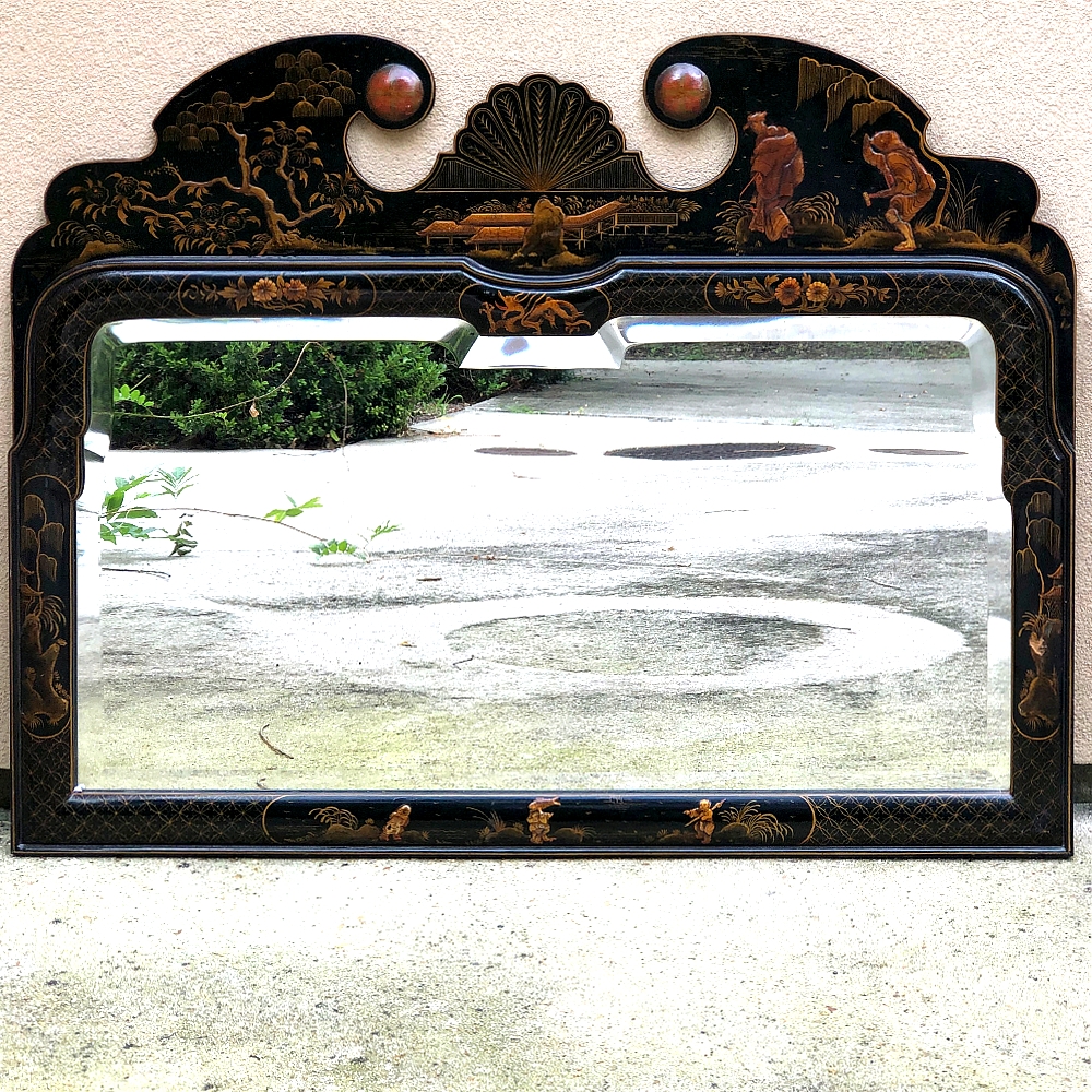 Antique French Chinoiserie Hand-Painted Beveled Mirror is a splendid example of French craftsmanship imitating Oriental style! The elegant, unusually shaped mirror frame was first covered in black enamel to create an ebonized effect, then meticulously hand-painted with Oriental scenes around the frame, all rendered in gold for contrast, with red tones for visual intrigue. The subtle contours of the frame have been followed closely by the beveling on the mirror. Ideal for a mantel, powder room or anywhere a lovely artifact of hand-craftsmanship and artistry is desired!