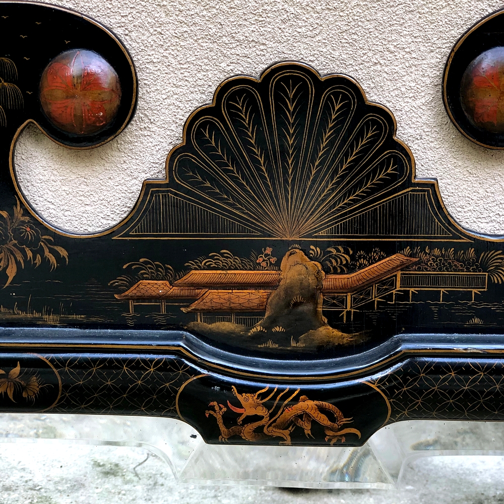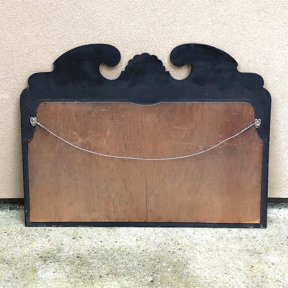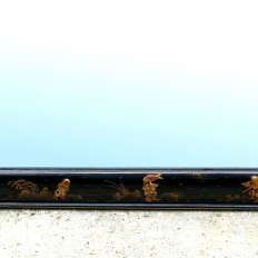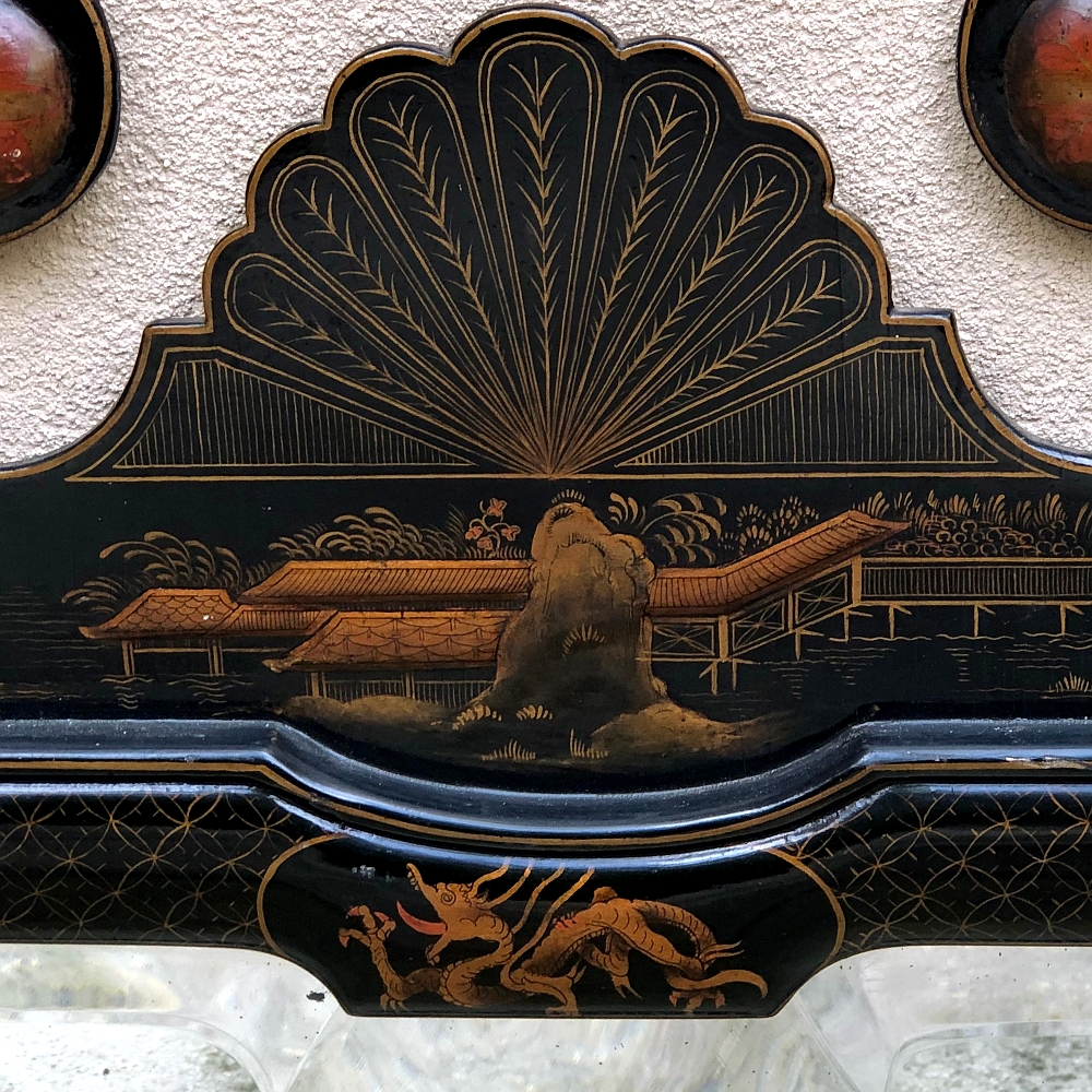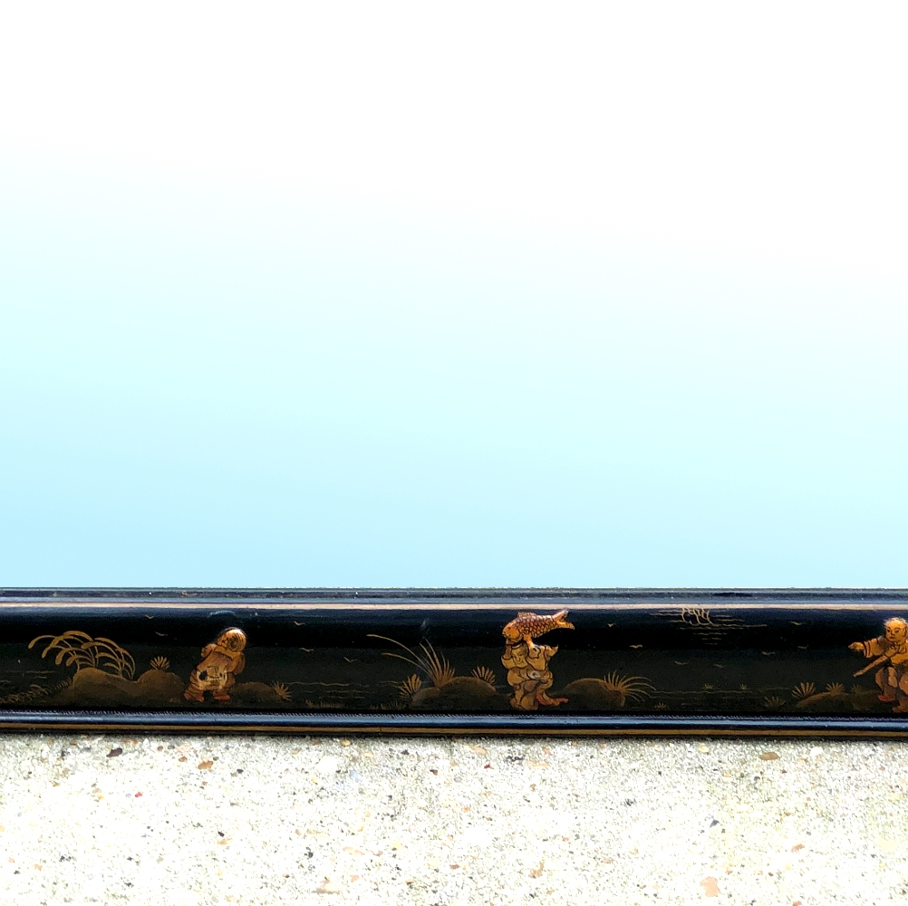 Antique French Chinoiserie Hand-Painted Beveled Mirror is a splendid example of French craftsmanship imitating Oriental style! The elegant, unusually shaped mirror frame was first covered in black enamel to create an ebonized effect, then meticulously hand-painted with Oriental scenes around the frame, all rendered in gold for contrast, with red tones for visual intrigue. The subtle contours of the frame have been followed closely by the beveling on the mirror. Ideal for a mantel, powder room or anywhere a lovely artifact of hand-craftsmanship and artistry is desired!
