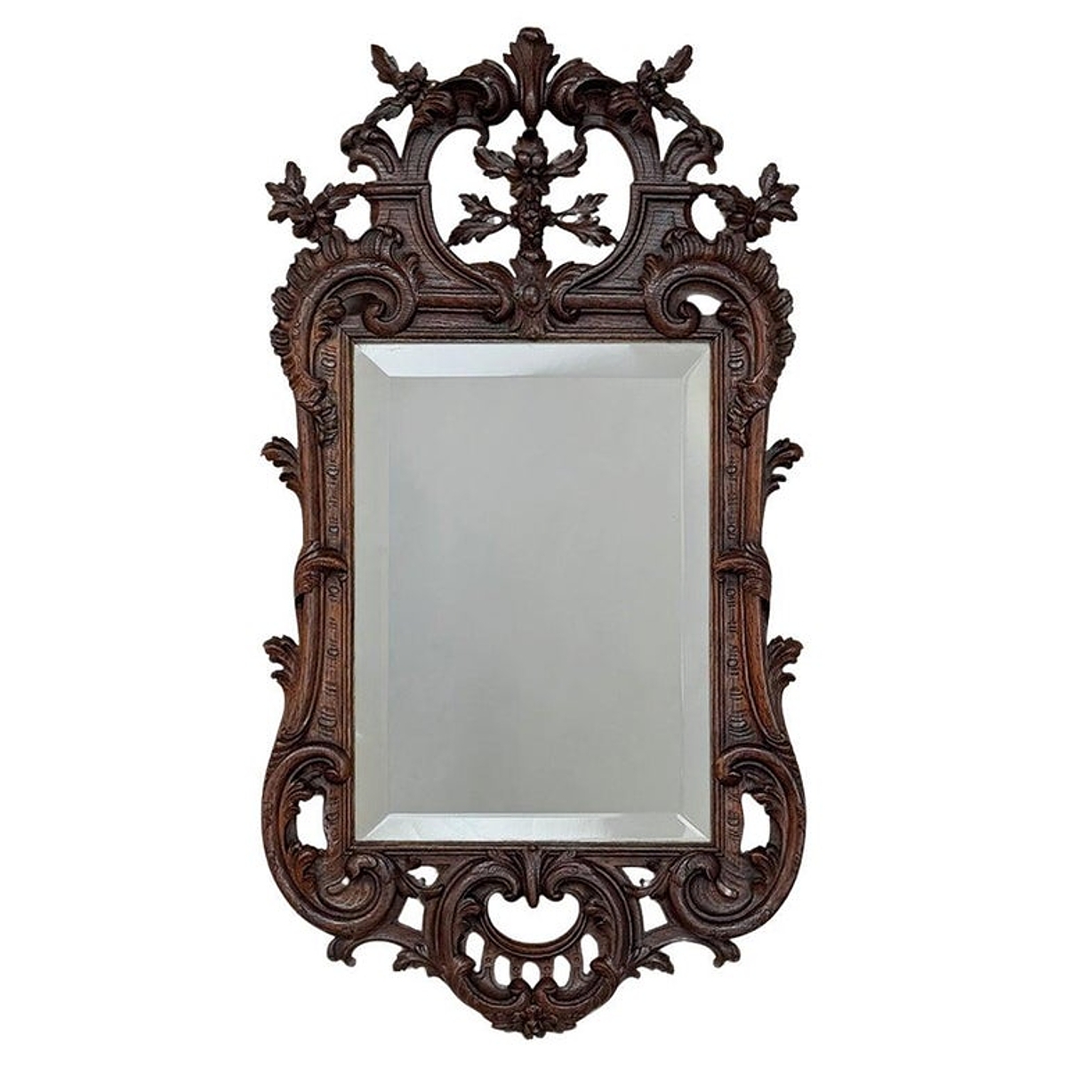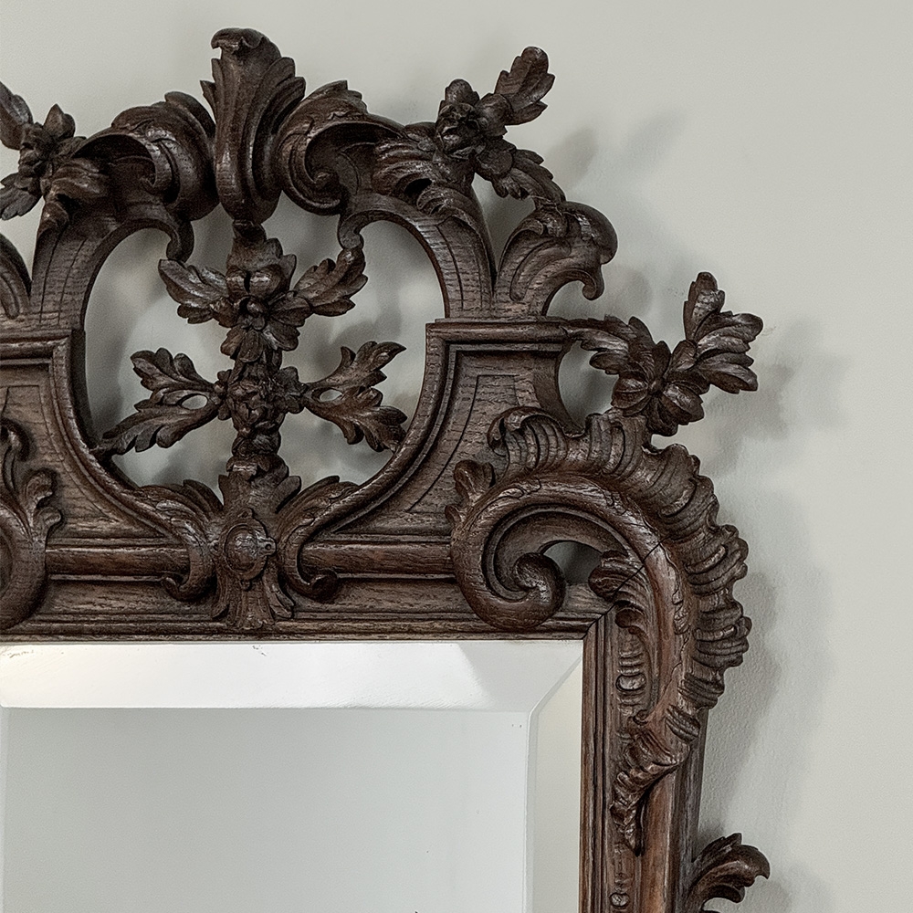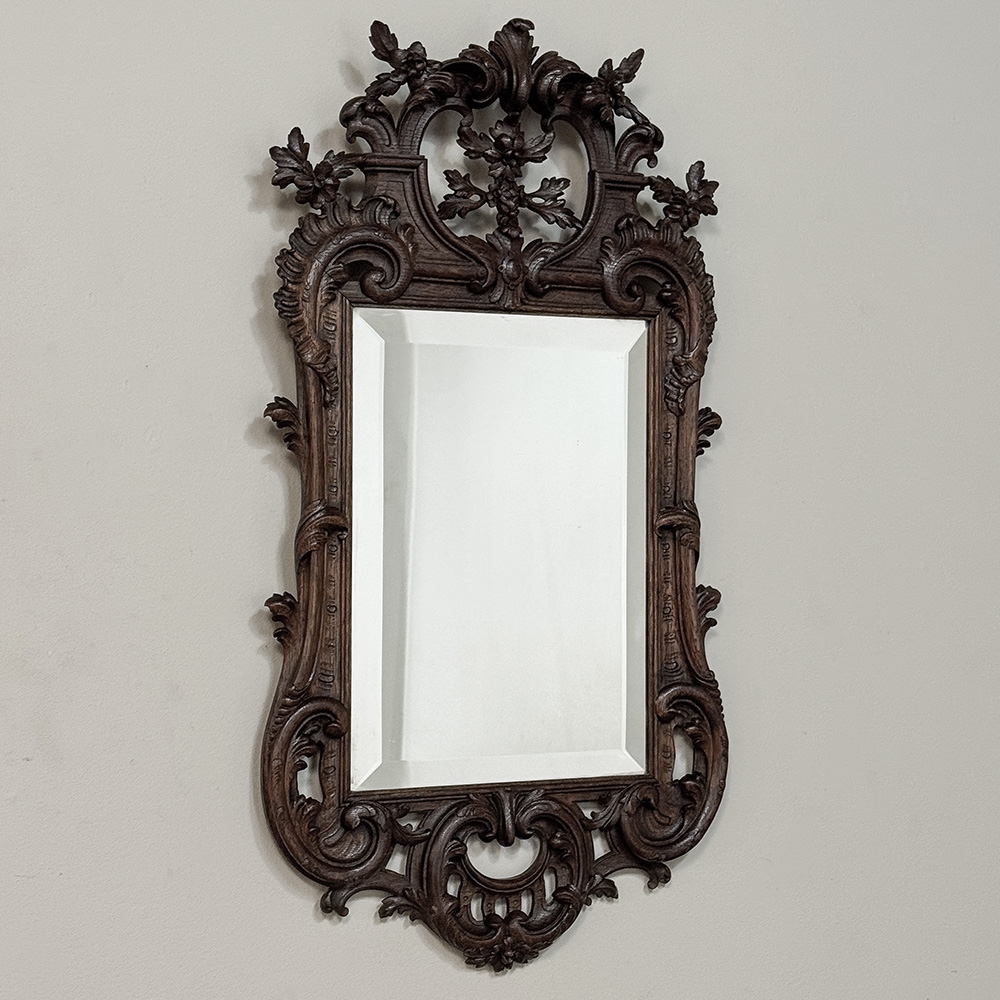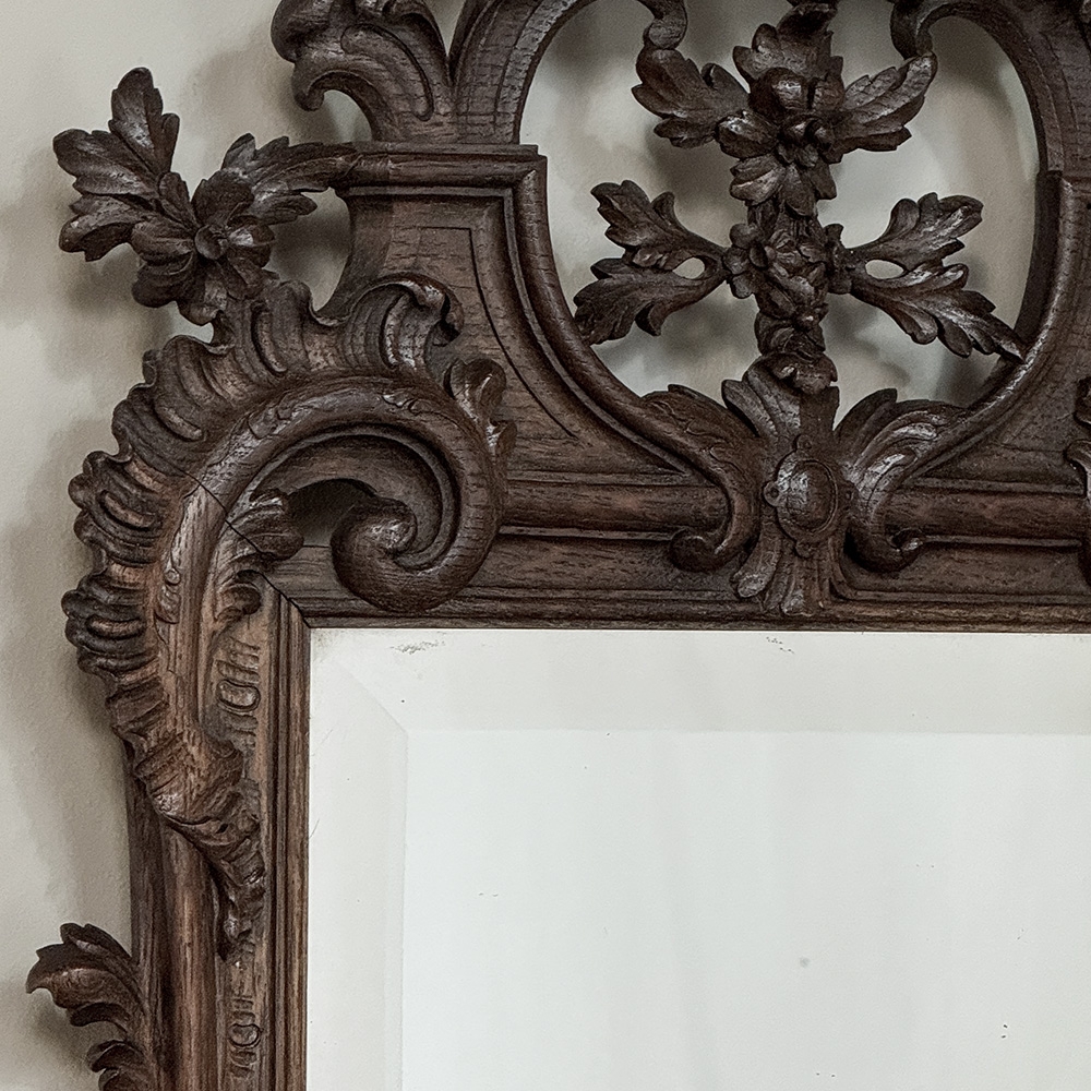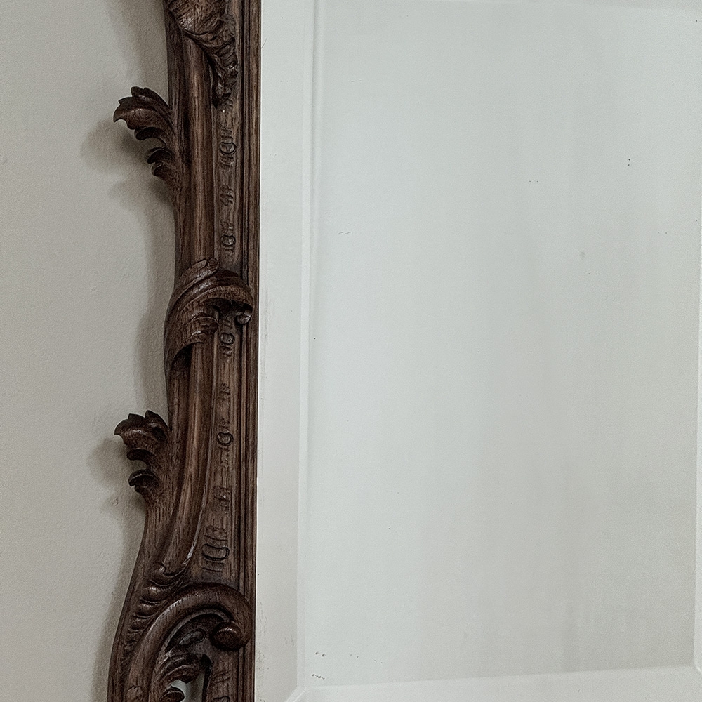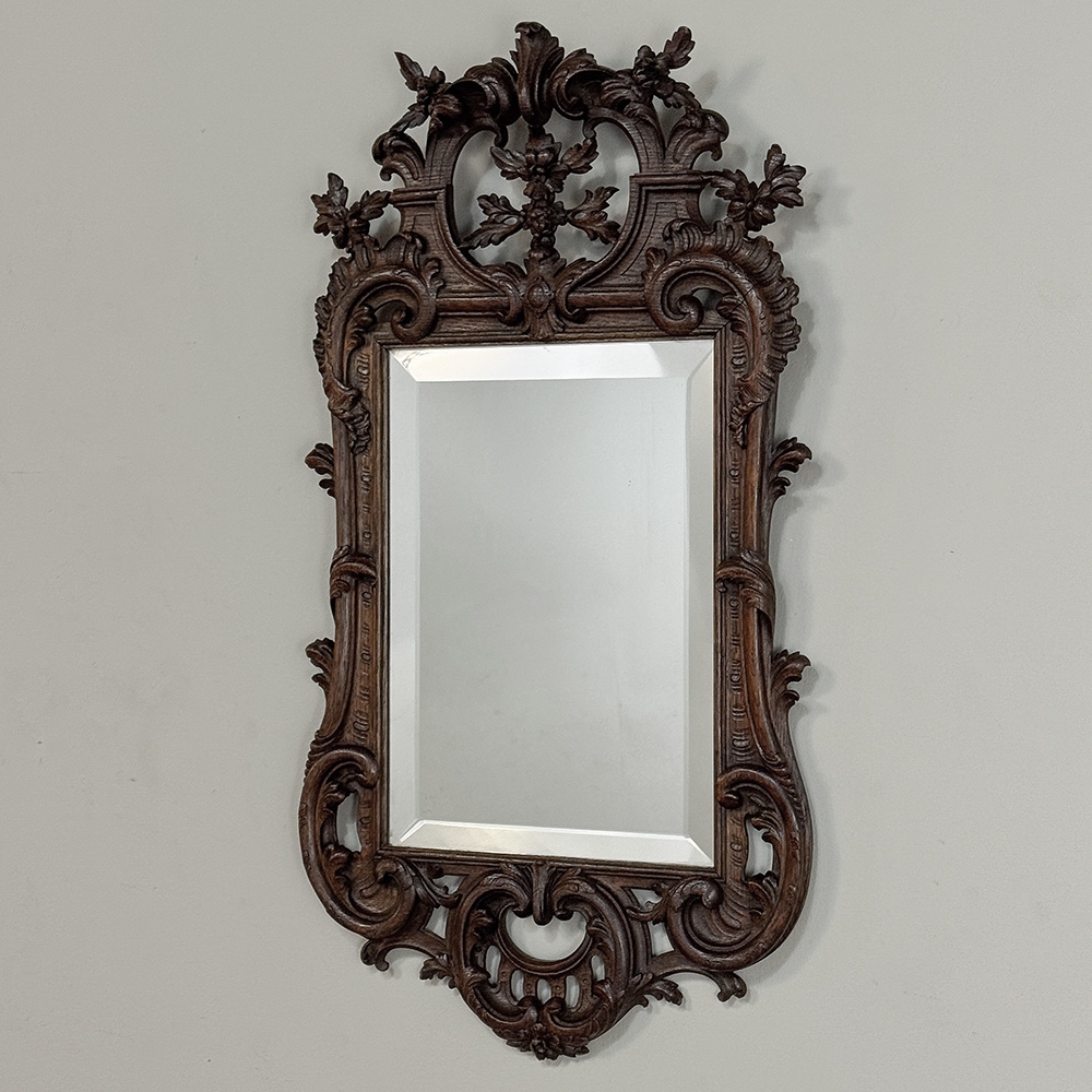 Antique French Louis XIV Carved Wood Mirror is a superlative example of the wood sculptor's art! Using both classical and baroque inspirations for his work, the artist meticulously sculpted a framework that is truly amazing from the crown to the base. The carvings are three dimensional, piercing through the wood to create depth and allow the wall background to merge with the design. Intricate foliates, stylized shells and flowers are the themes, all in a curvaceous, even sensuous form surrounding the French-beveled mirror. Ideal for cozy niches, powder rooms or the bath, it will be an easy task to find a special place for such a prized find!