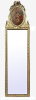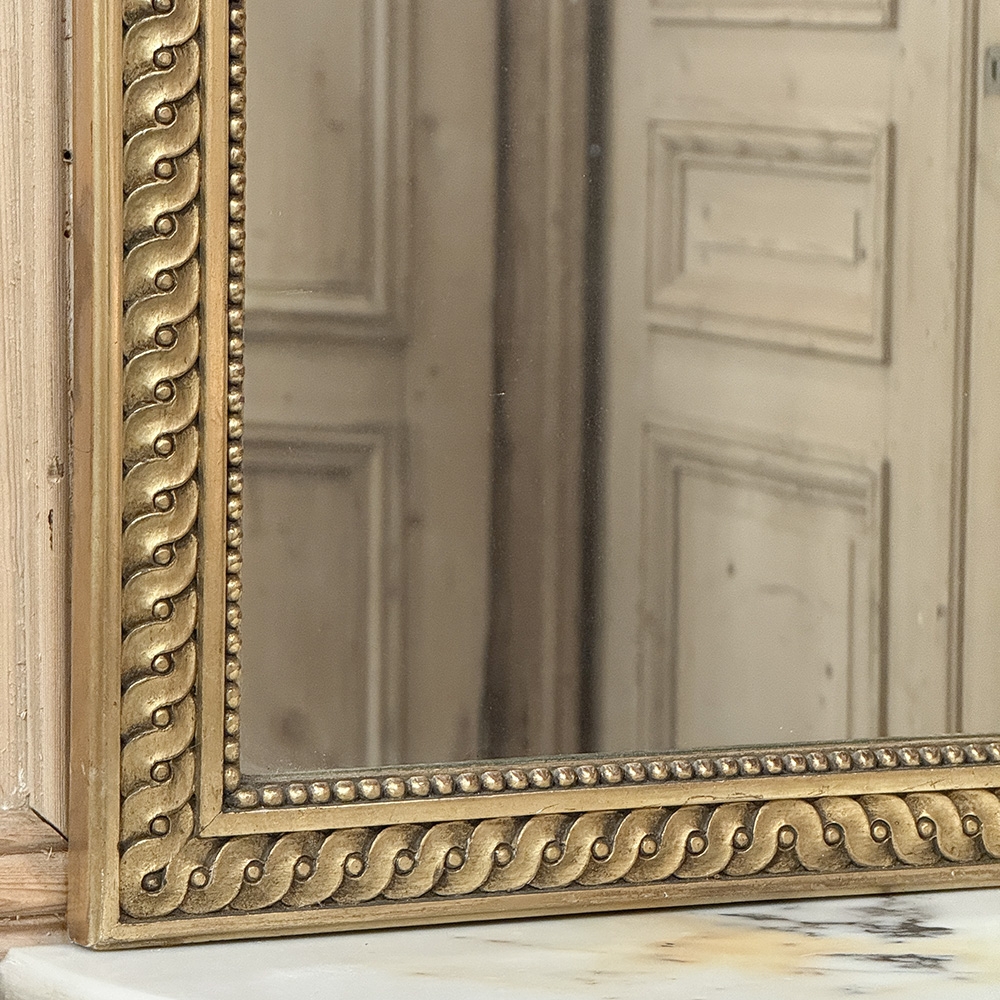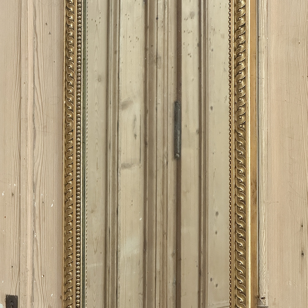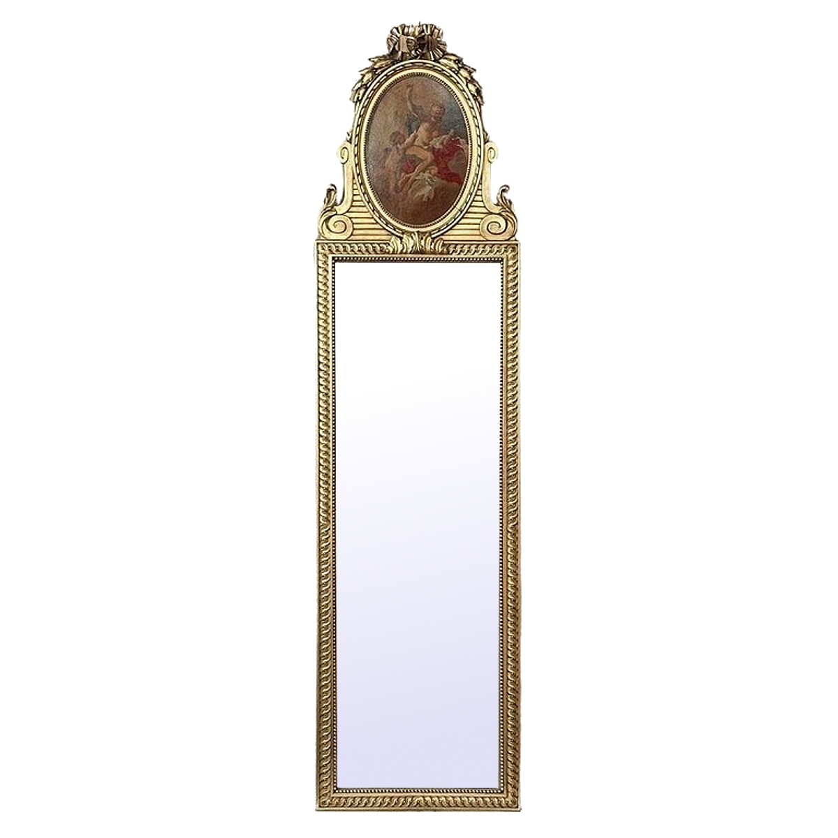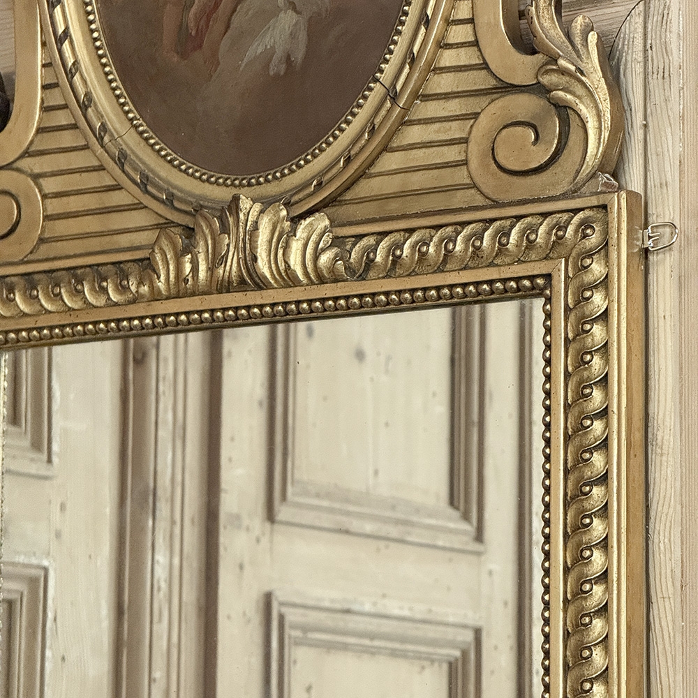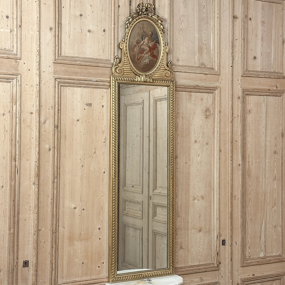 Antique French Louis XVI Gilded Trumeau Mirror is ideal for narrow wall spaces, entryways or halls. These are especially good choices for stairwell landings, as well. This example features classical style inspired by the ancient Greeks and Romans, with an oval painting at the top depicting the Goddess Diana attended by a cherub, surrounded in a lavish frame that includes carved ribbon and laurel sprays, mounted with scrollwork and jalouses. The mirror just underneath boasts a triple border molding including Greek coin and beading, with foliate flourish. If you act fast, the original matching demilune marble top console is available as of this writing, viewable by clicking on Related Products below left.