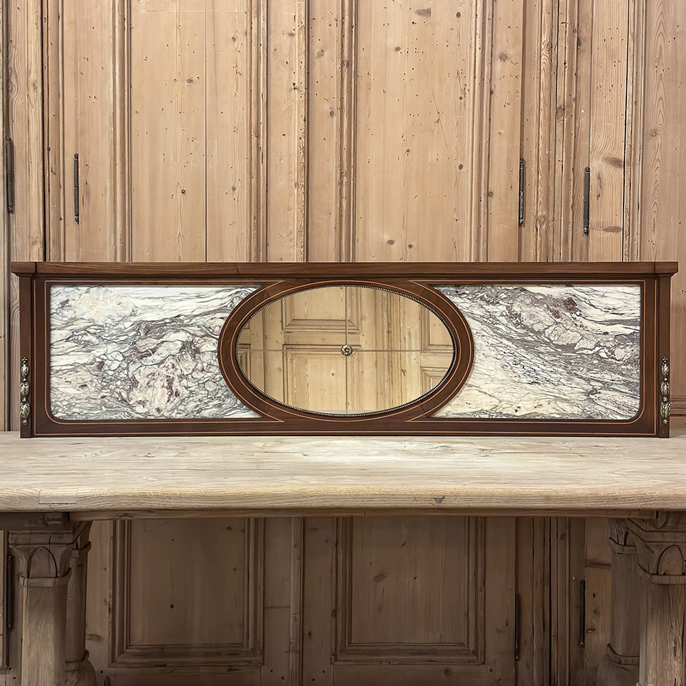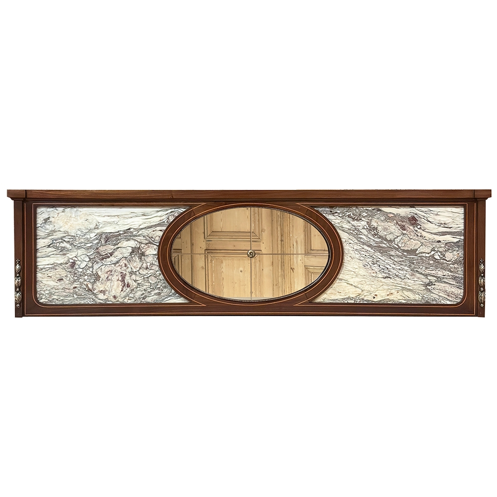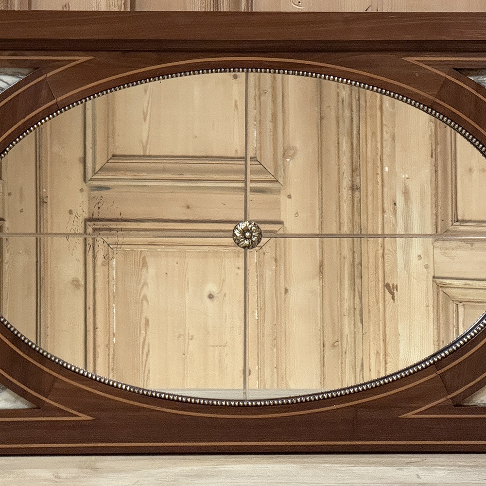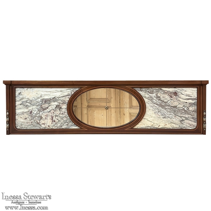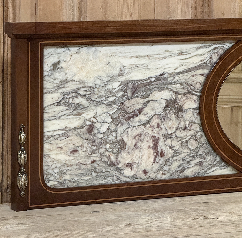 SaleFINAL SALE! Antique French Louis XVI Neoclassical Mantel Mirror with Marble & Bronze Mounts is the perfect choice for tall mantels, broad surfaces, over cased openings, and more. Hand-crafted from solid walnut, the frame exhibits architecture influenced by the ancient classical Greek & Roman designs, and features a French border of inlaid brass around the three focal elements which consist of the oval mirror at the center flanked by two luxuriously veined marble panels. Additional embellishments include a rosette centered on the mirror and laurels on the right and left sides flanking the marble panels. Truly a timeless look you can enjoy for many decades to come!