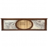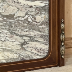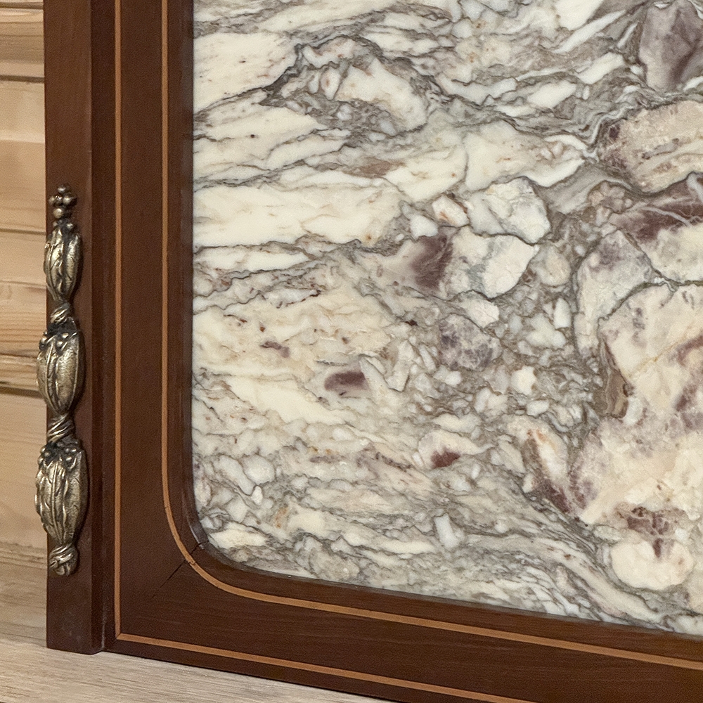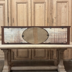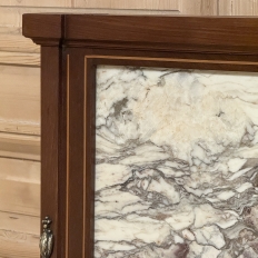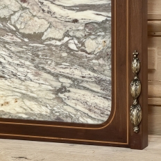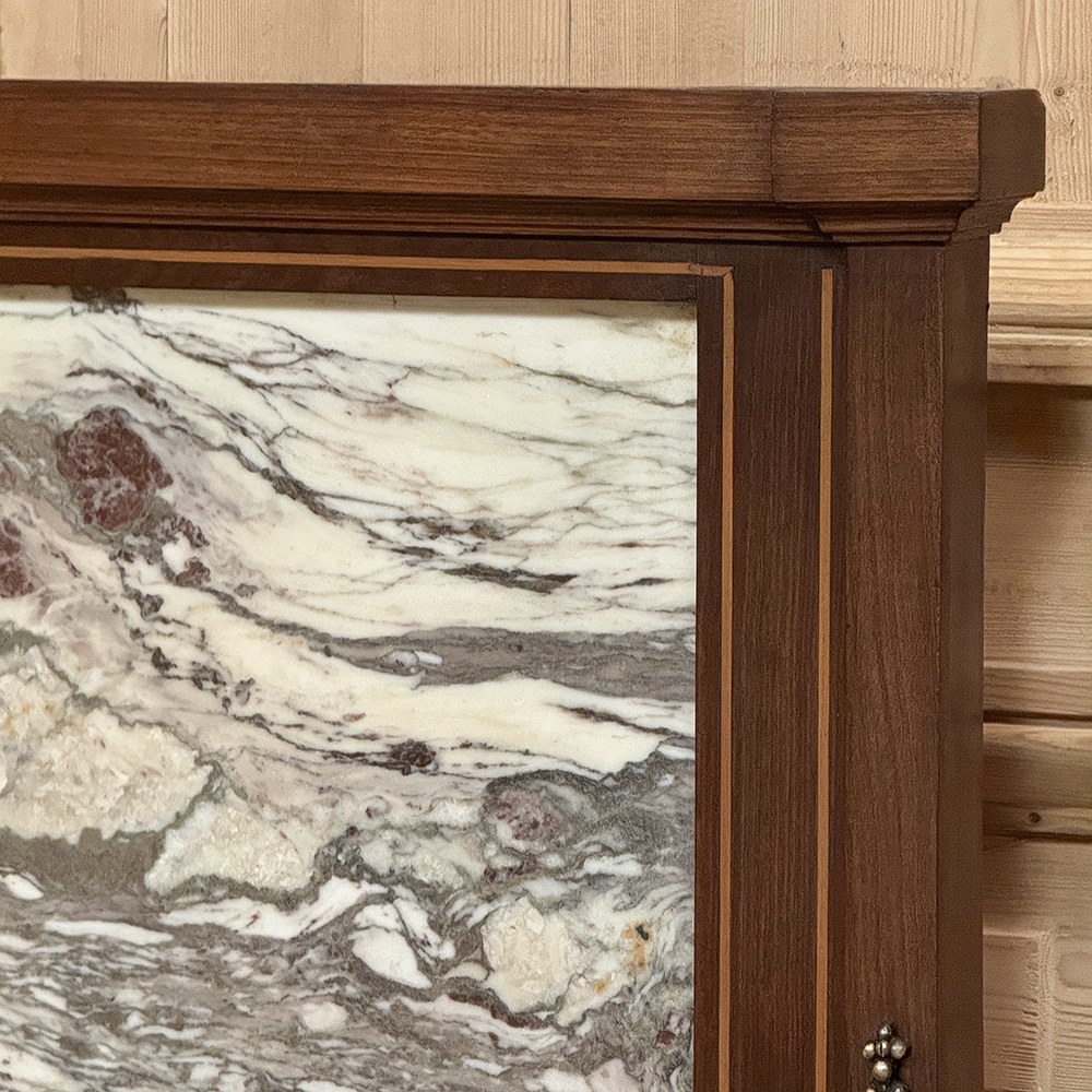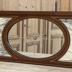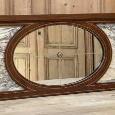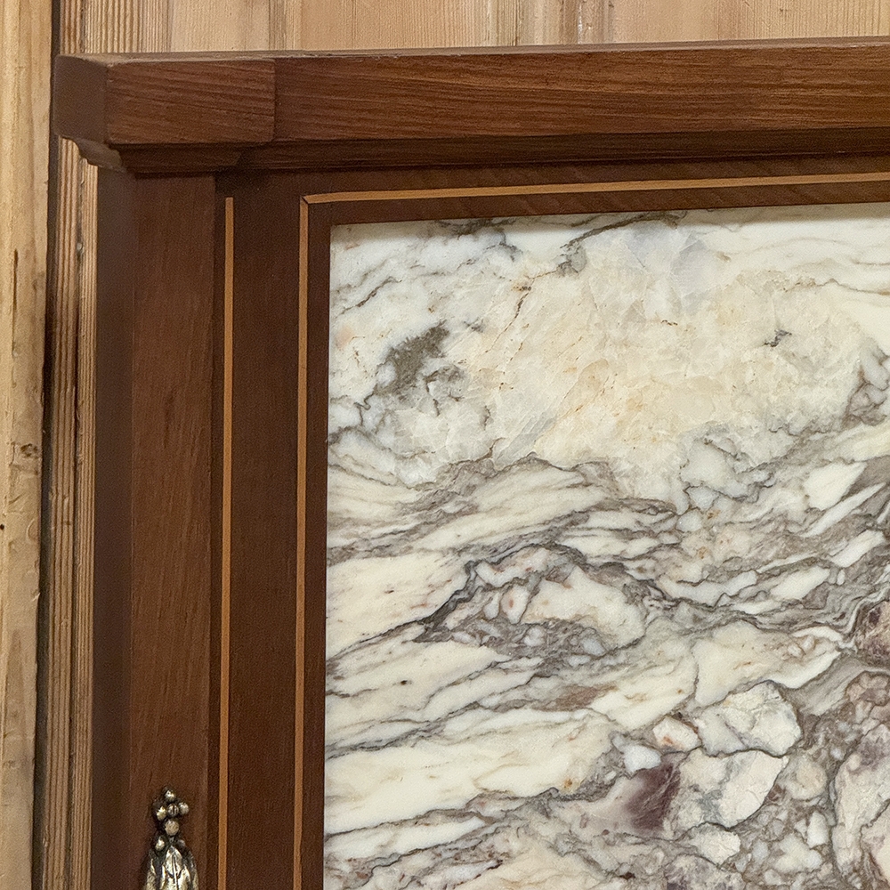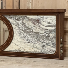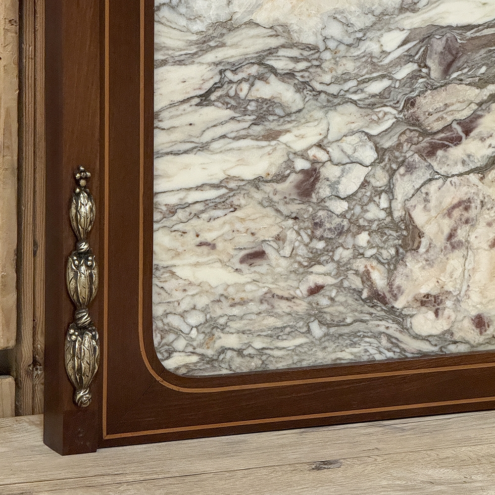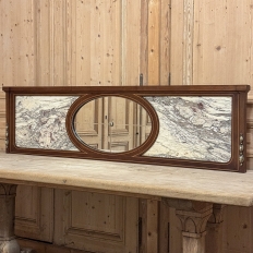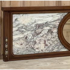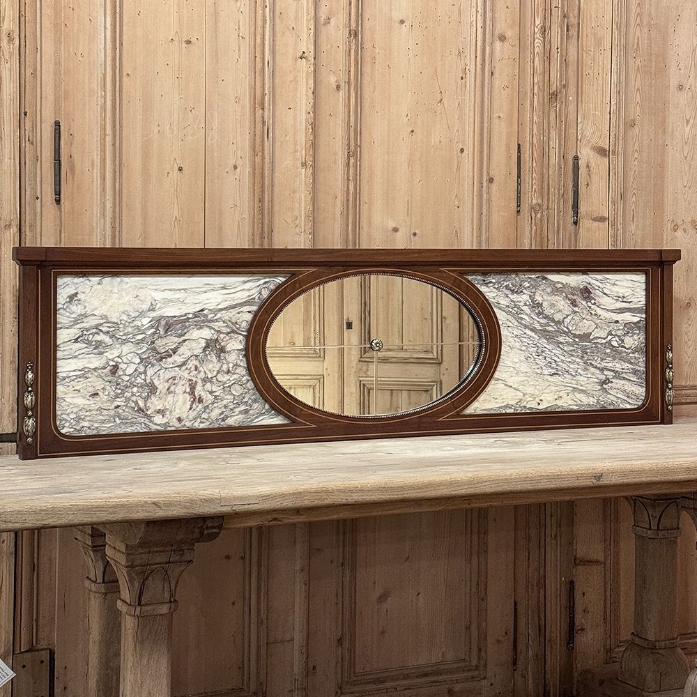 SaleFINAL SALE! Antique French Louis XVI Neoclassical Mantel Mirror with Marble & Bronze Mounts is the perfect choice for tall mantels, broad surfaces, over cased openings, and more. Hand-crafted from solid walnut, the frame exhibits architecture influenced by the ancient classical Greek & Roman designs, and features a French border of inlaid brass around the three focal elements which consist of the oval mirror at the center flanked by two luxuriously veined marble panels. Additional embellishments include a rosette centered on the mirror and laurels on the right and left sides flanking the marble panels. Truly a timeless look you can enjoy for many decades to come!