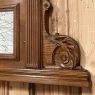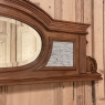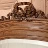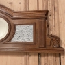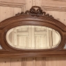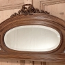 Antique French Louis XVI Walnut Mantel Mirror with Marble Insets is a unique way to dress up your mantel, a counter, or any surface against a wall! The neoclassical architecture includes a broad arch at the center topped with hand-carved ribbon tied in a bow, cascading down the shoulders on each side and appearing over the oval French beveled mirror. The molding detail extends outwards and encompasses two marble insets, with carved acanthus leaves appearing on the corbels on each side. Boldly molded base means it can either hang freely or simply sit right on the surface to provide beauty and a nice reflection of your room for all to enjoy!