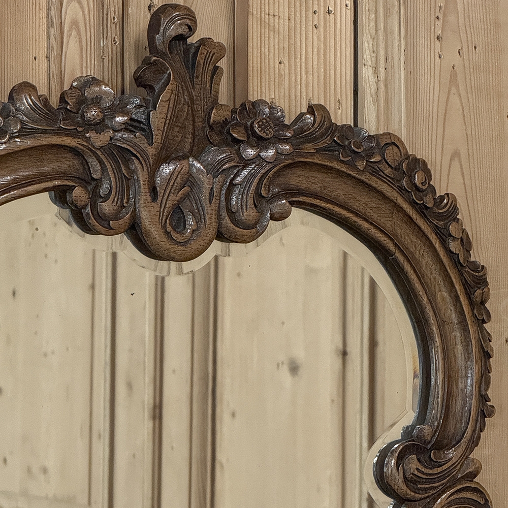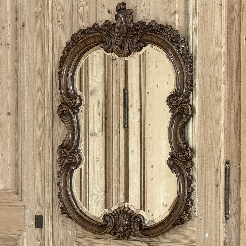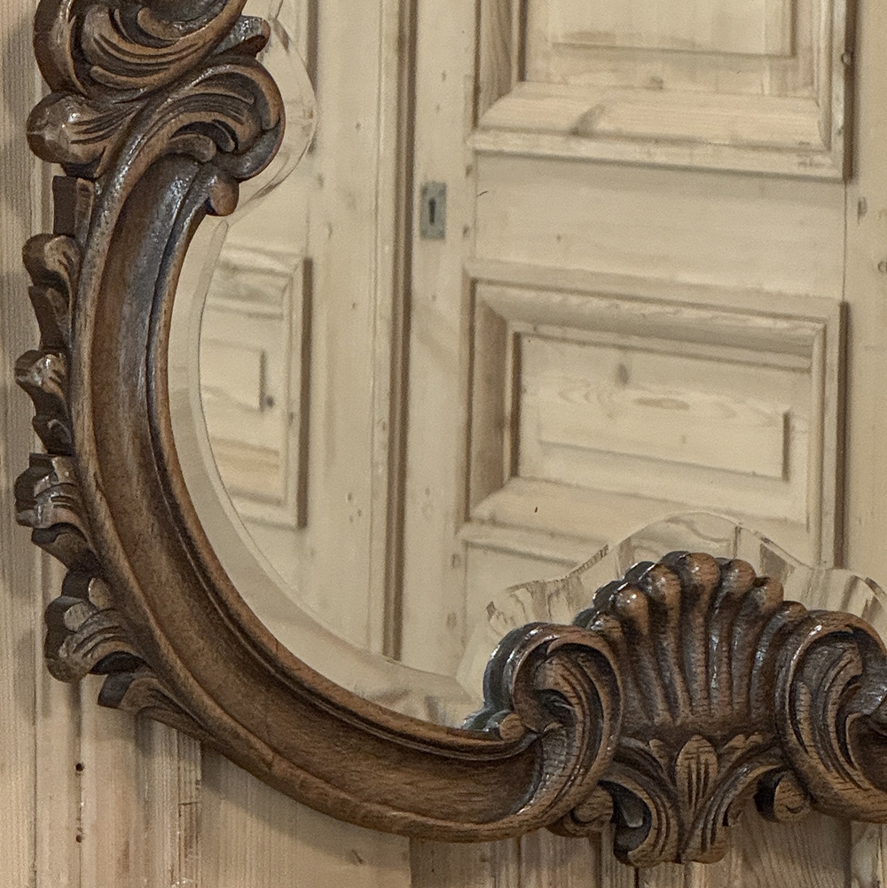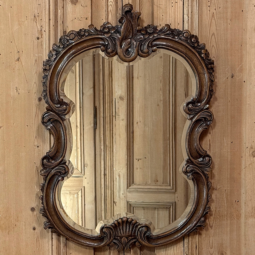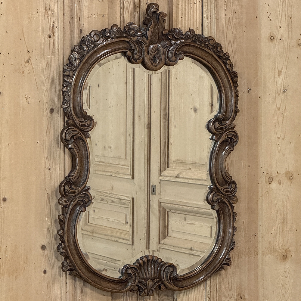 Antique Hand-Carved Italian Rococo Wall Mirror is a wonderful expression of the wood carver's art! Rendered from solid old-growth oak, it features a curvaceous frame and asymmetrical crown embellishment complemented by the symmetrical remainder of the undulating frame. Although the crown carving features a naturalistic foliate design, the base is a shell in the form of a crown for balance. Florals cascade down the curves of the upper shoulders, while more foliates rise up to meet them on the lower curves of the frame, all of which surround the beveled mirror for a splendid combination.