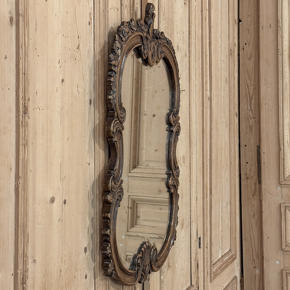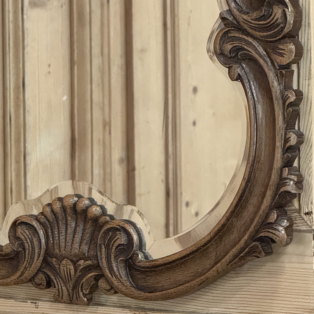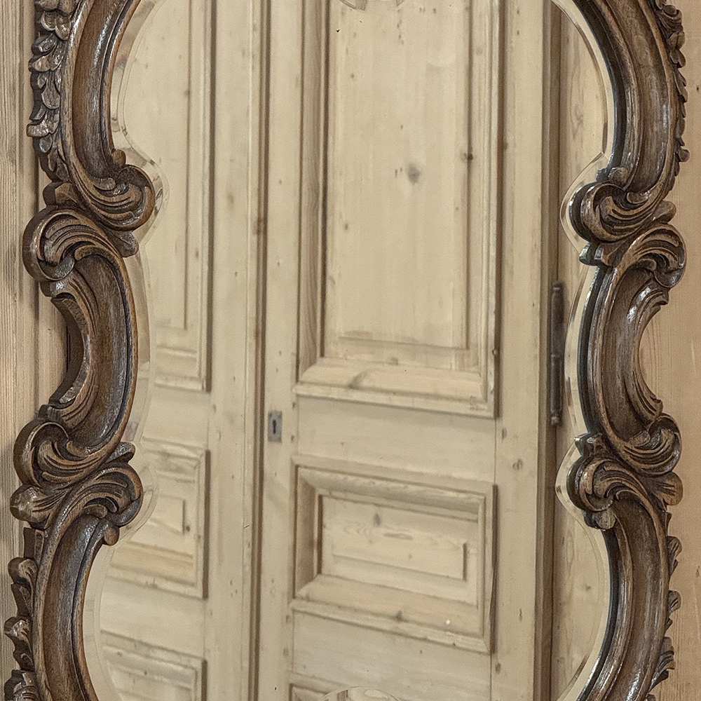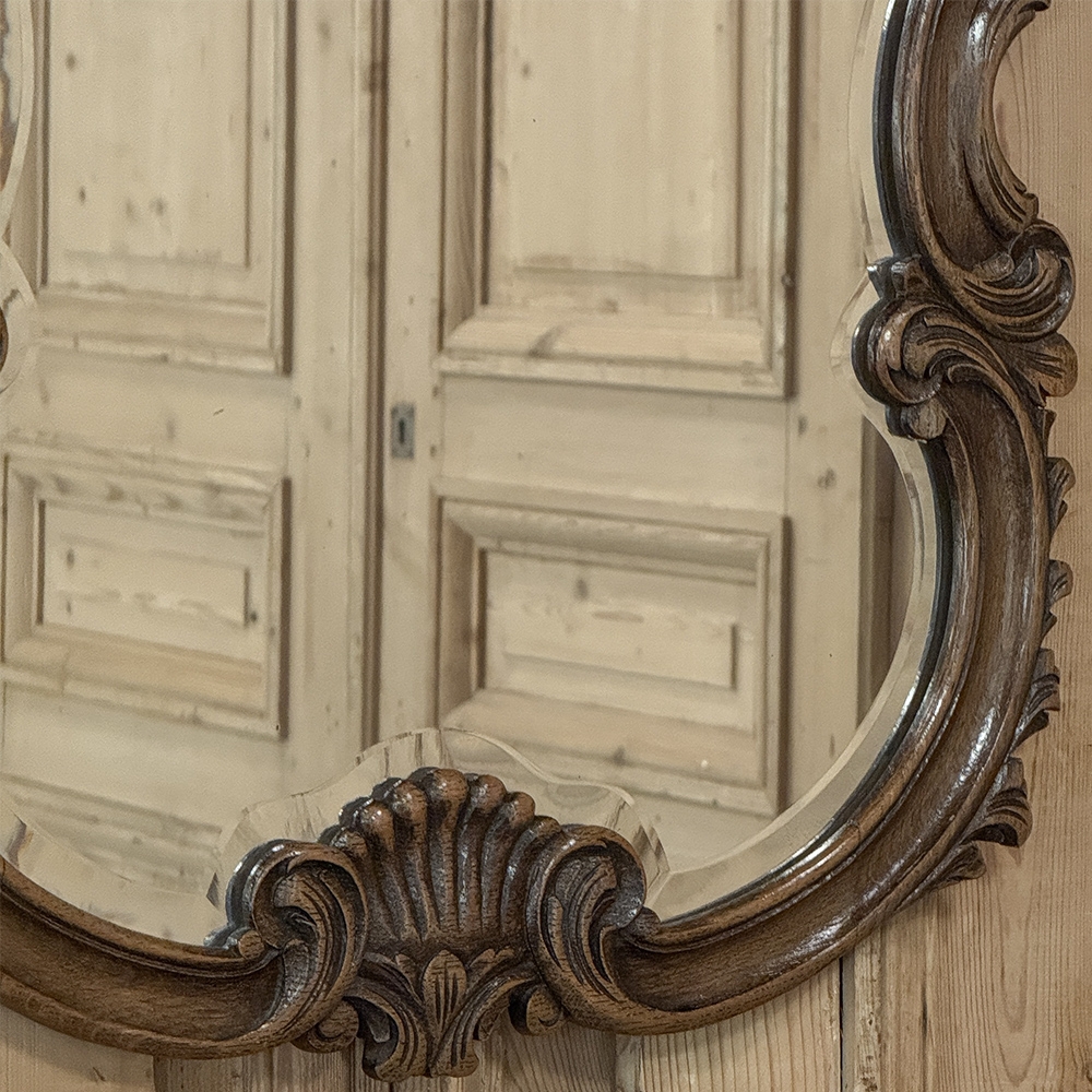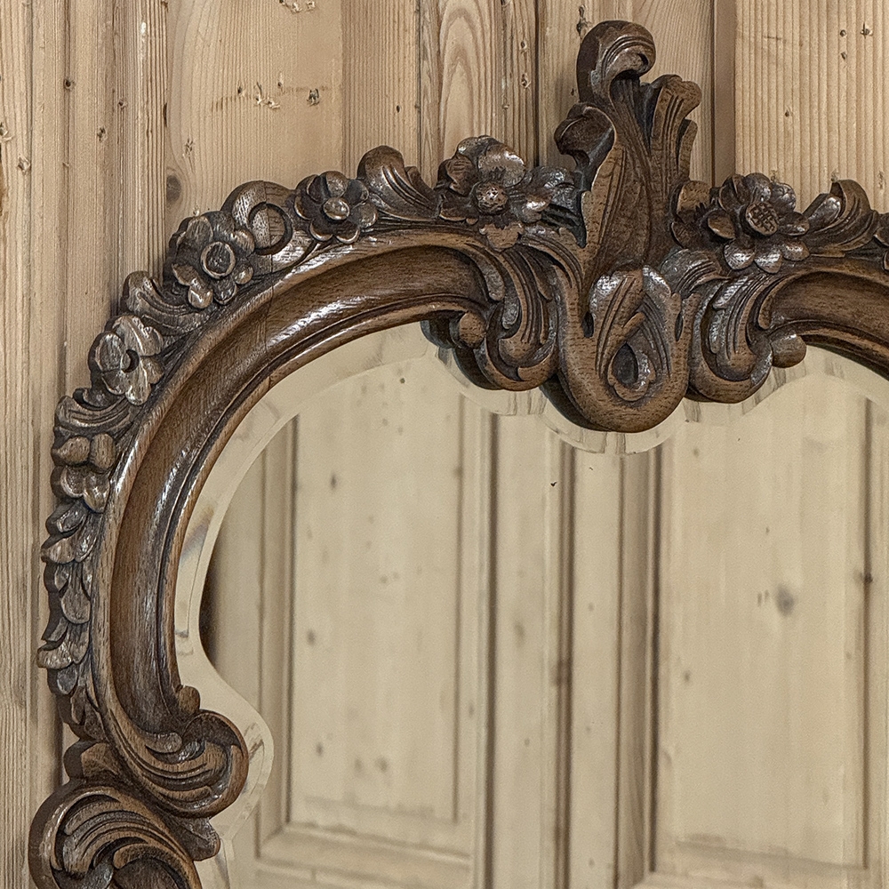 Antique Hand-Carved Italian Rococo Wall Mirror is a wonderful expression of the wood carver's art! Rendered from solid old-growth oak, it features a curvaceous frame and asymmetrical crown embellishment complemented by the symmetrical remainder of the undulating frame. Although the crown carving features a naturalistic foliate design, the base is a shell in the form of a crown for balance. Florals cascade down the curves of the upper shoulders, while more foliates rise up to meet them on the lower curves of the frame, all of which surround the beveled mirror for a splendid combination.