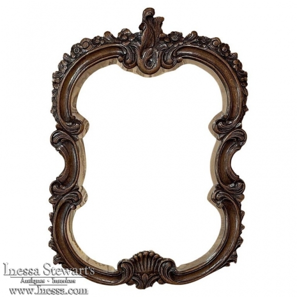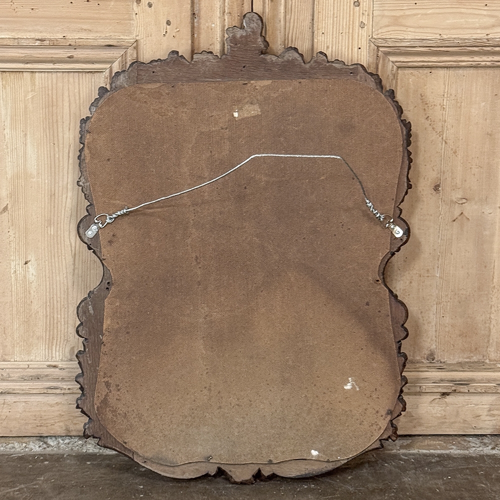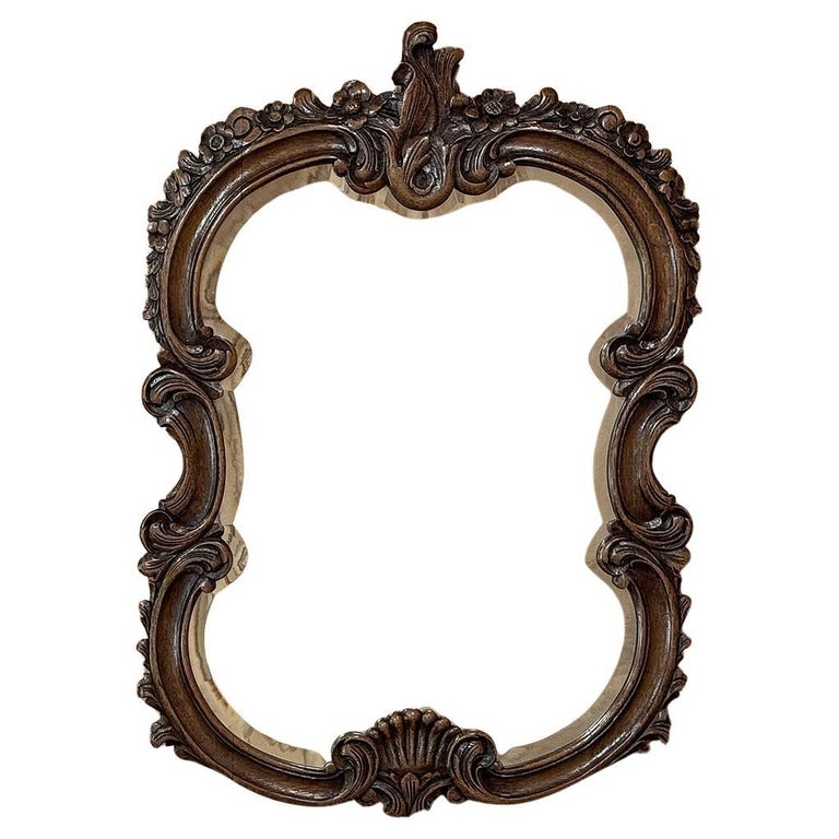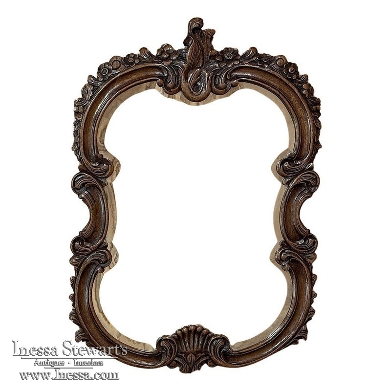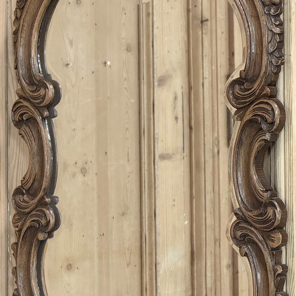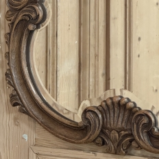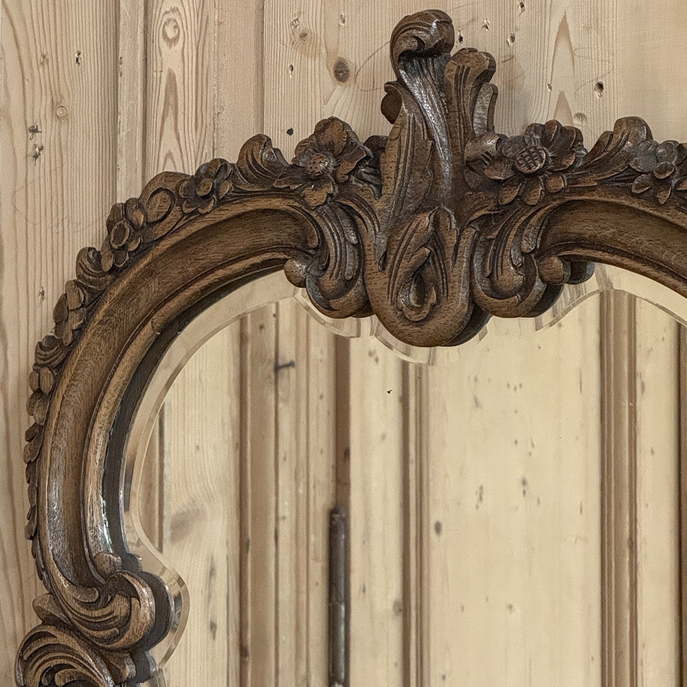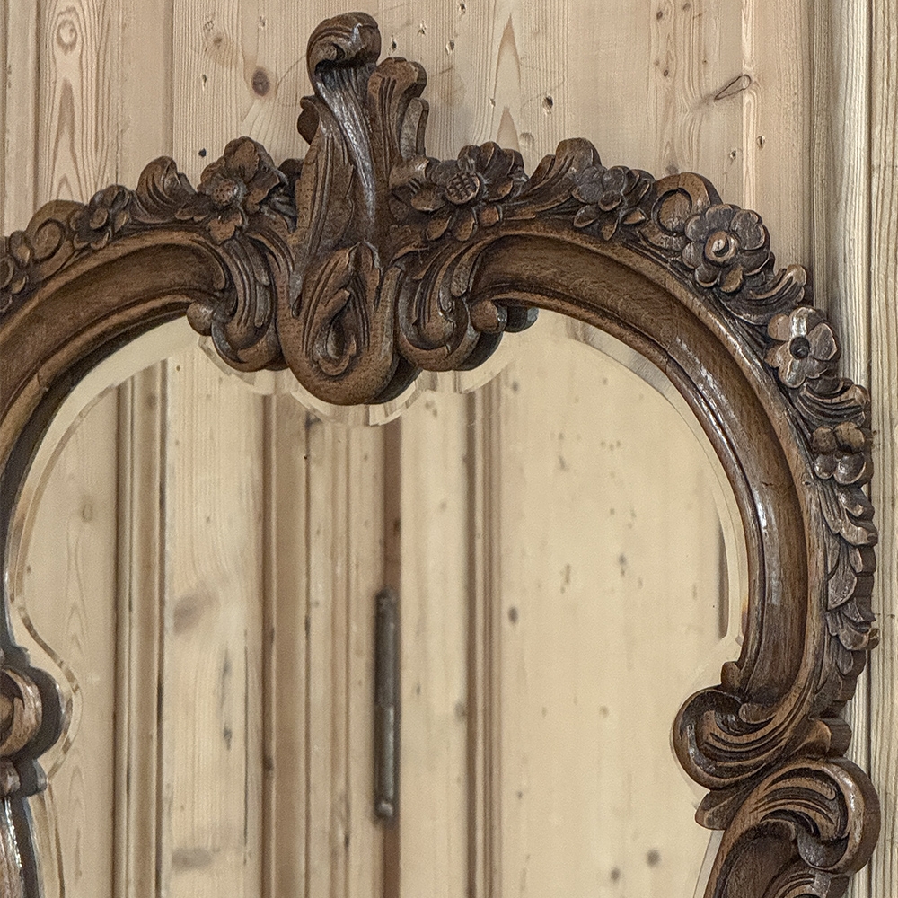 Antique Hand-Carved Italian Rococo Wall Mirror is a wonderful expression of the wood carver's art! Rendered from solid old-growth oak, it features a curvaceous frame and asymmetrical crown embellishment complemented by the symmetrical remainder of the undulating frame. Although the crown carving features a naturalistic foliate design, the base is a shell in the form of a crown for balance. Florals cascade down the curves of the upper shoulders, while more foliates rise up to meet them on the lower curves of the frame, all of which surround the beveled mirror for a splendid combination.