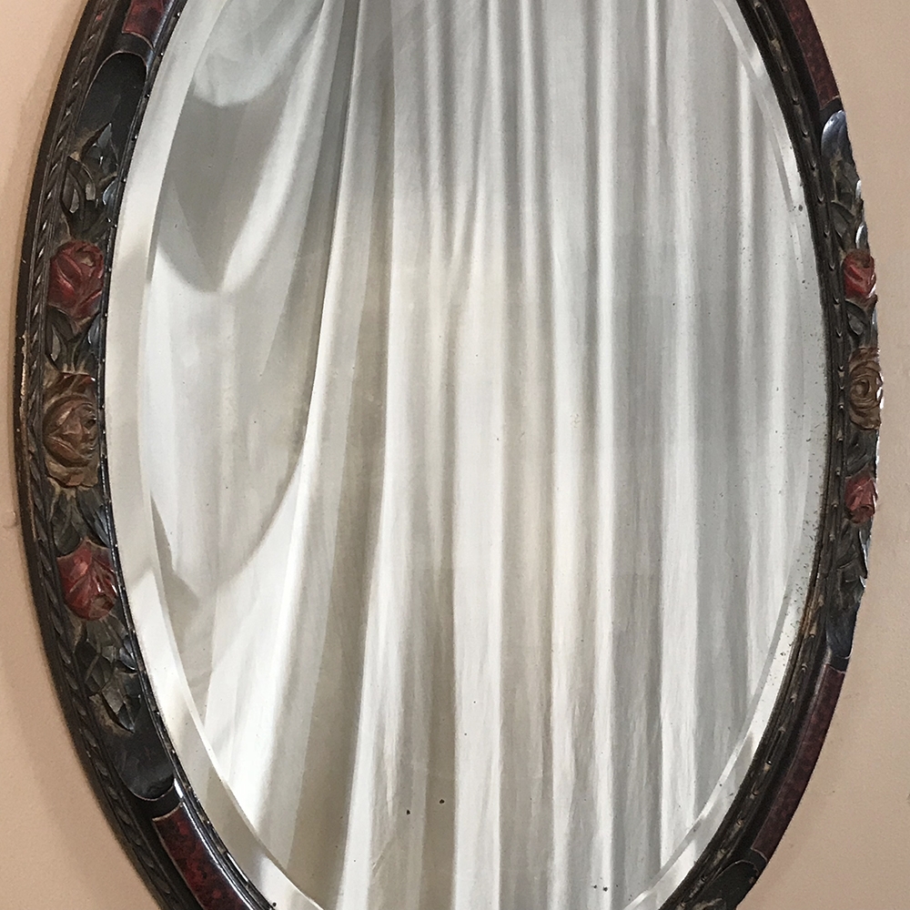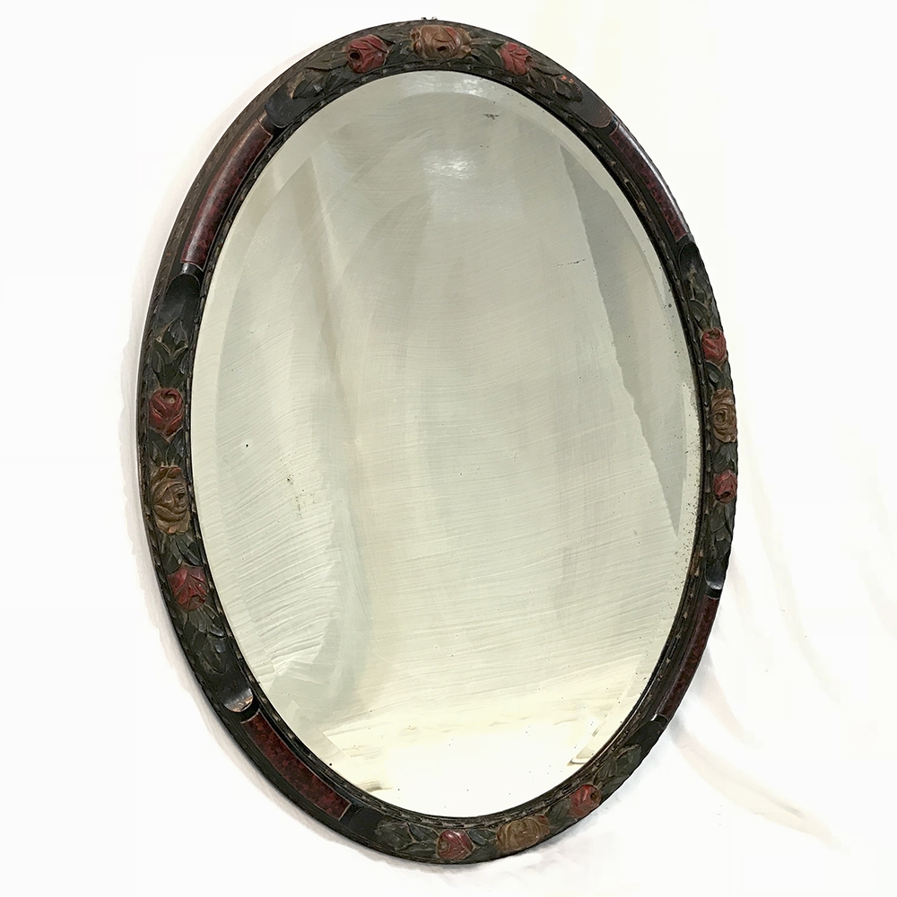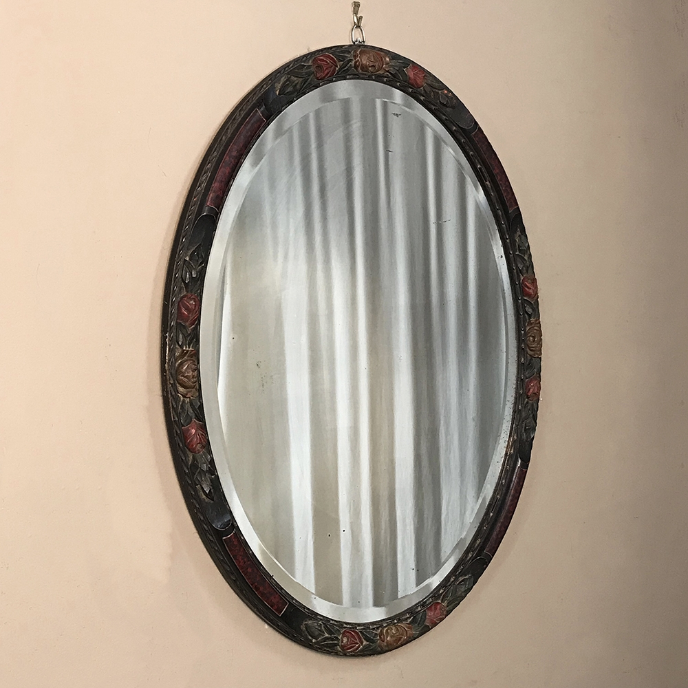 Antique Hand Painted French Oval Mirror with beveled glass is perfect for any room, powder room, or any niche that needs clean lines, creating a beautiful accent that magnifies the ambient light in the room! Charming floral carving around the entire framework is highlighted by hand-painted accents, with faux burl panels between the carved sections for added visual appeal. Original beveled mirror has some delightful age spotting which confirms its authenticity and only adds to the charm!