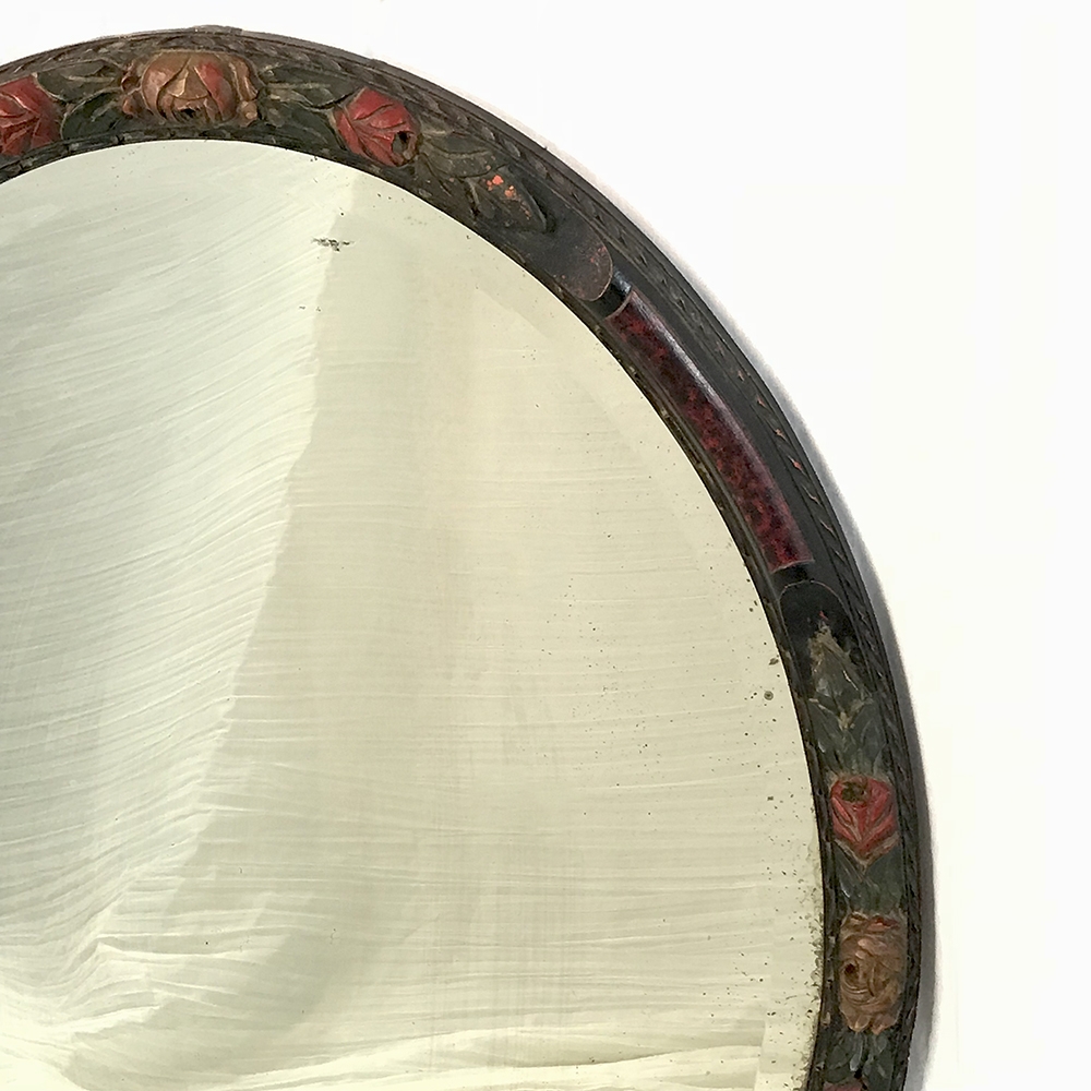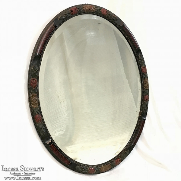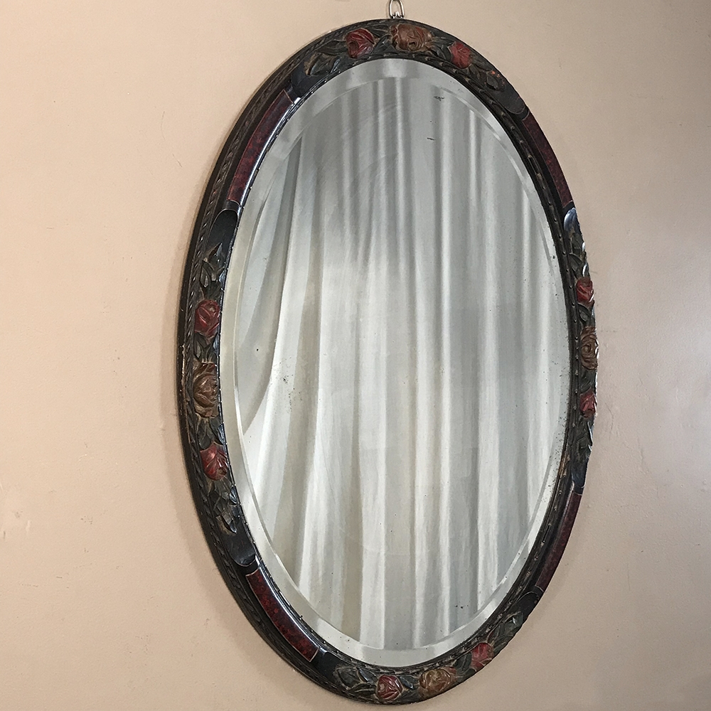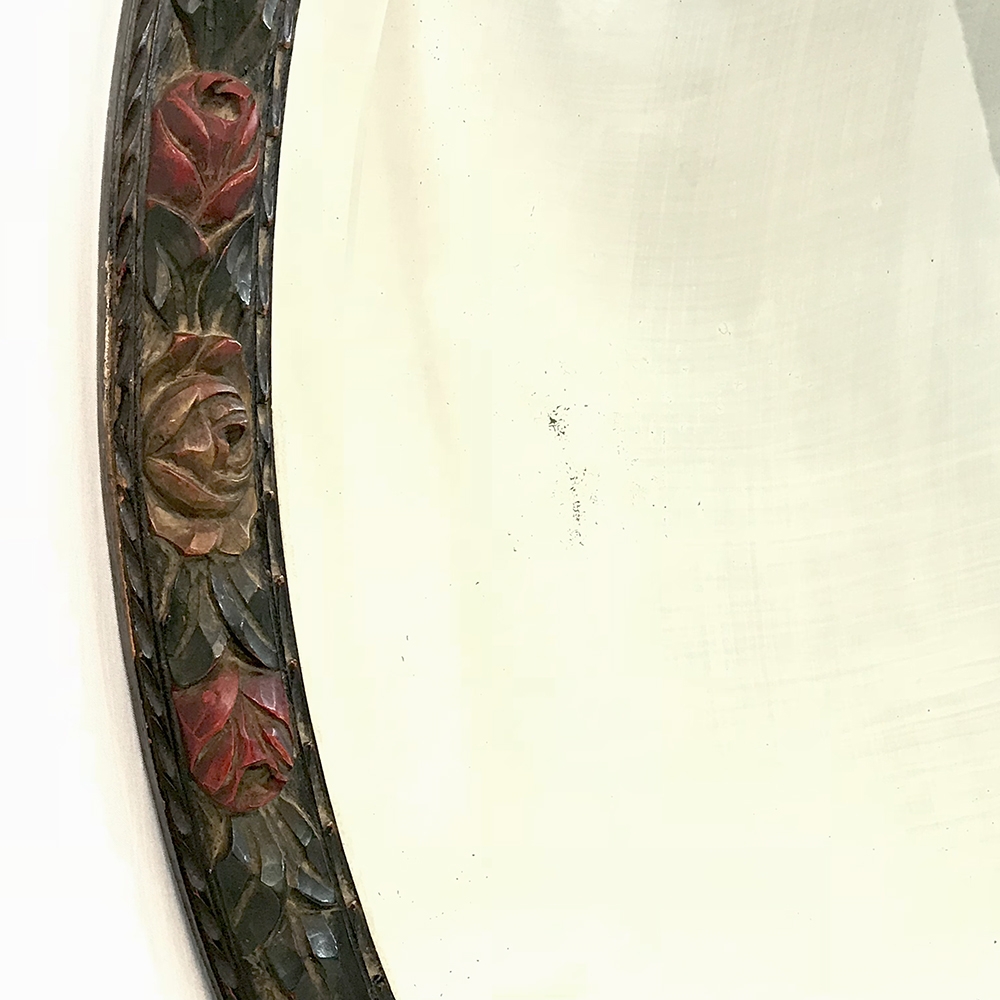 Antique Hand Painted French Oval Mirror with beveled glass is perfect for any room, powder room, or any niche that needs clean lines, creating a beautiful accent that magnifies the ambient light in the room! Charming floral carving around the entire framework is highlighted by hand-painted accents, with faux burl panels between the carved sections for added visual appeal. Original beveled mirror has some delightful age spotting which confirms its authenticity and only adds to the charm!