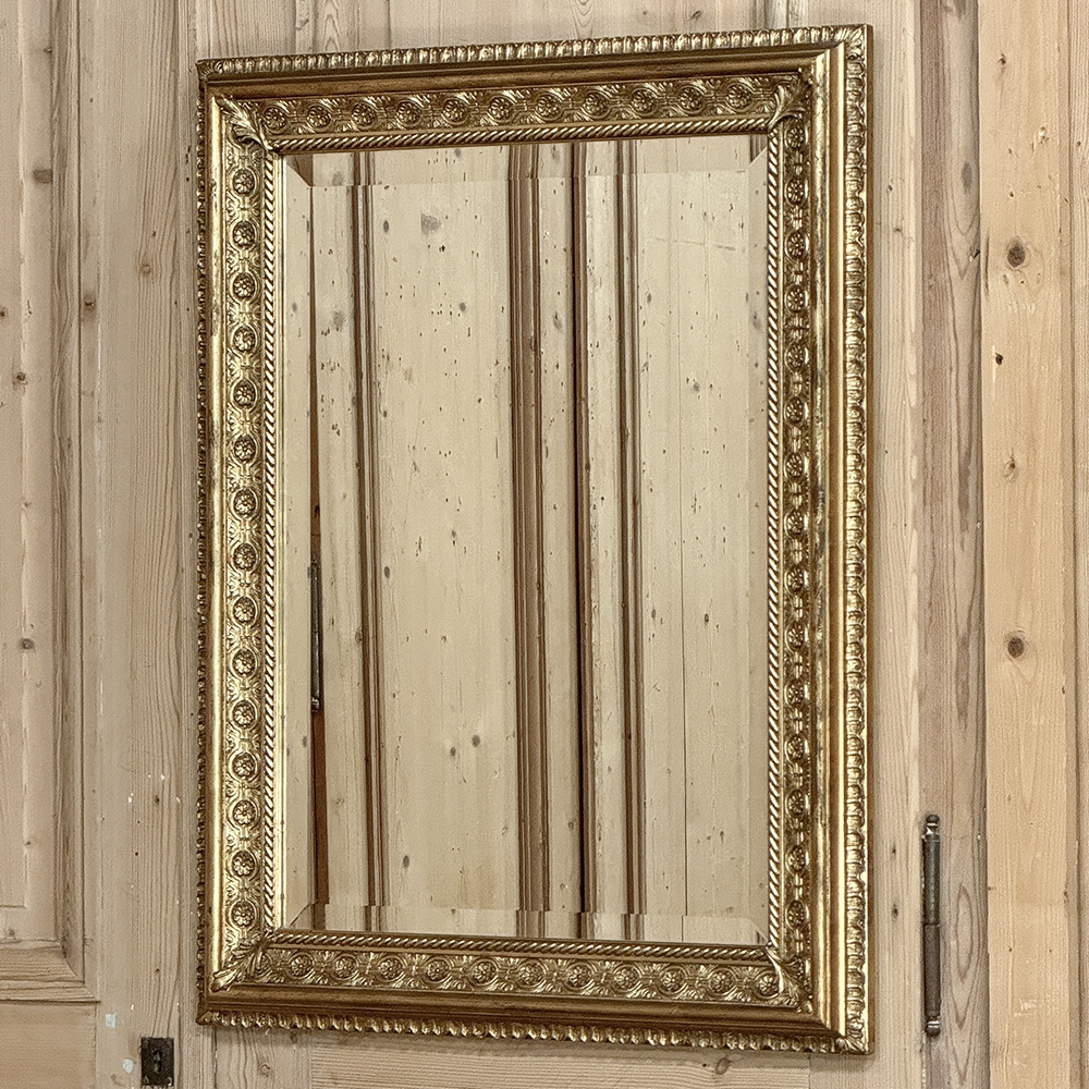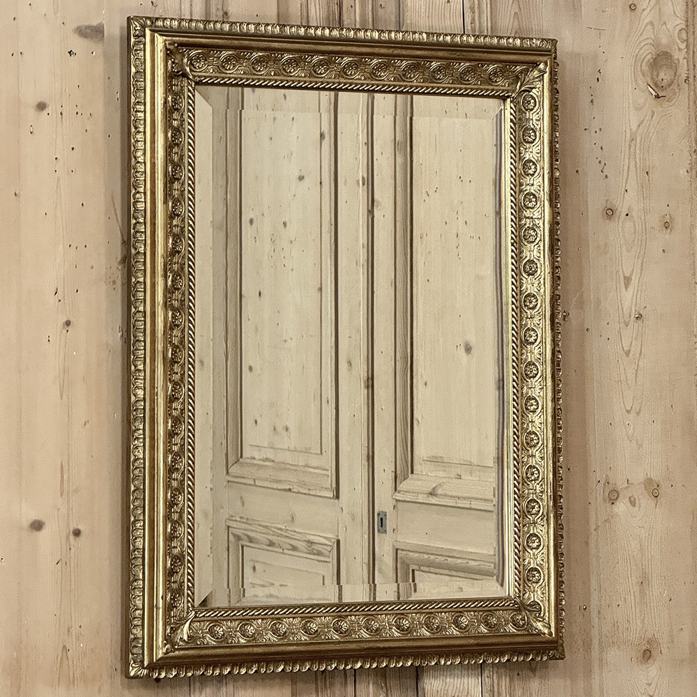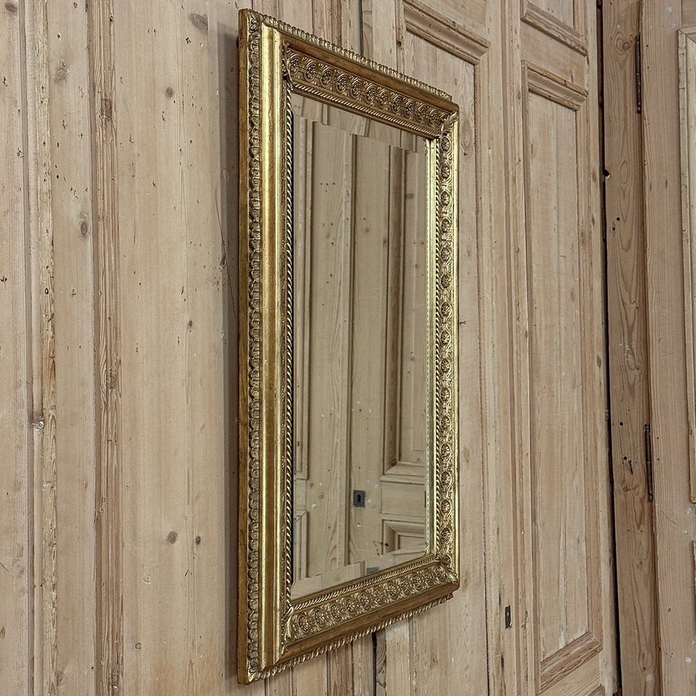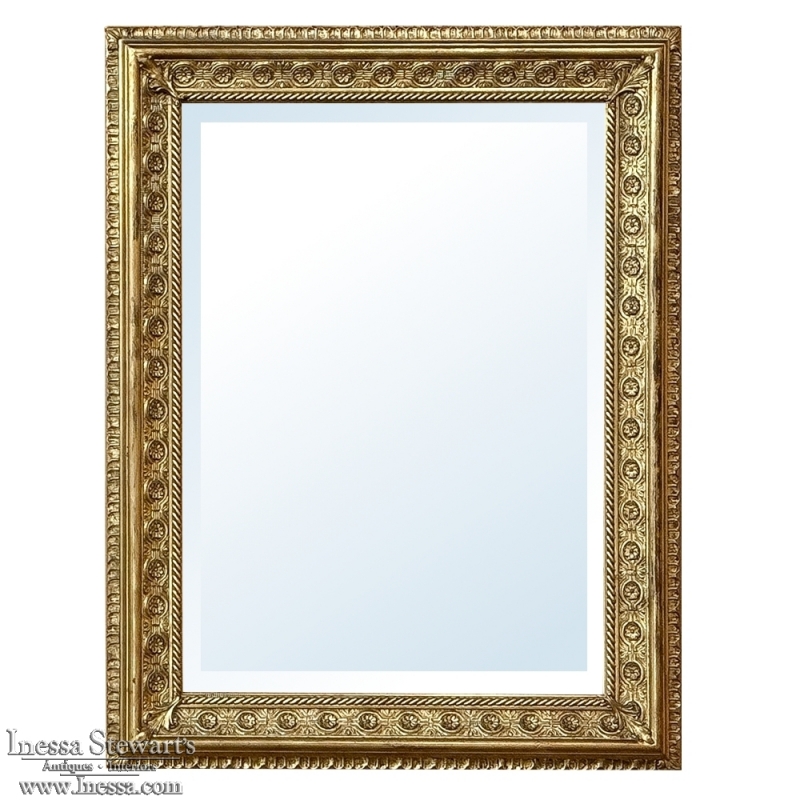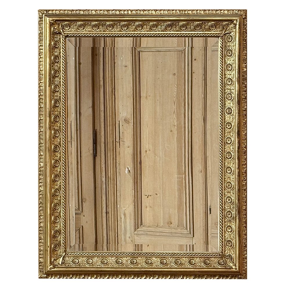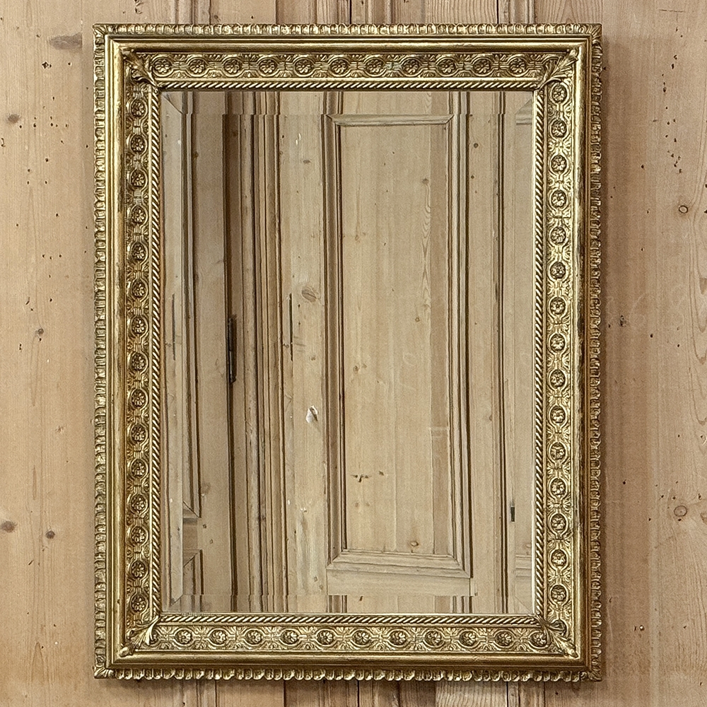 French Louis XVI Giltwood Mirror features a classical design all around so that it can be mounted vertically or horizontally. Perfect for bathrooms, bedrooms, or cozy niches, the motif is the timeless Greek coin with rosettes framed by egg & dart around the outer edge and spiral roping just outside the beveled glass mirror itself.