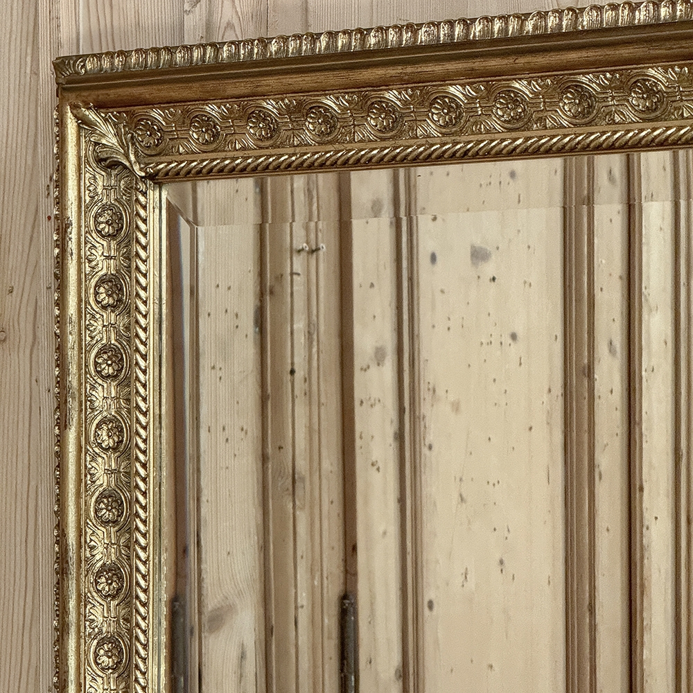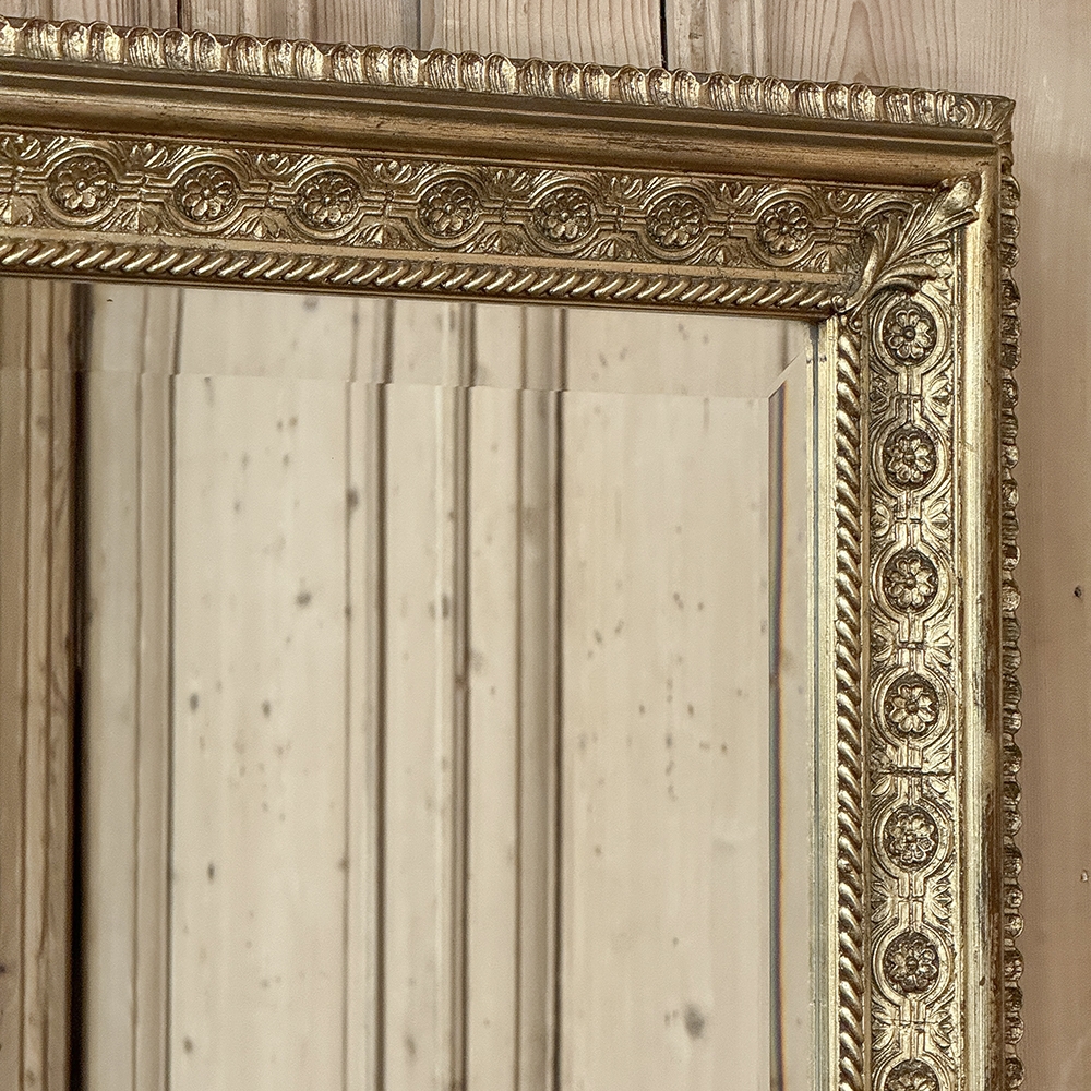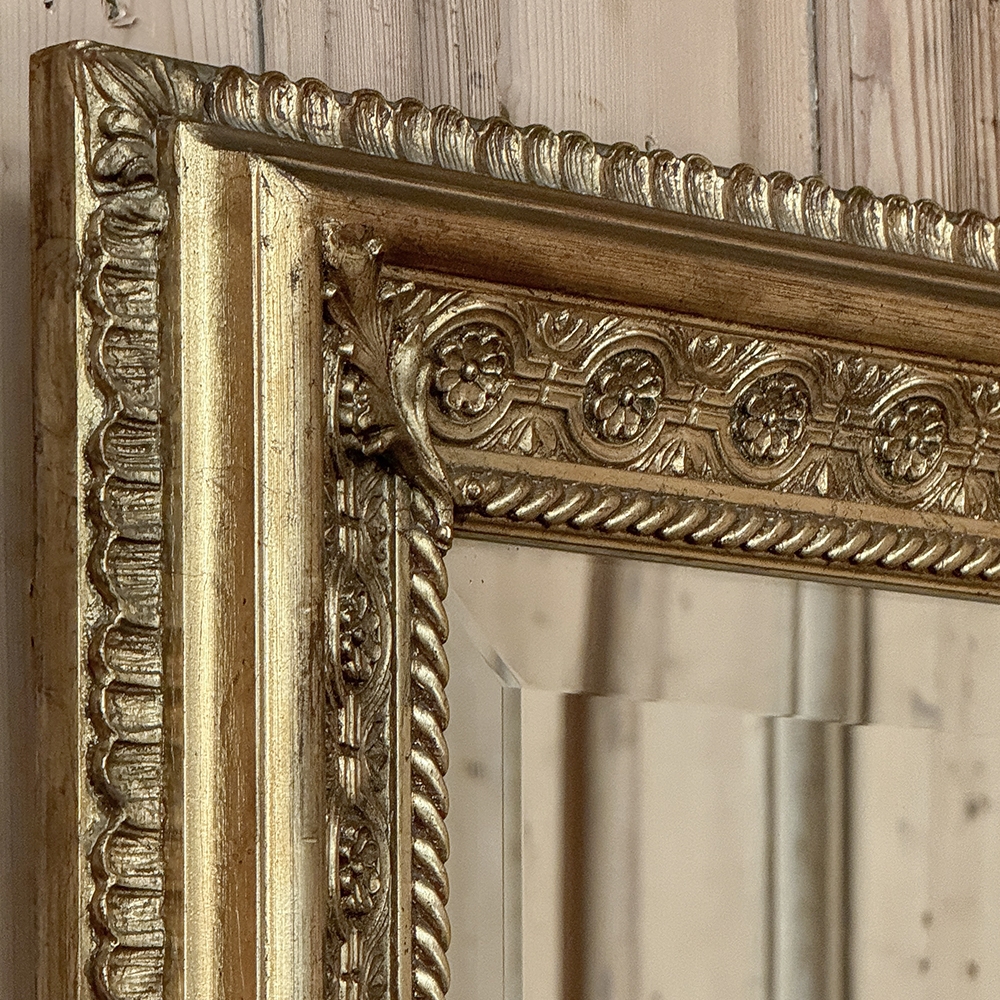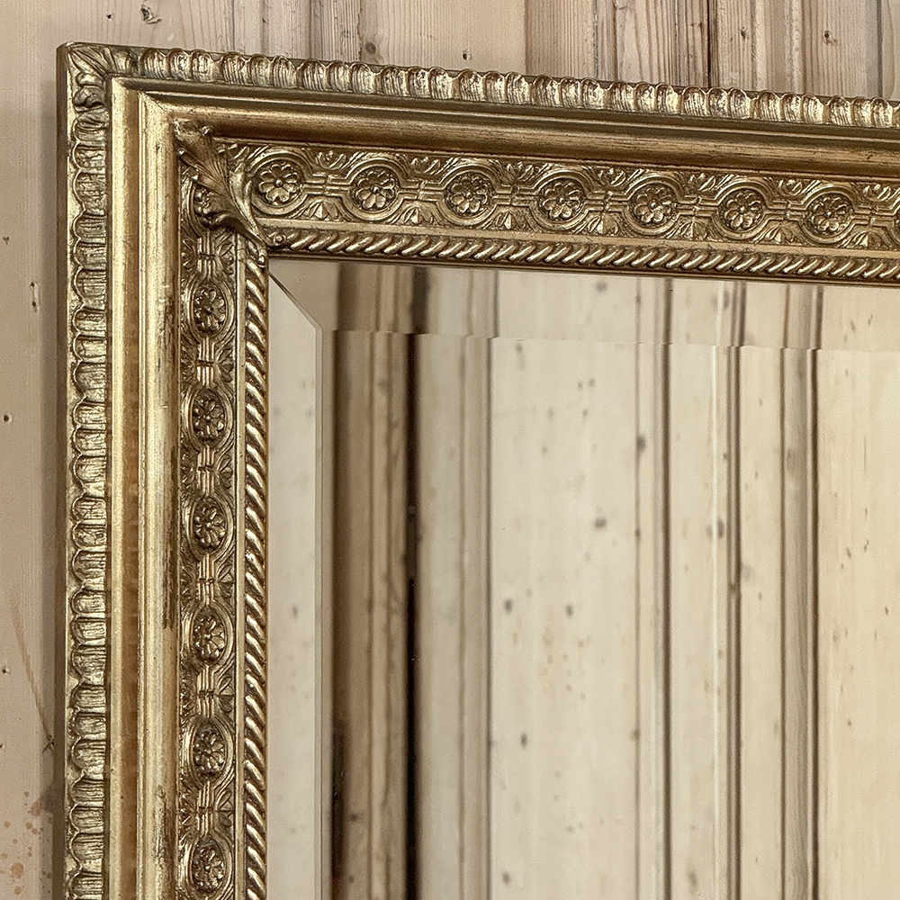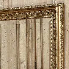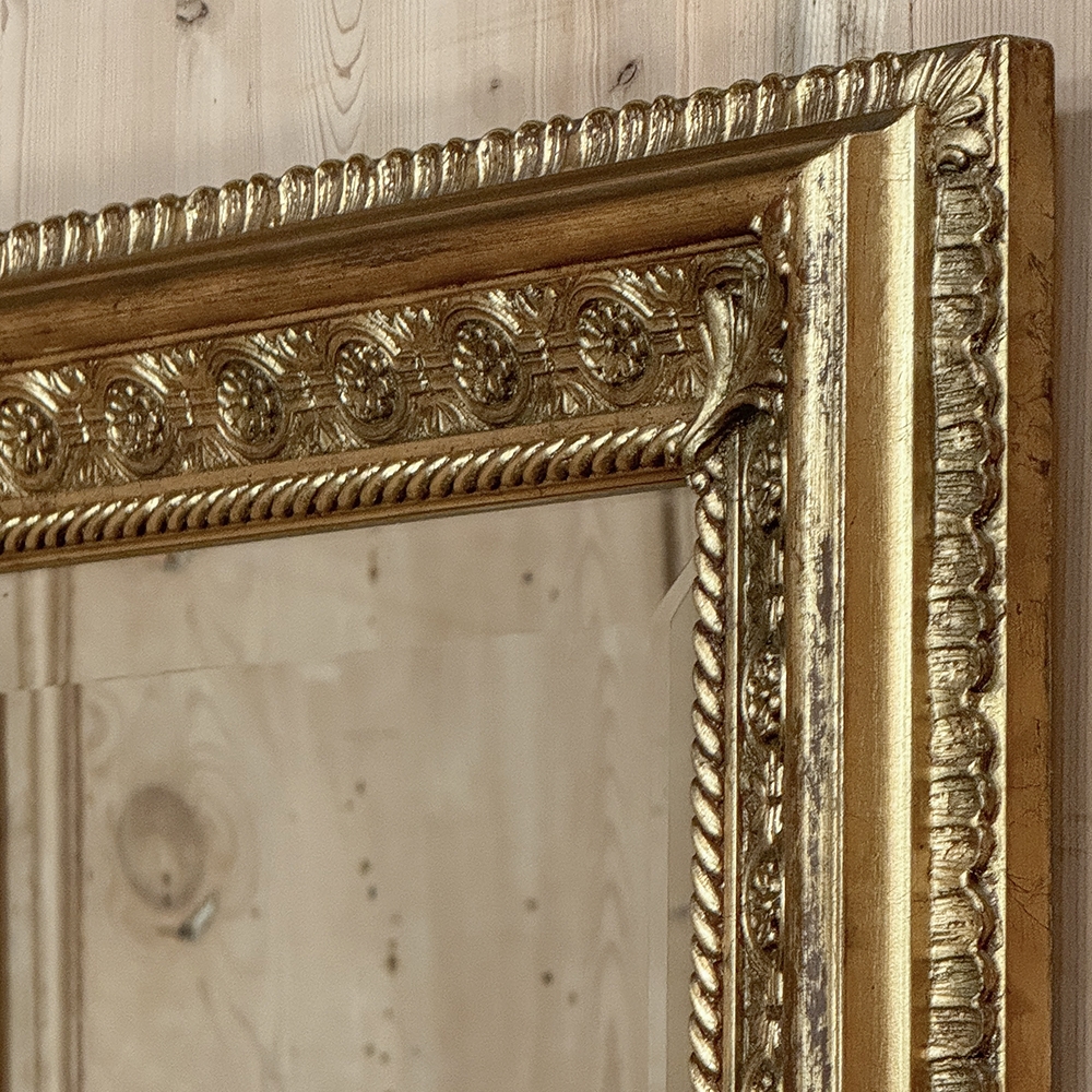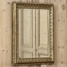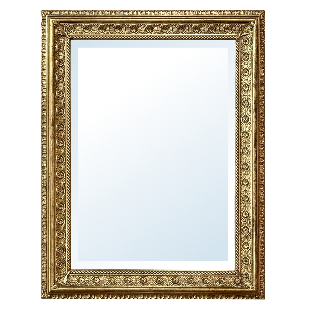 French Louis XVI Giltwood Mirror features a classical design all around so that it can be mounted vertically or horizontally. Perfect for bathrooms, bedrooms, or cozy niches, the motif is the timeless Greek coin with rosettes framed by egg & dart around the outer edge and spiral roping just outside the beveled glass mirror itself.