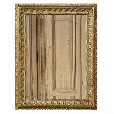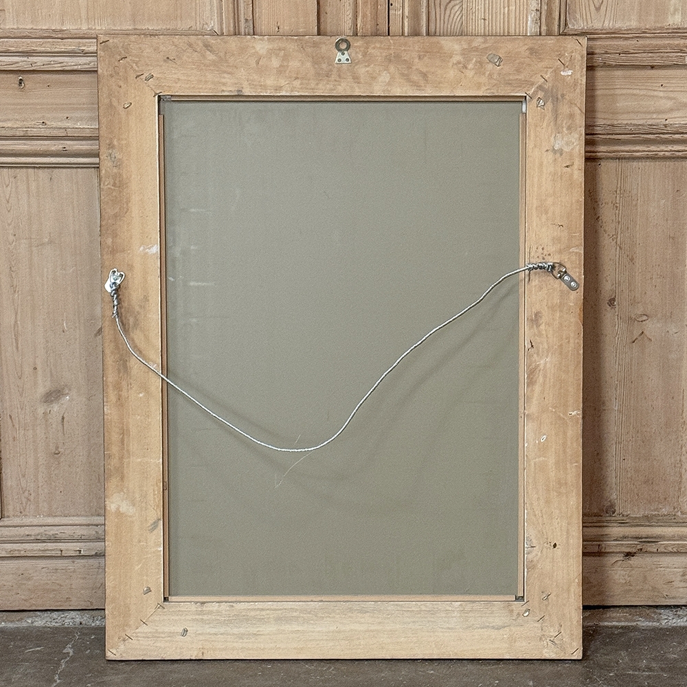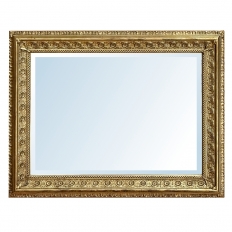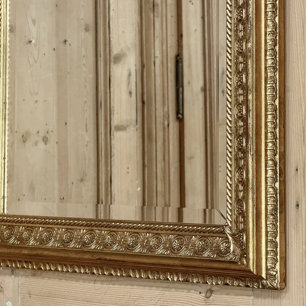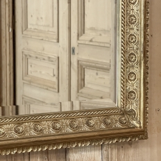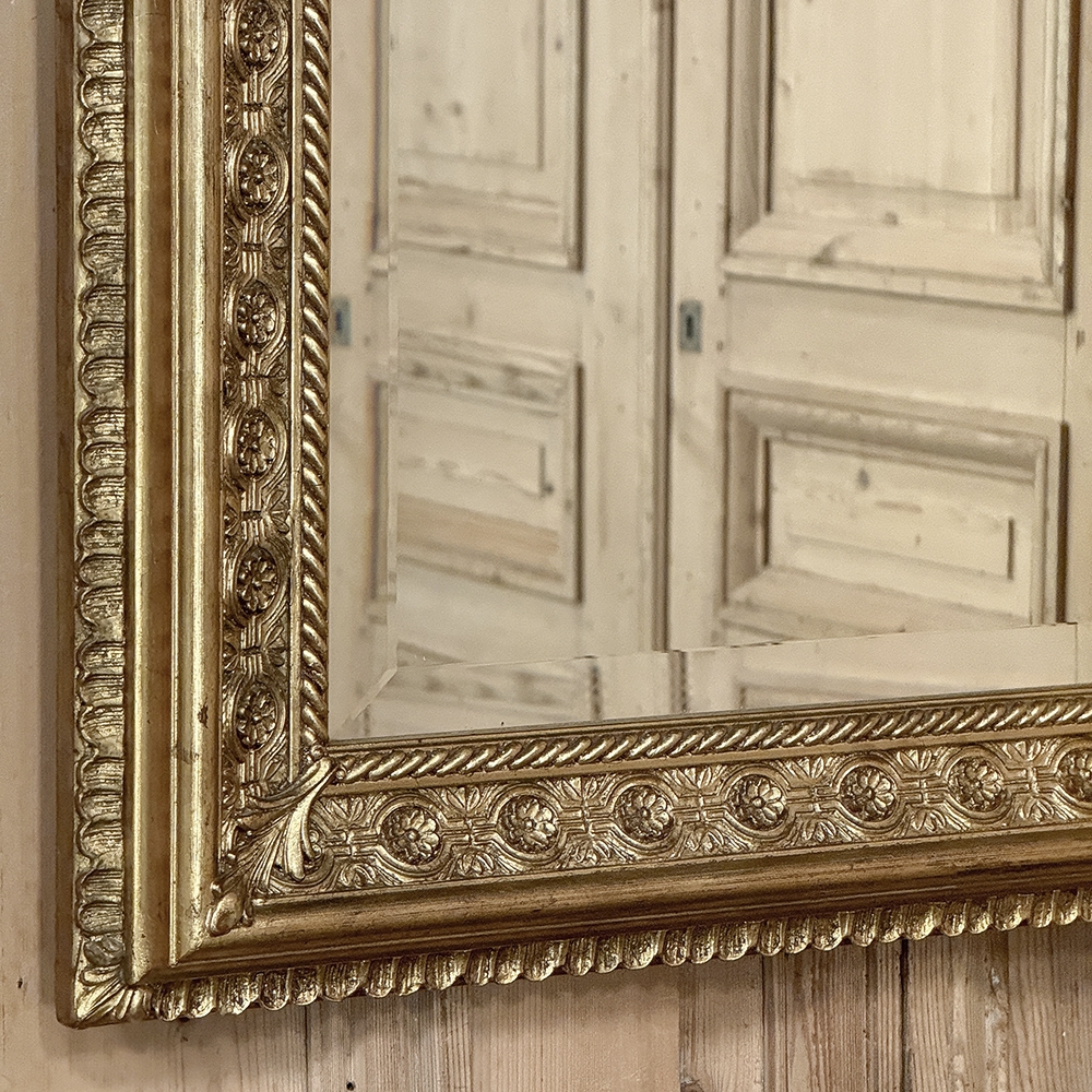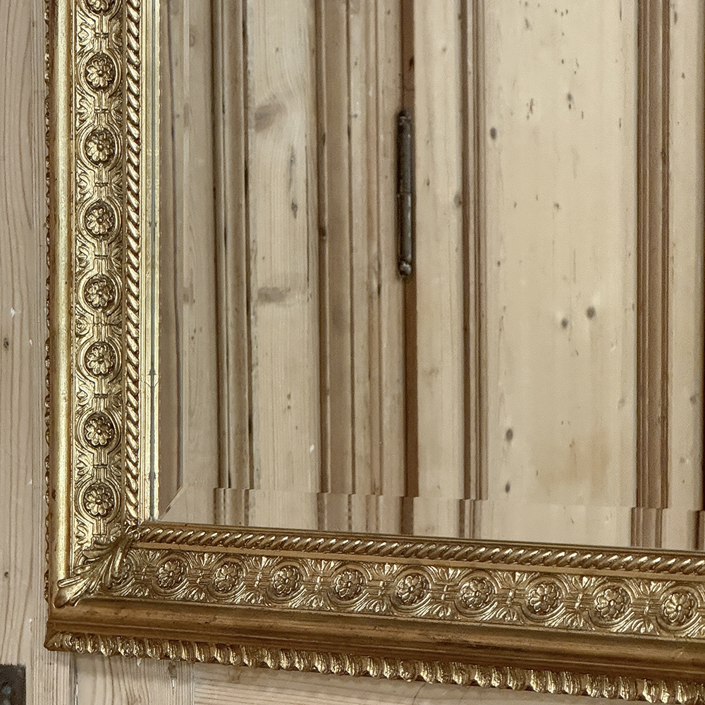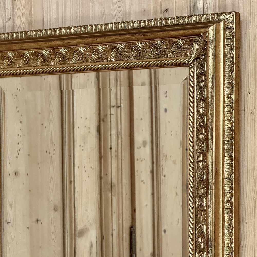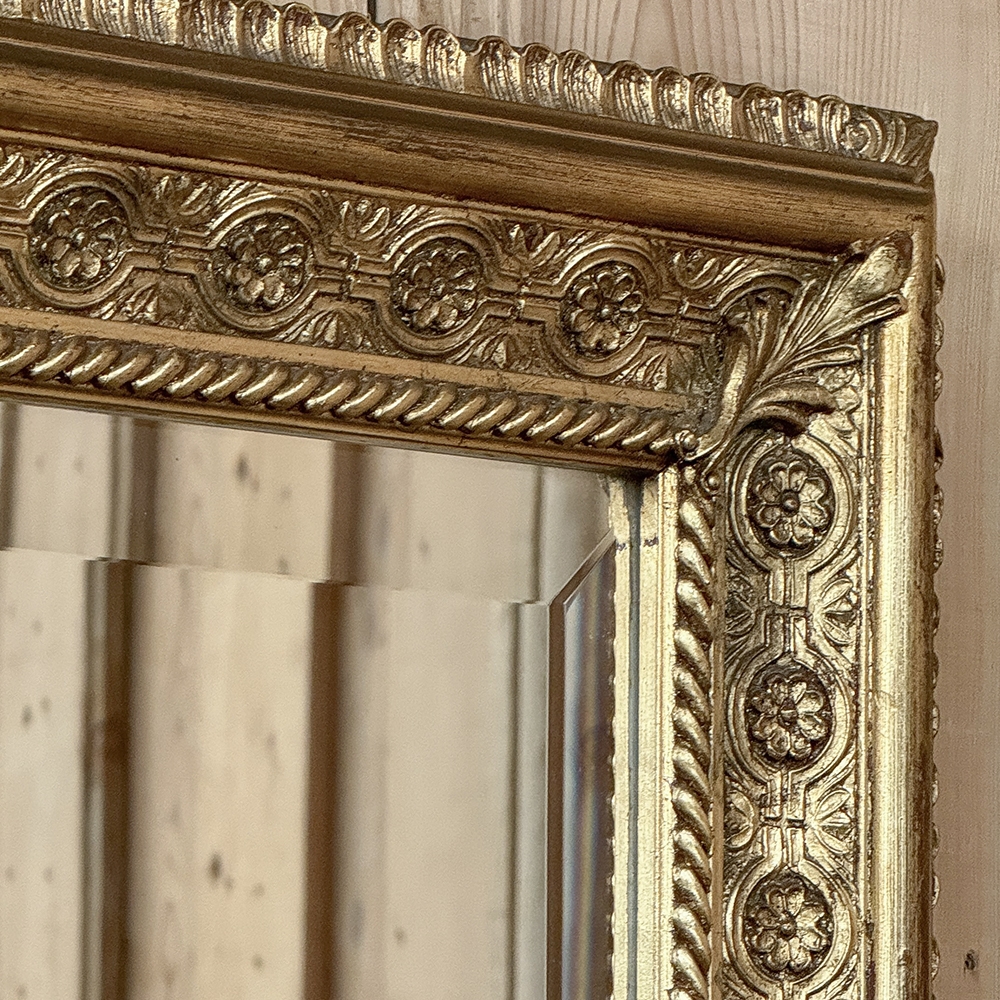 French Louis XVI Giltwood Mirror features a classical design all around so that it can be mounted vertically or horizontally. Perfect for bathrooms, bedrooms, or cozy niches, the motif is the timeless Greek coin with rosettes framed by egg & dart around the outer edge and spiral roping just outside the beveled glass mirror itself.
