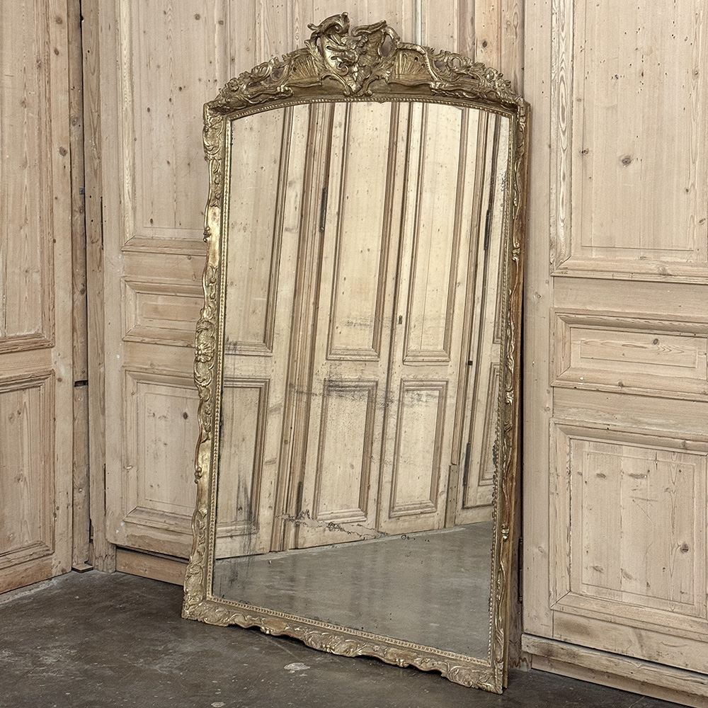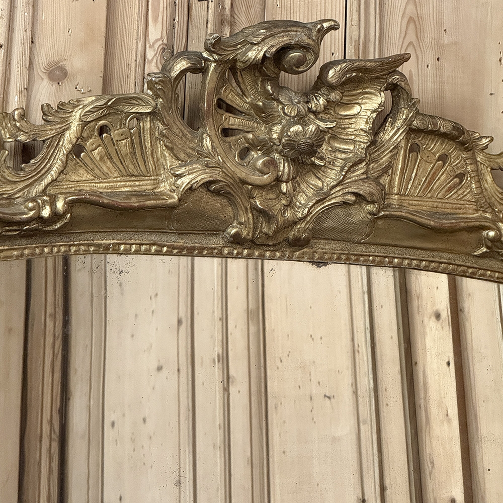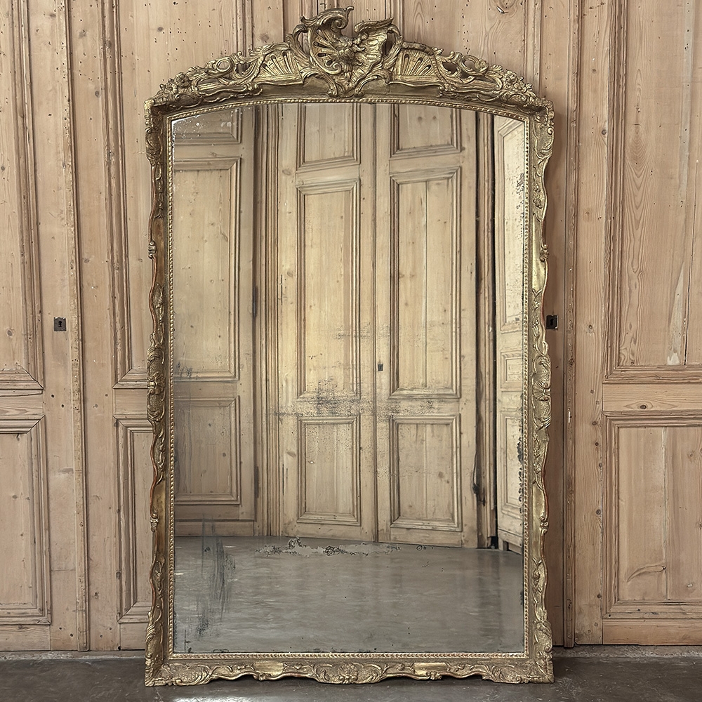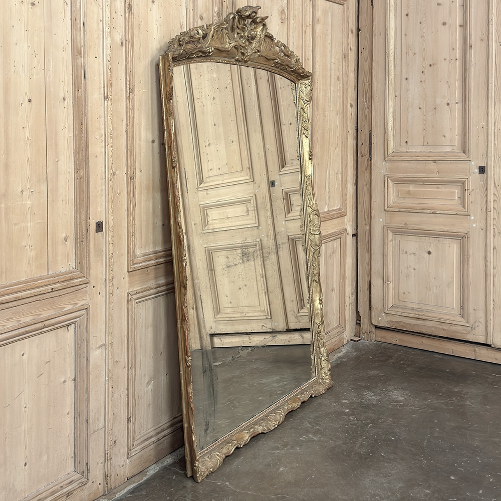 Grand 19th Century French Napoleon III Period Giltwood Mantel ~ Floor Mirror is a magnificent expression of the Rococo style, one of the many historical styles that were revived during the reign of the last Emperor of France! Standing over six feet in height, it can be used on the floor or atop a mantel with a high ceiling. The frame feature intricate naturalistic contours and decorative elements drawn from nature. The top of the frame is shaped in a gentle arch and features the most detail and depth of motif. The gilded finish has achieved a lovely patina over the century and a half, and the mirror appears to be original. A new backing was installed prior to our acquisition to protect the original silvering.