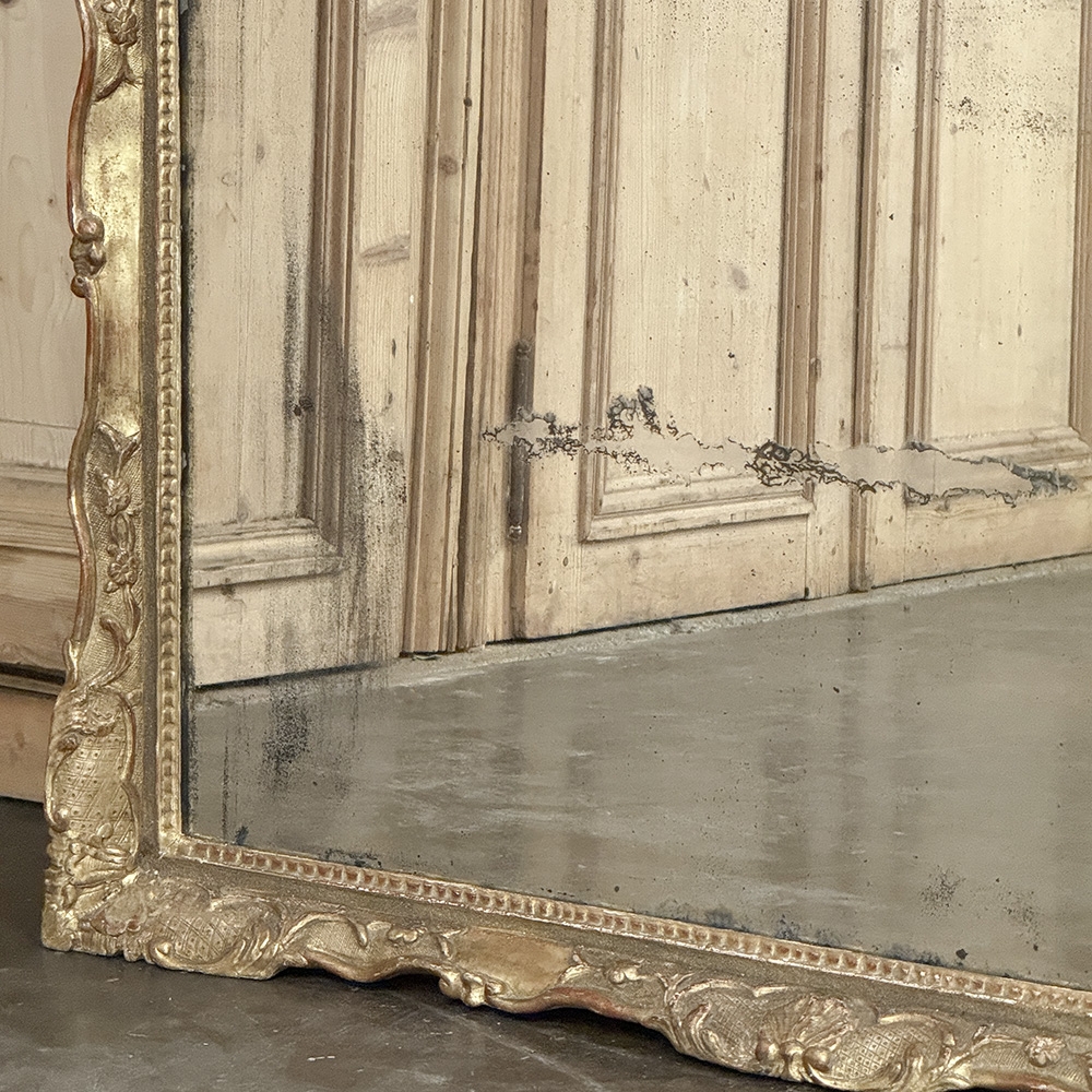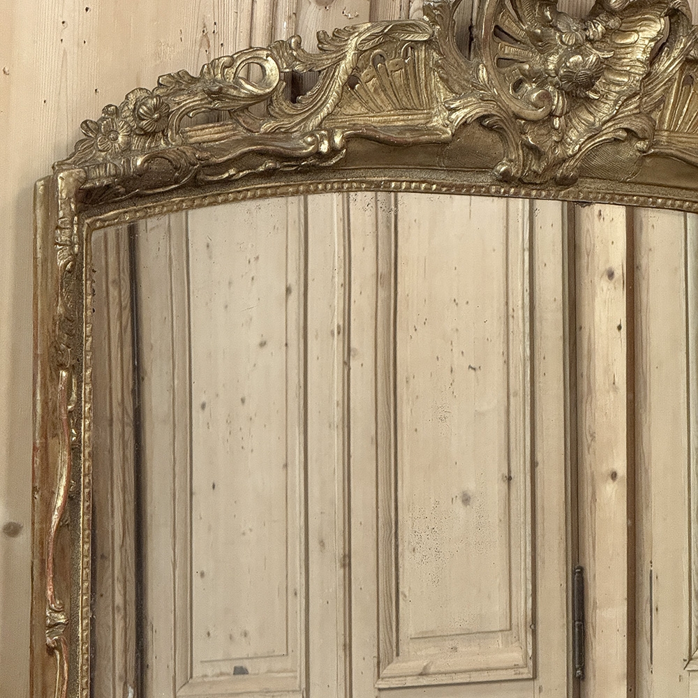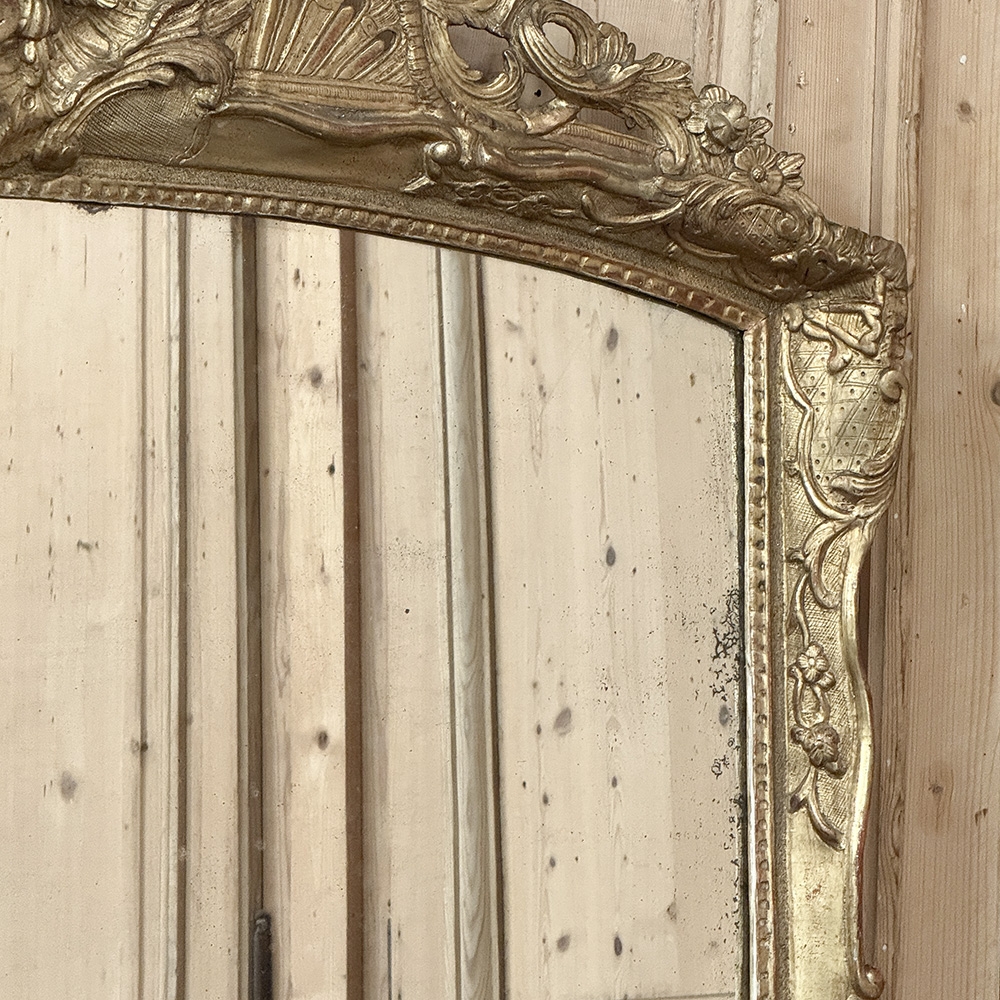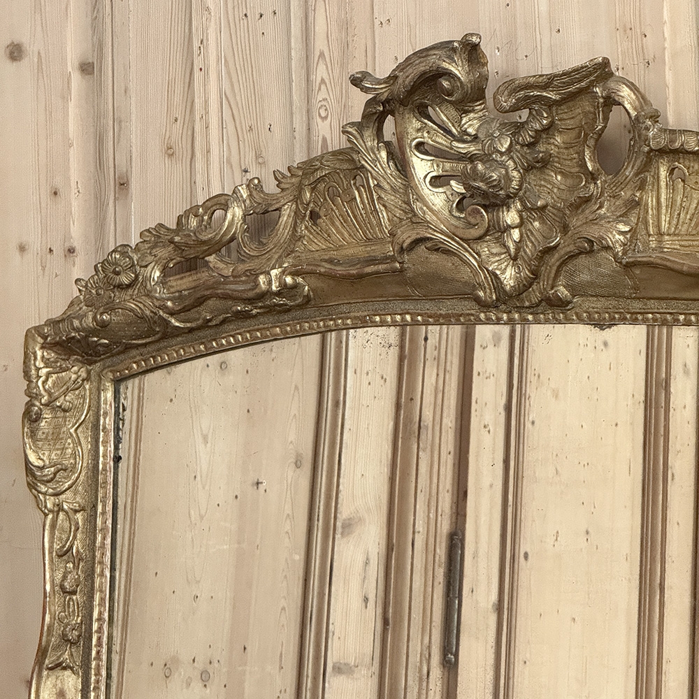 Grand 19th Century French Napoleon III Period Giltwood Mantel ~ Floor Mirror is a magnificent expression of the Rococo style, one of the many historical styles that were revived during the reign of the last Emperor of France! Standing over six feet in height, it can be used on the floor or atop a mantel with a high ceiling. The frame feature intricate naturalistic contours and decorative elements drawn from nature. The top of the frame is shaped in a gentle arch and features the most detail and depth of motif. The gilded finish has achieved a lovely patina over the century and a half, and the mirror appears to be original. A new backing was installed prior to our acquisition to protect the original silvering.