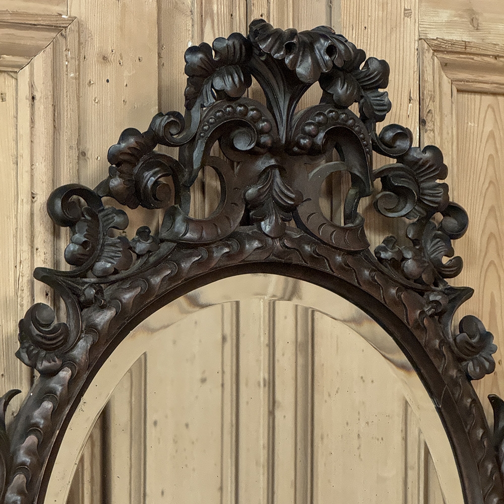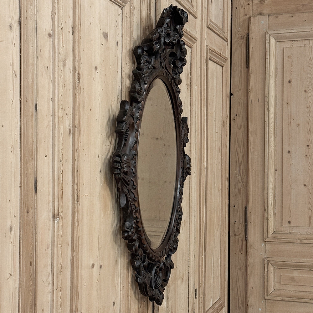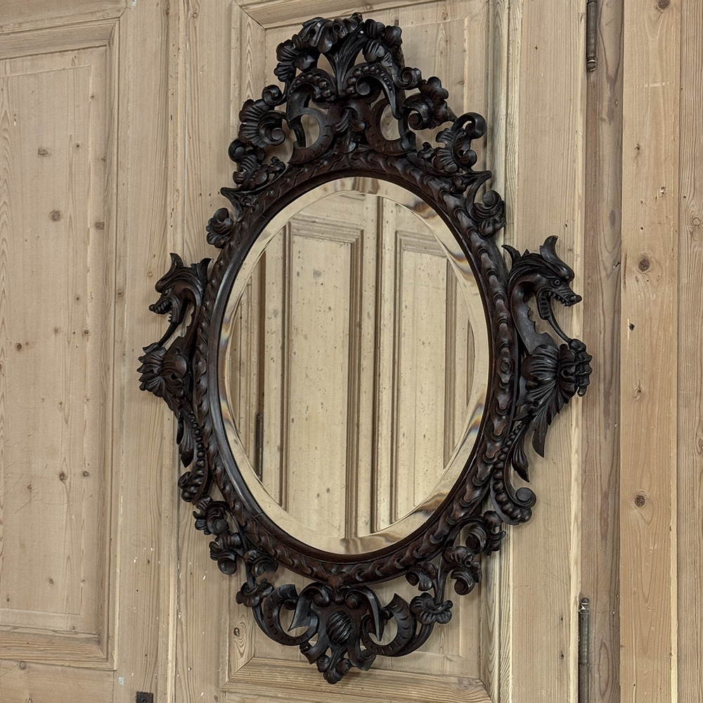 A richly detailed Renaissance Revival mirror dating from the late 19th century into the early 20th century, reflecting the renewed fascination with historic European design that flourished during this period. The oval beveled glass is framed by an intricately hand-carved surround, featuring stylized dragons emerging from scrolling foliage ~ decorative rather than literal, their forms interpreted through the romantic lens of revival craftsmanship.