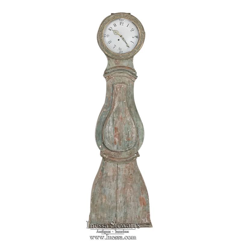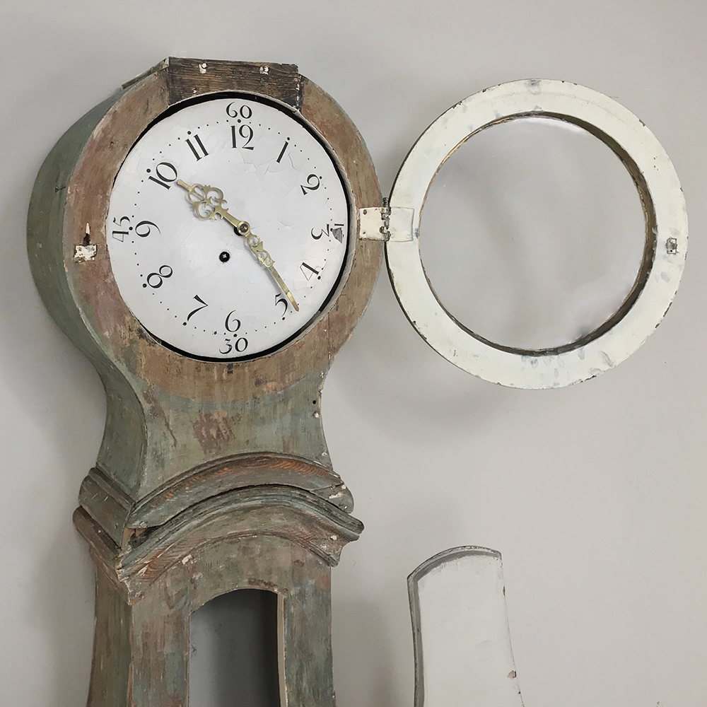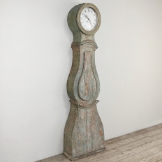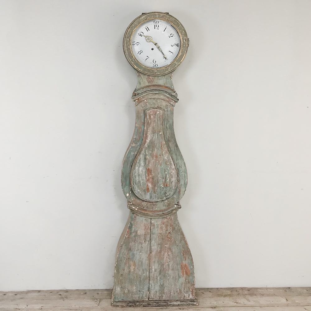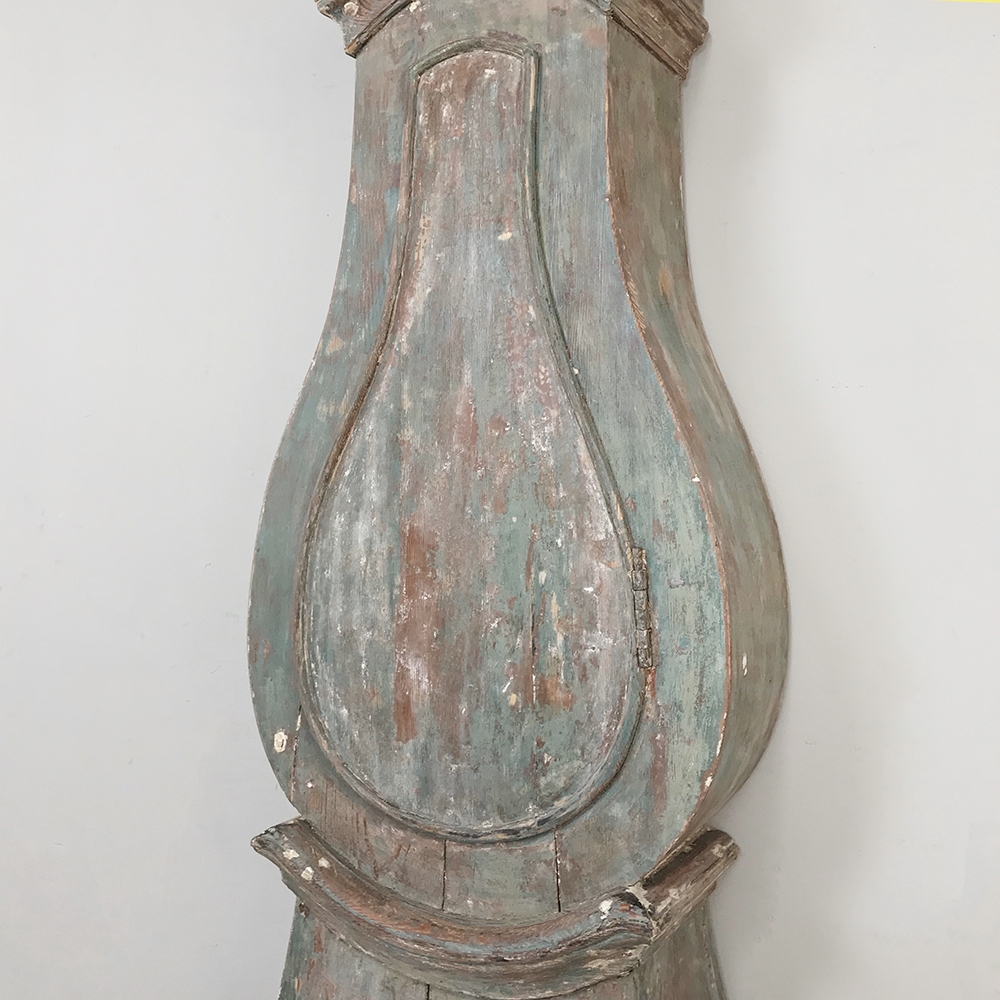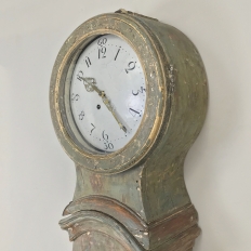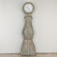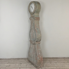 18th Century Swedish Painted Long Case Clock reflects a tailored architecture and distressed painted finish that is ideal for the casual decor. Circular clock face presides over the teardrop center section which contains the pendulum, with a flared base for elegant stability.