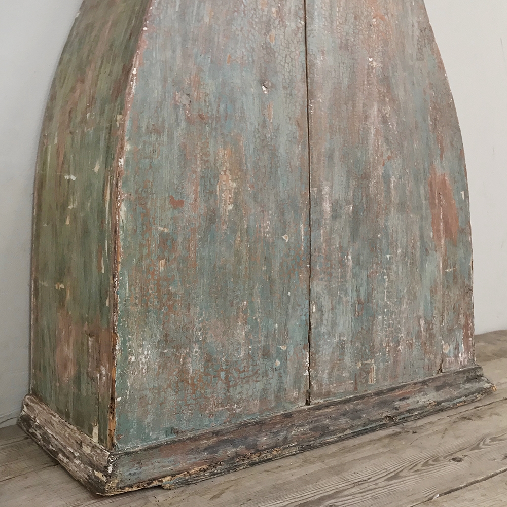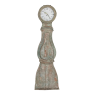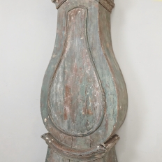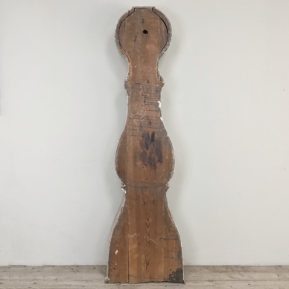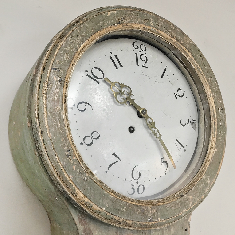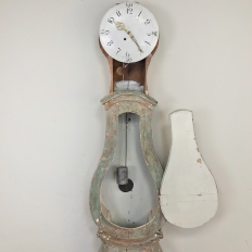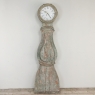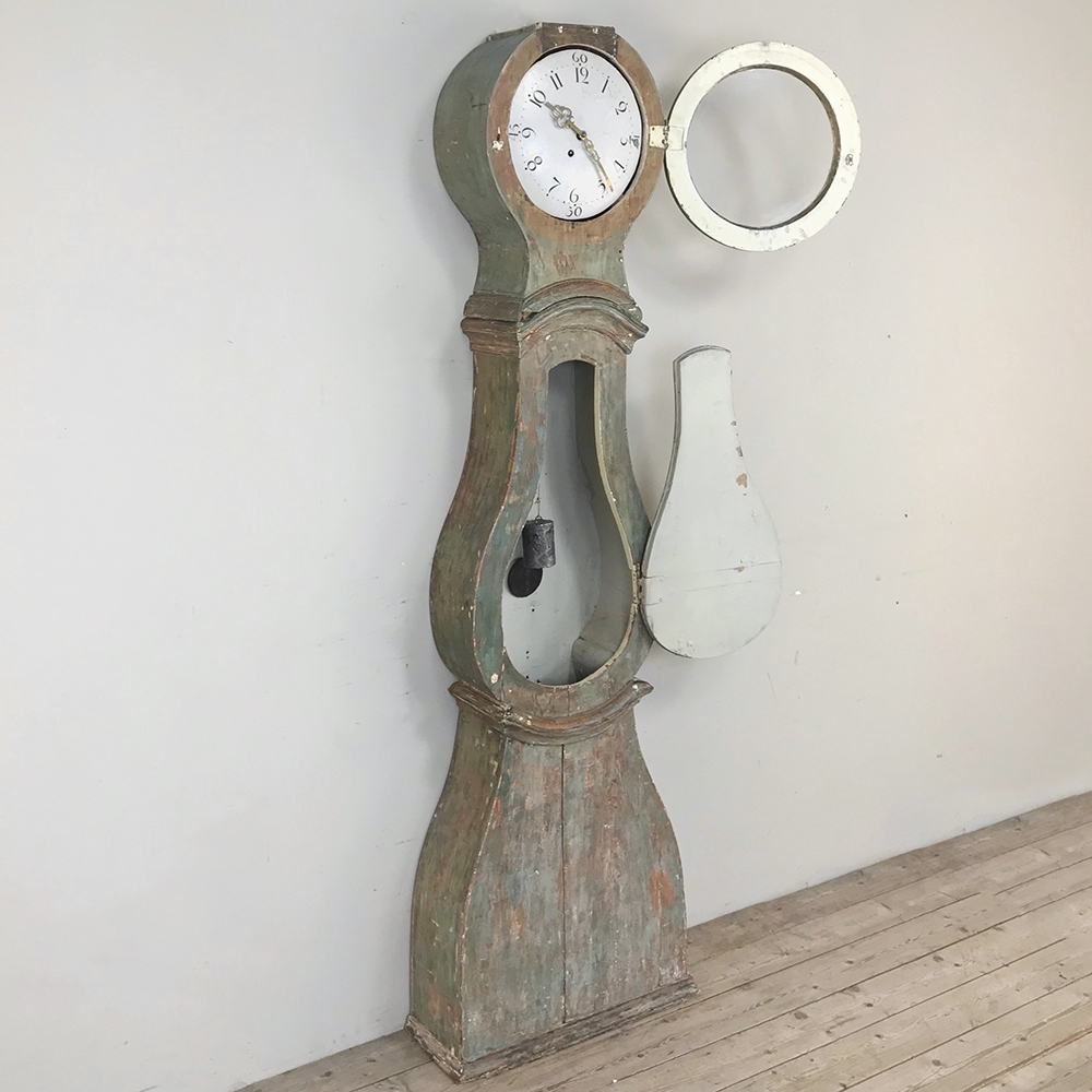 18th Century Swedish Painted Long Case Clock reflects a tailored architecture and distressed painted finish that is ideal for the casual decor. Circular clock face presides over the teardrop center section which contains the pendulum, with a flared base for elegant stability.