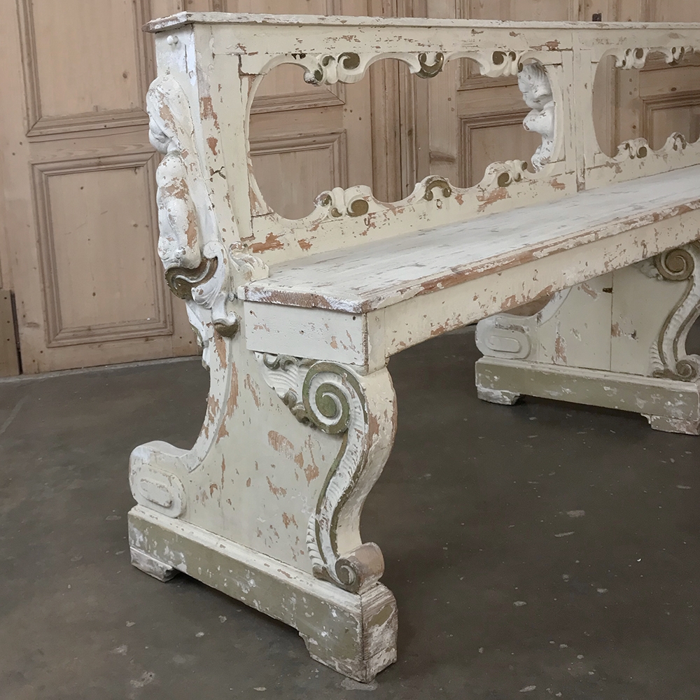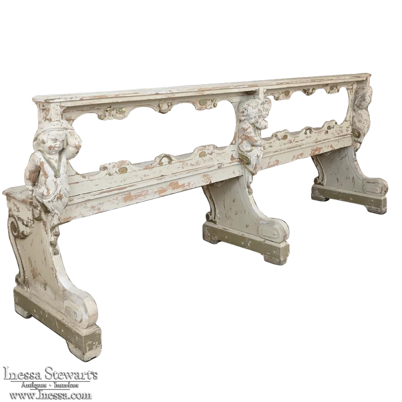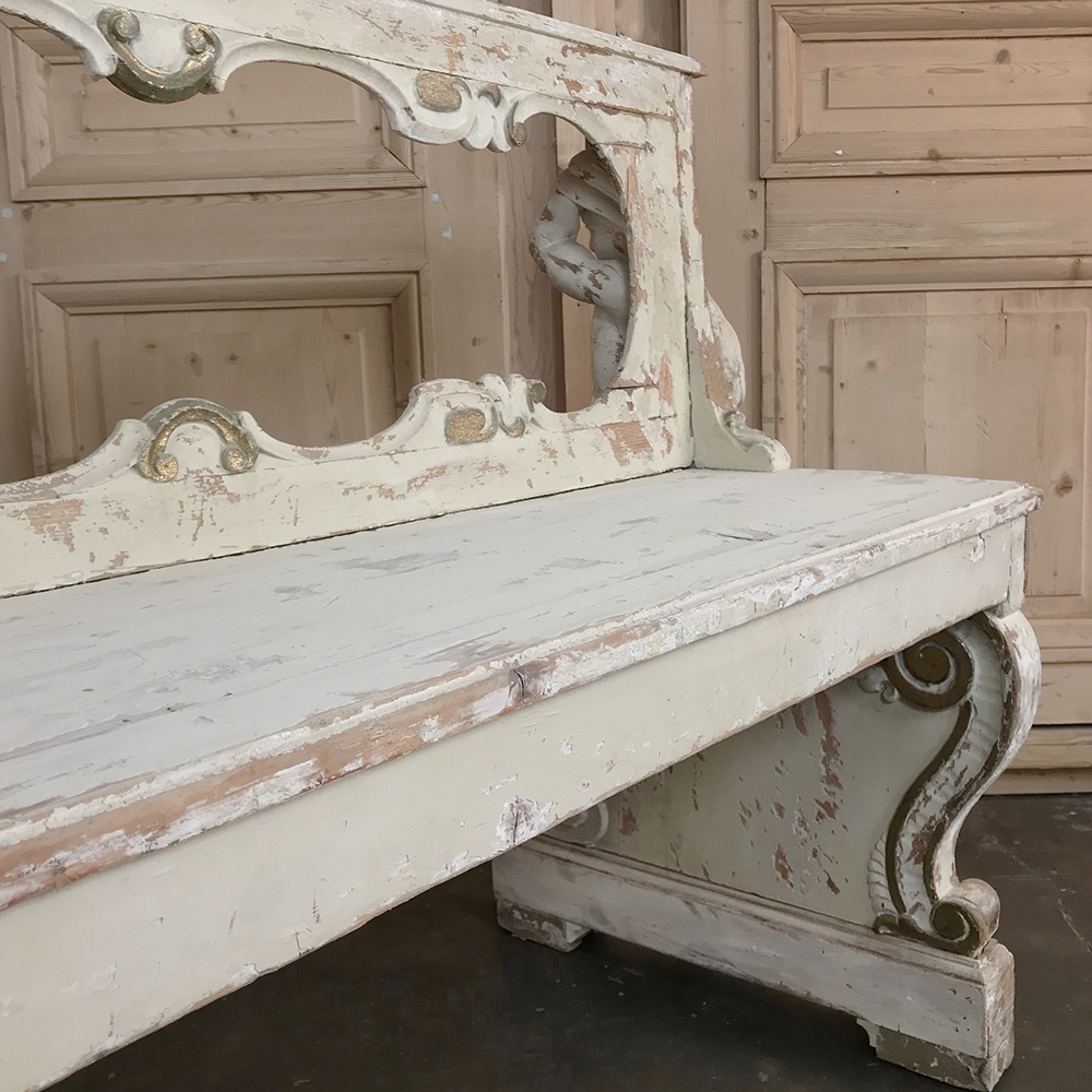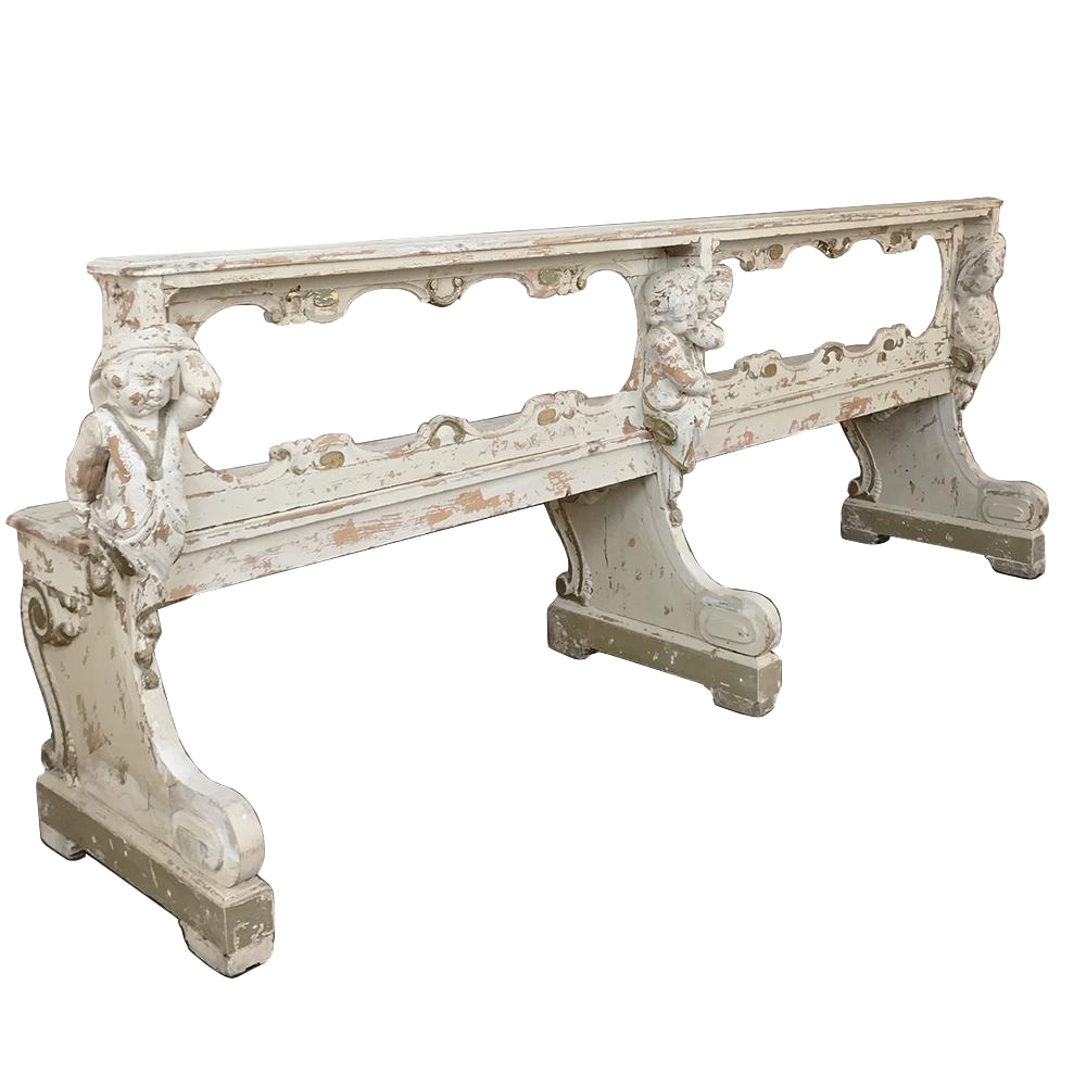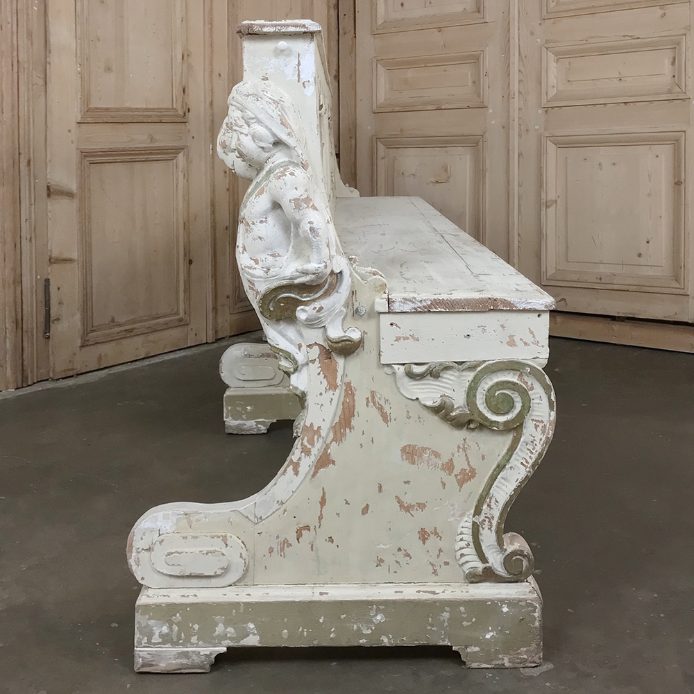 19th Century Italian Painted Bench with Angels features incredible hand-carved sculptures of angels on each end and at the middle, originally designed as a church pew for an opulent private chapel. Distressed painted finish adds a pleasing touch. Note the Baroque influence in the architecture, with boldly scrolled and molded side supports with a matching center support. Openings between the supports are beautifully framed with undulating scrollwork with foliate flourishes. An excellent choice for in front of a large window!
