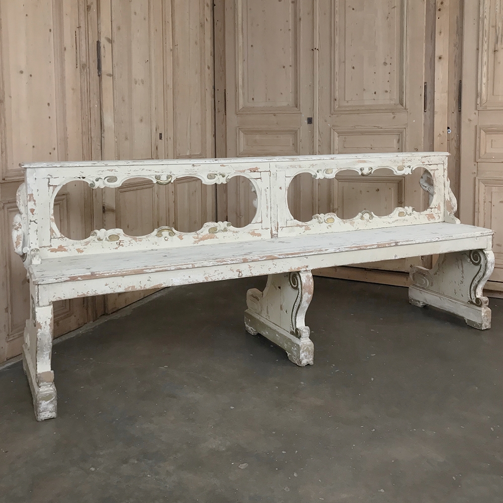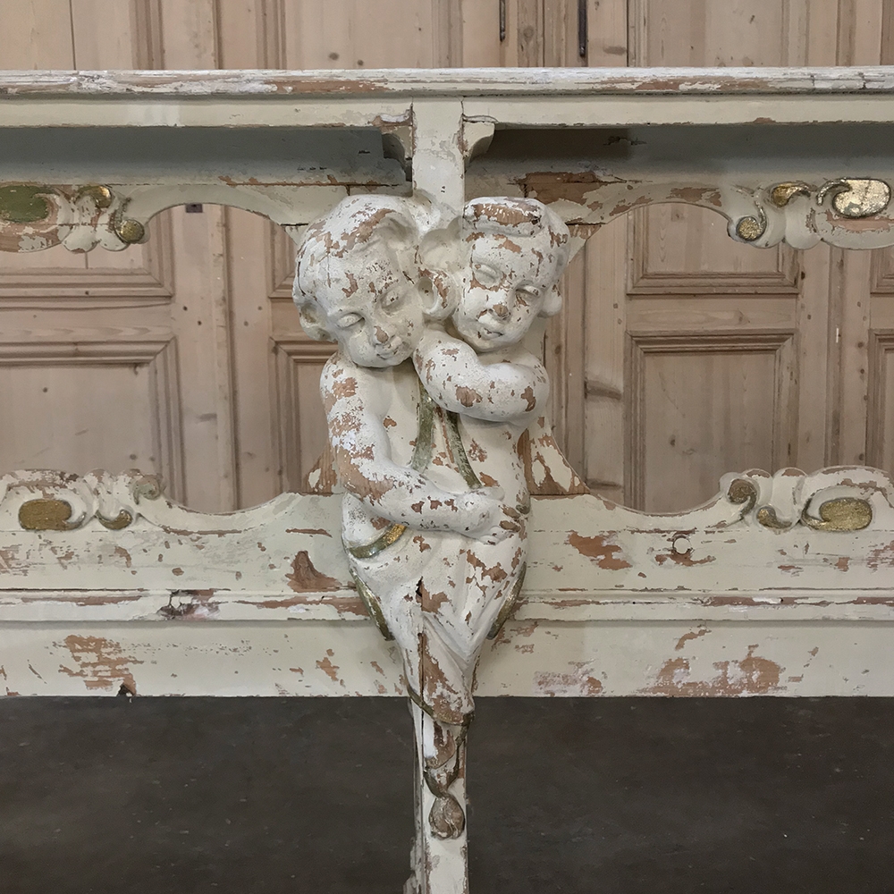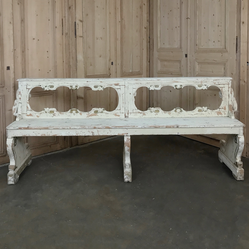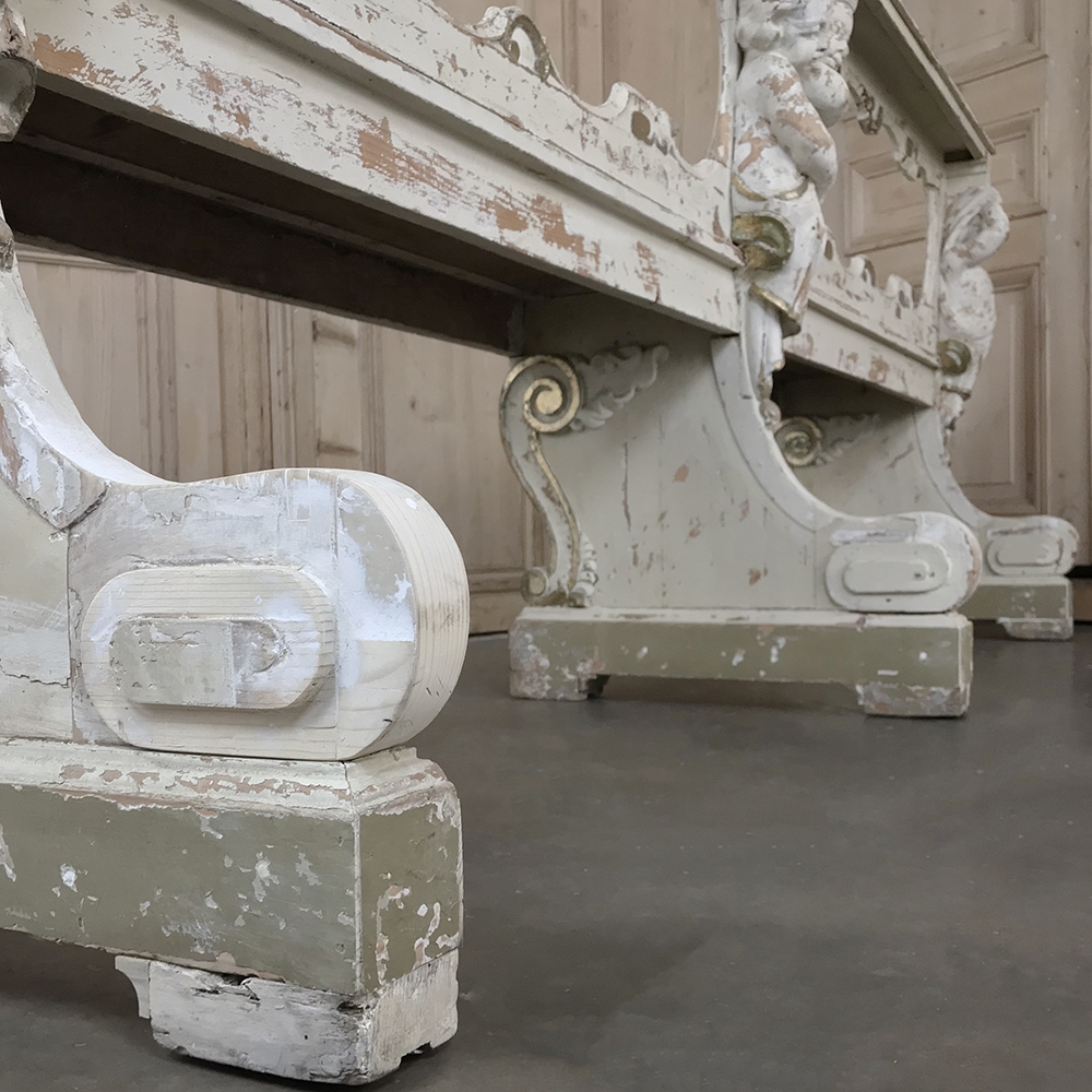 19th Century Italian Painted Bench with Angels features incredible hand-carved sculptures of angels on each end and at the middle, originally designed as a church pew for an opulent private chapel. Distressed painted finish adds a pleasing touch. Note the Baroque influence in the architecture, with boldly scrolled and molded side supports with a matching center support. Openings between the supports are beautifully framed with undulating scrollwork with foliate flourishes. An excellent choice for in front of a large window!