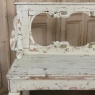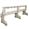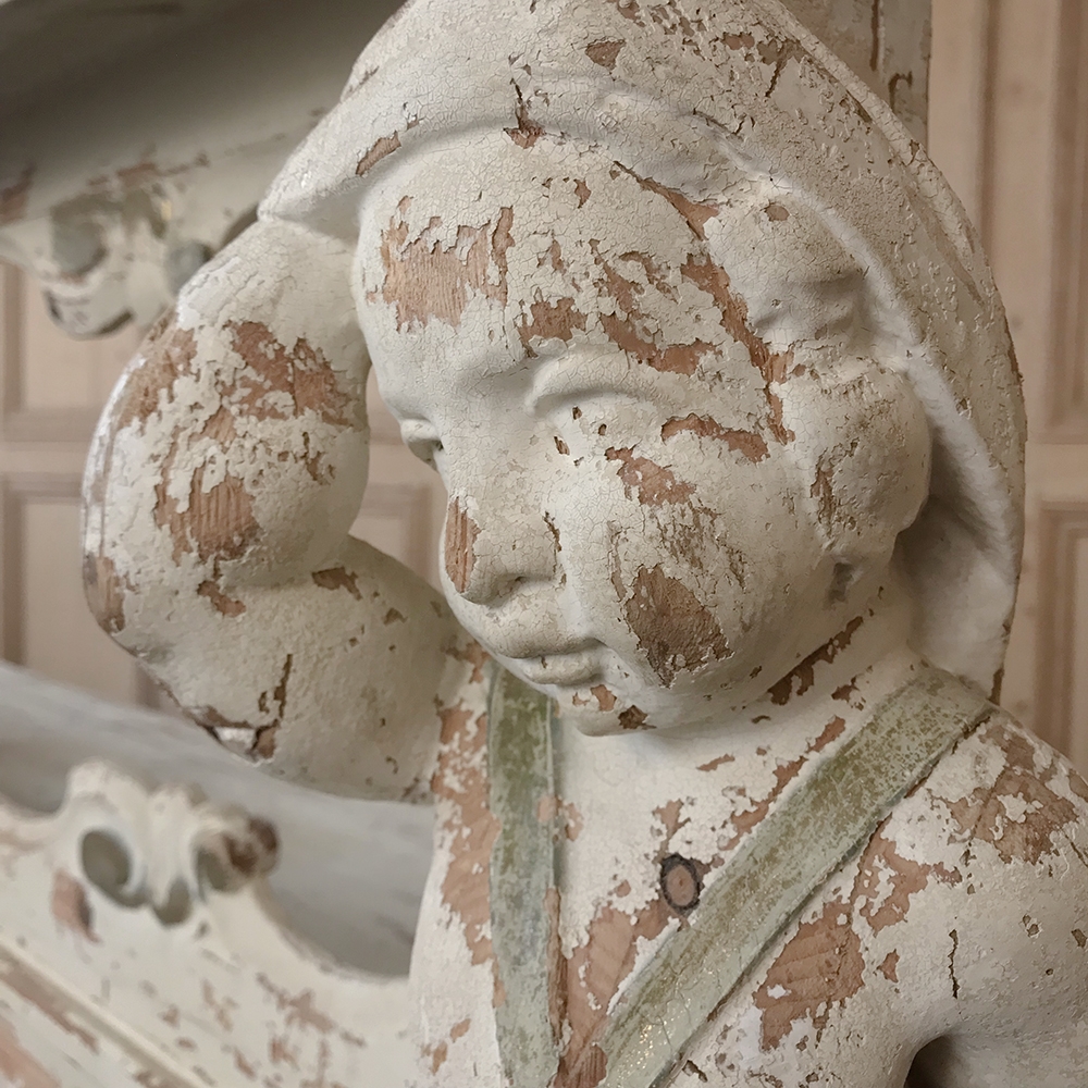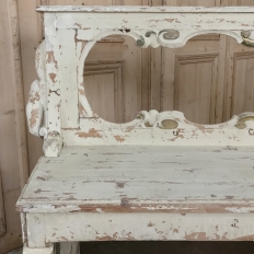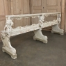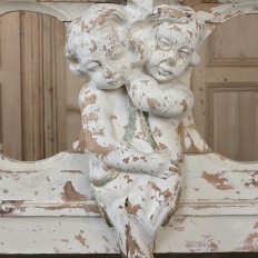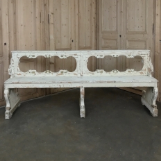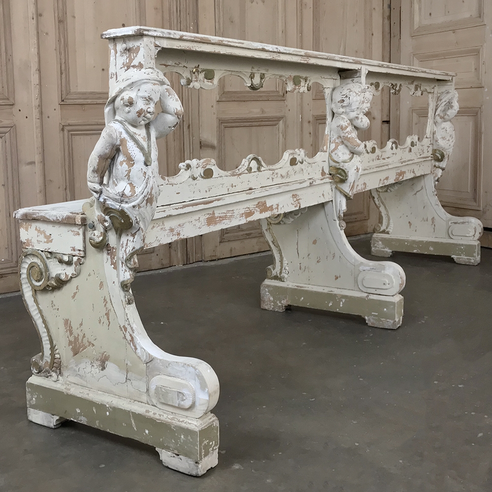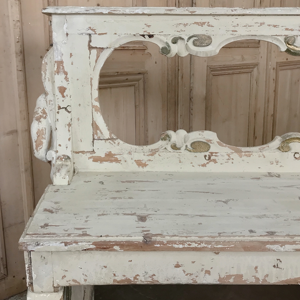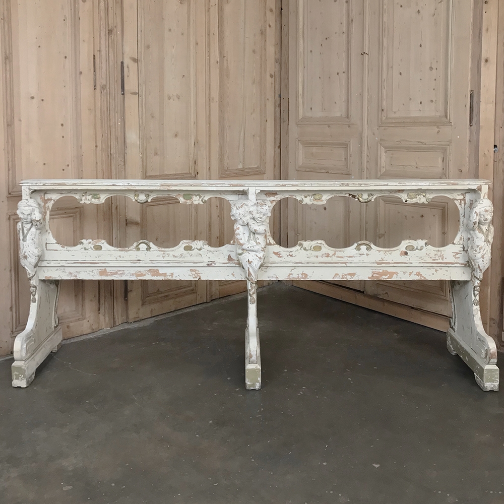 19th Century Italian Painted Bench with Angels features incredible hand-carved sculptures of angels on each end and at the middle, originally designed as a church pew for an opulent private chapel. Distressed painted finish adds a pleasing touch. Note the Baroque influence in the architecture, with boldly scrolled and molded side supports with a matching center support. Openings between the supports are beautifully framed with undulating scrollwork with foliate flourishes. An excellent choice for in front of a large window!