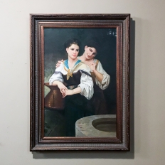 Not antique, but a well-painted copy of a famous work, this charming painting depicts two friends or sisters at the well, perhaps discussing the promise of new love. Remarkable detail abounds in their expressions and raiment. Measures 36 x 24; 46 x 34 overall"Reproduction"