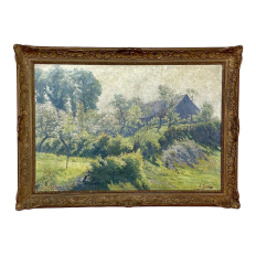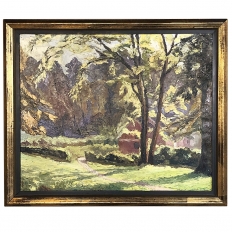 Framed Oil Painting on Canvas by Gaston Wilkin is a splendid work of post-impressionistic technique, with multiple applicators being used to create texture in the oil painting, which depicts a quaint cottage nestled deep in a beautiful yet tranquil forest.  Wilkin has used an interesting palette suggesting a Spring morning, and the work survives in its...