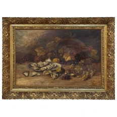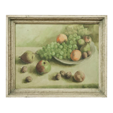 Antique Oil Painting on Canvas by Ferdy Naulaerts (1922-2001) is a classic still life, a genre that has survived for eons with a myriad of interpretations over the centuries.  Here Naulaerts has used a soft palette with emphasis on a subtle green hue, choosing the frame to complement the work.  Nuts and fruits surround a huge cluster of green grapes which...