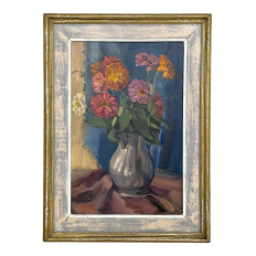 Antique Framed Oil Painting on Canvas by Zollepx is a beautiful work that depicts the classic still life of a pewter pitcher filled with colorful flowers and set by an open window.  Painted in occupied Belgium during World War II, it is a testament to the durability of the human spirit.  A new protective canvas backing was applied recently.  Survives with...