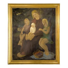 Mid-Century Framed Oil Painting on Canvas by Marcel Dumont ~ dated 1943 is a poignant family portrait of a mother and three daughters in a reflective pose, showing the artist's flair for dramatic emotion.  Entitled "Maternite" on the back, it survives in its original frame, and was painted during the occupation of Liege in what is now Belgium, very near...