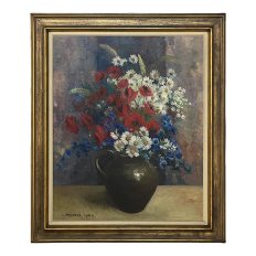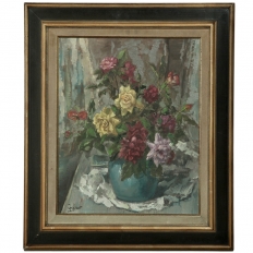Framed Oil Painting on Canvas by Pieter Van Mol (1906-1988) depicts a lovely basket of flowers that has toppled over giving an interesting perspective on the classic still life.  Muted earth tones and two toned gold frame create an earthy palette.  The artist's namesake was a Renaissance era painter of great renown in Europe at the turn of the 17th...